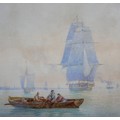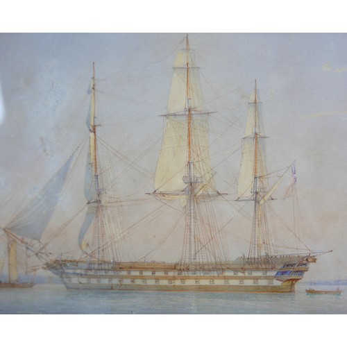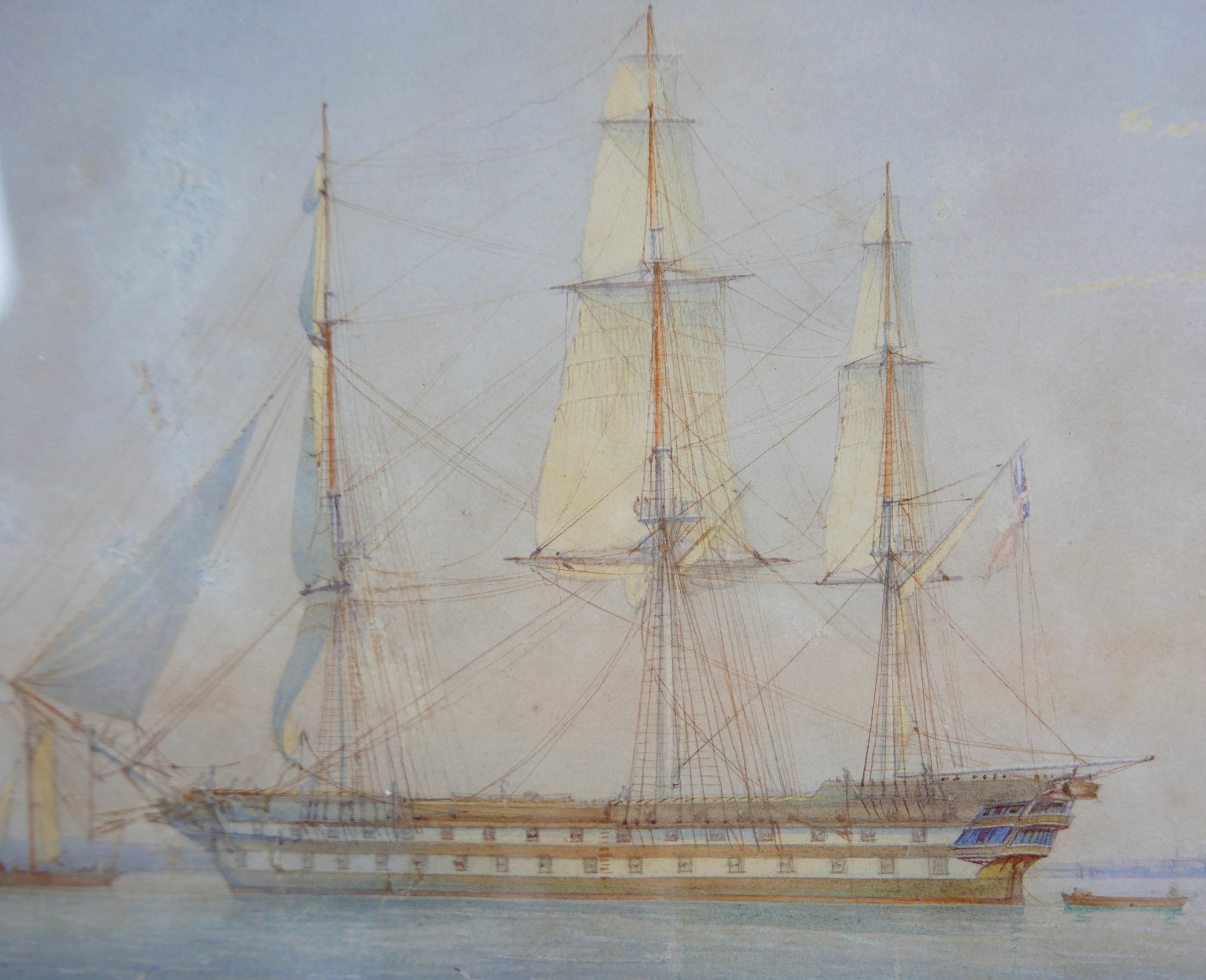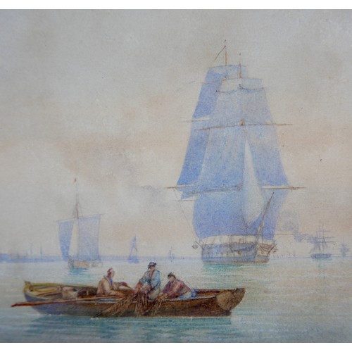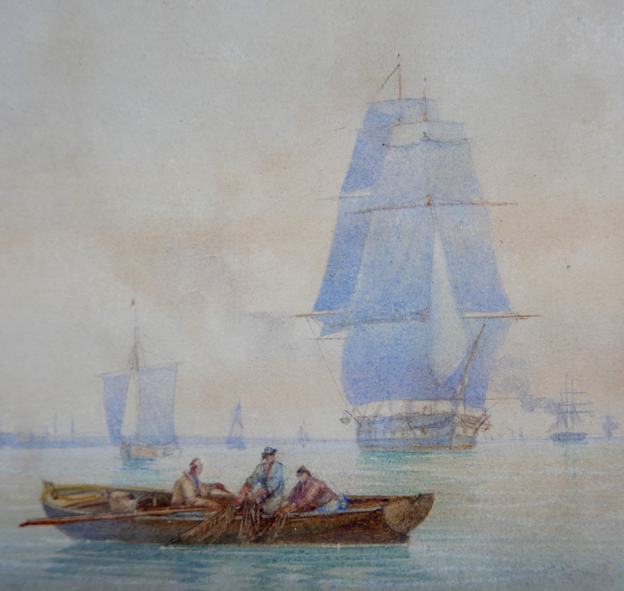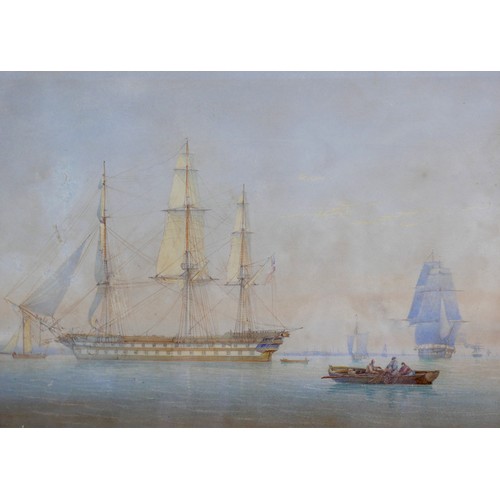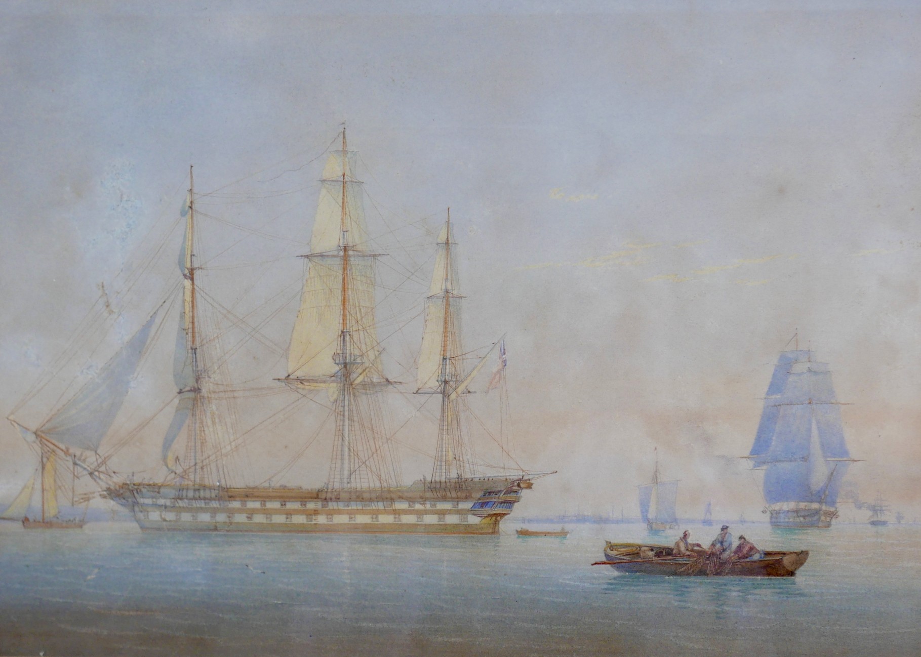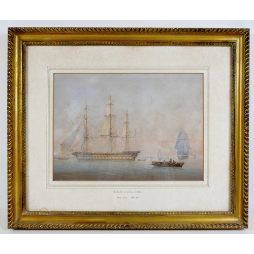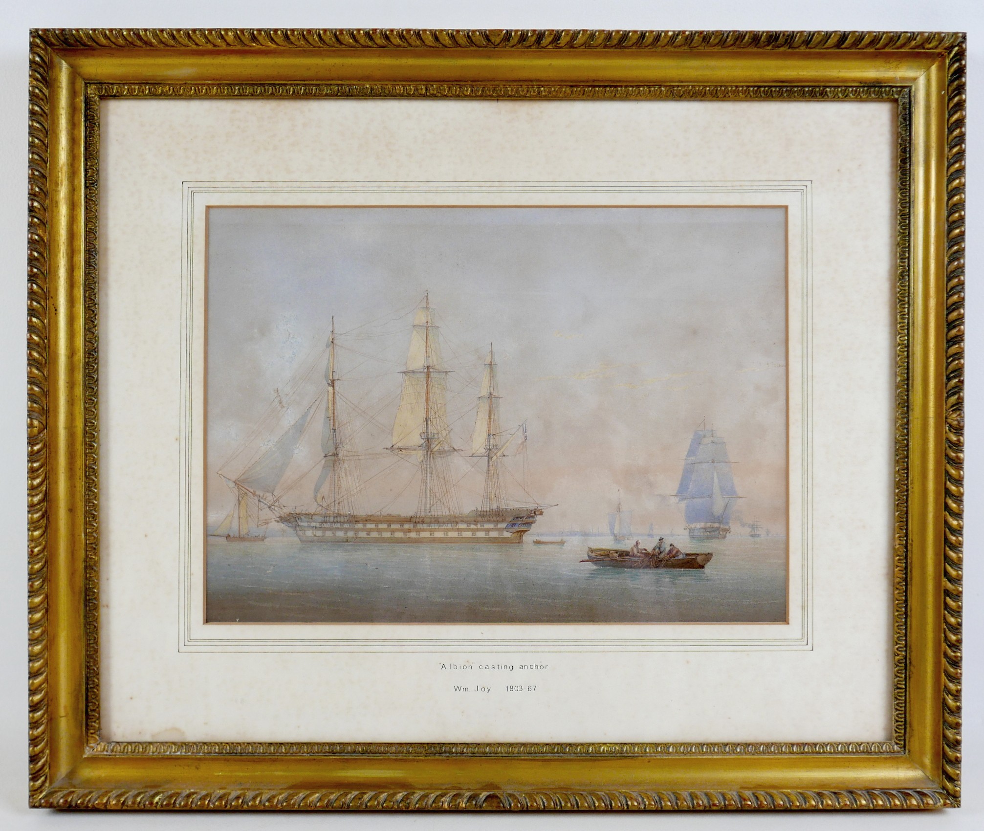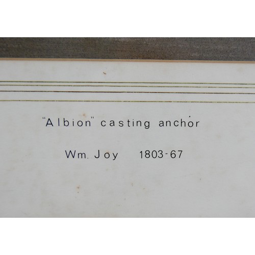 William Joy (British, 1803-1867): ''Albion' casting anchor', depicting a three-masted vessel at anchor with various other shipping, unsigned, attributed to legend on lower mount, 23 by 32.5cm, mounted, glazed and framed, 42 by 50cm.