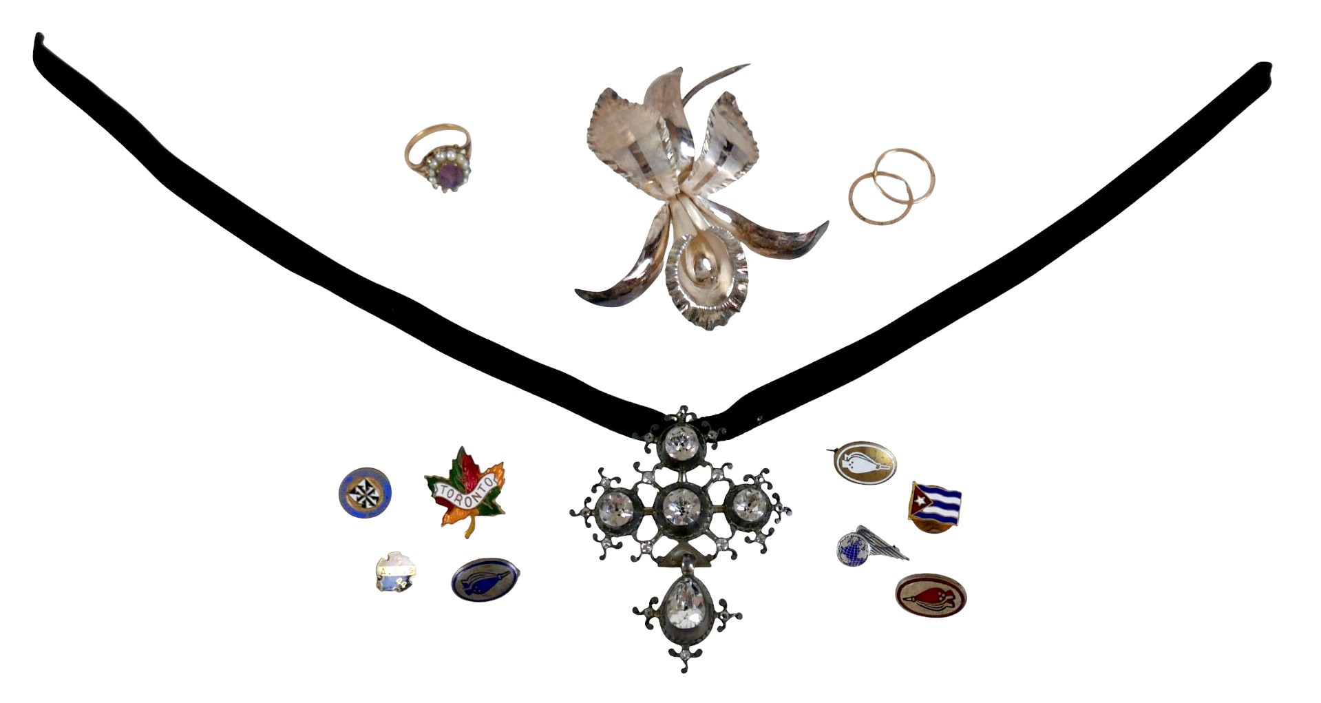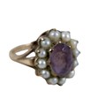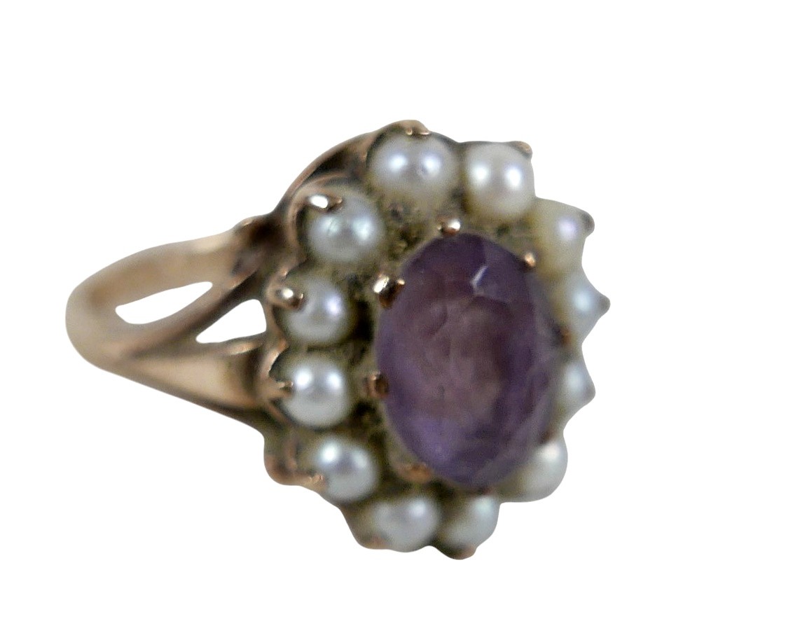 A collection of jewellery, including a 9ct gold dress ring with amethyst style stone and seed pearls, size N/O, 4.3g, two interlocking yellow metal rings, size G, 1.2g, together with a collection of costume jewellery, including a choker with a paste pendant on ribbon, and a silver brooch, assorted badges. (1 bag)