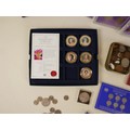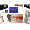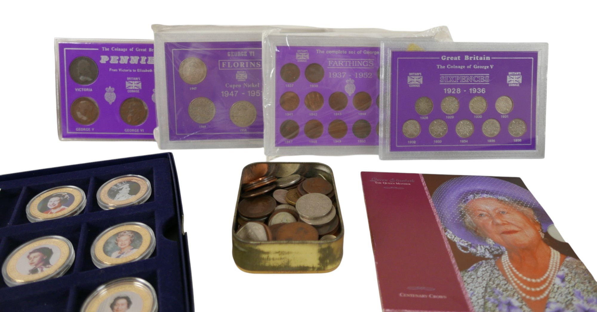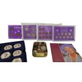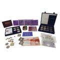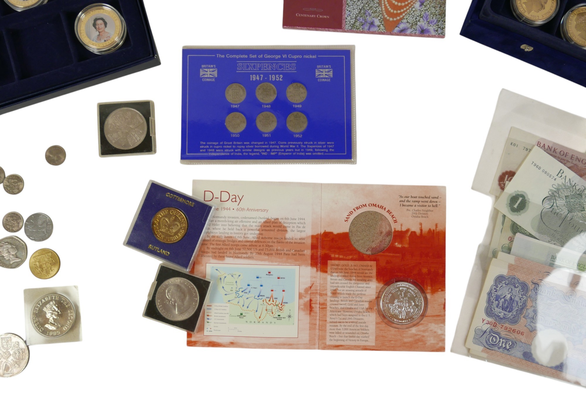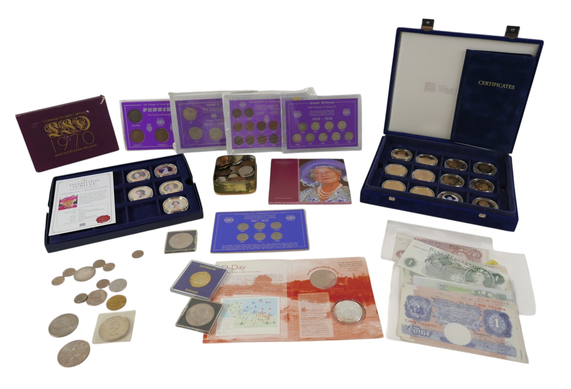 A quantity of coins and banknotes to include GB: three Peppiatt 31 notes, one O'Brien 10 shilling note, 2 O'Brien £1 notes, one Fforde £1 note, four £5 notes Eliz II, plus seventeen gilt Jersey Guernsey Cook Islands fifty pence / one dollars. cased sixpence set 1928-1936, pre-decimal sets, D-Day one dollar, pennies, florins 1947-51, farthings and loose coinage (q 1 bag)