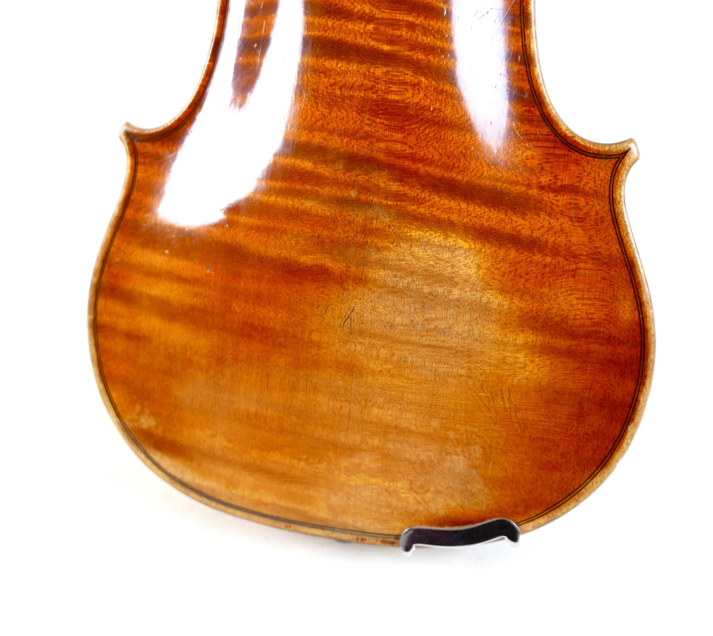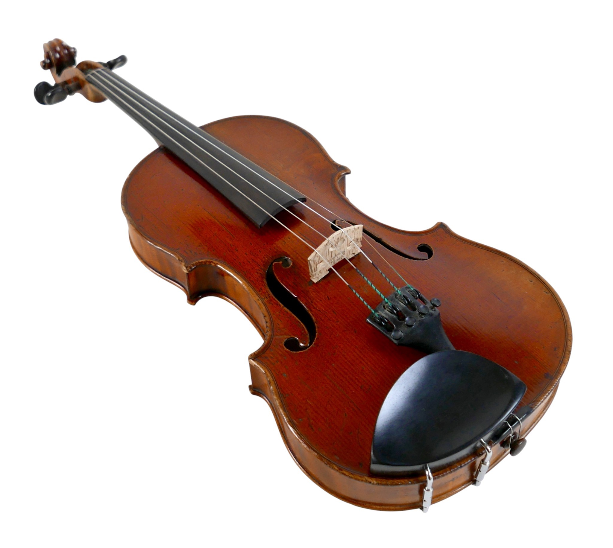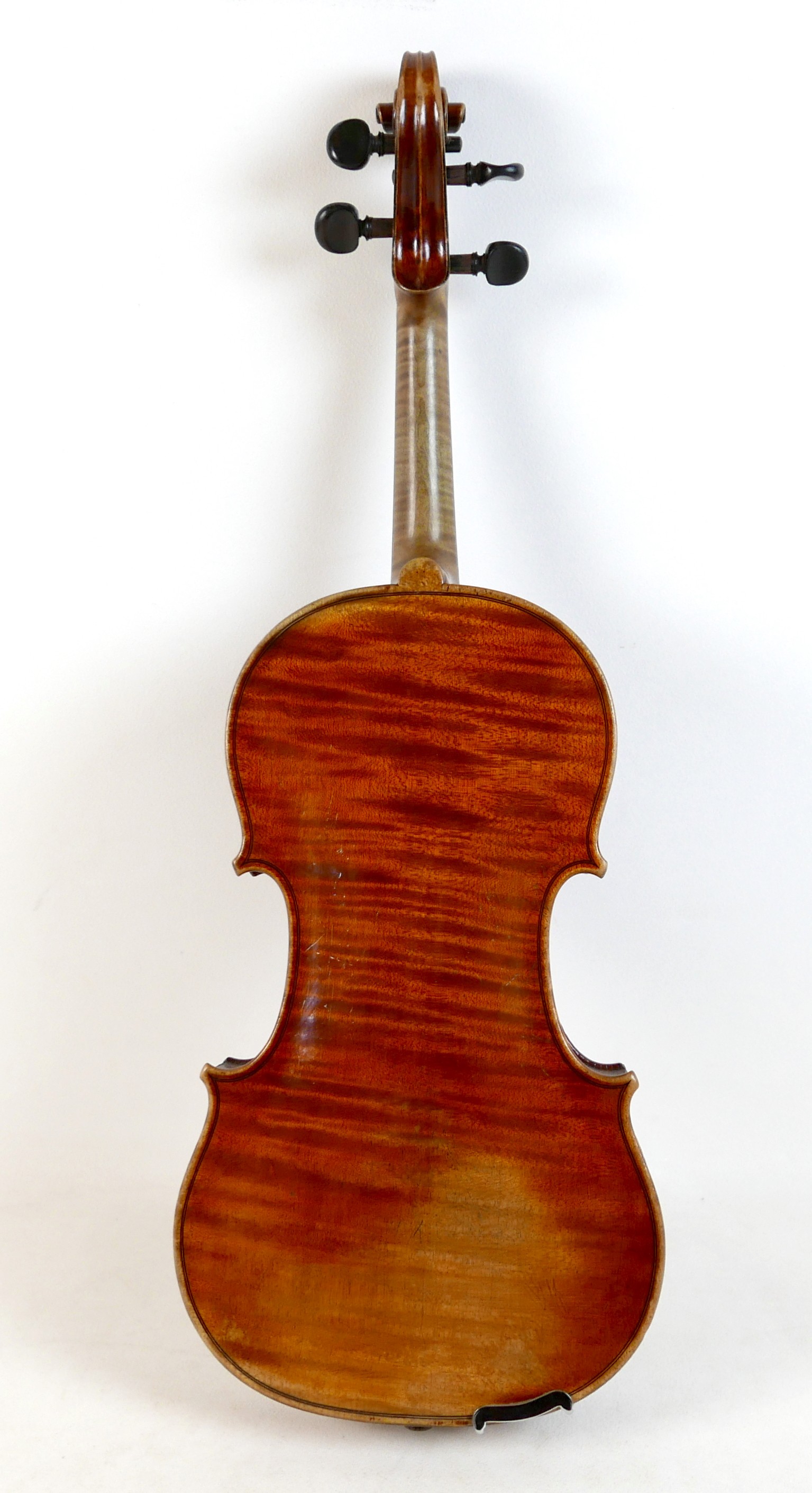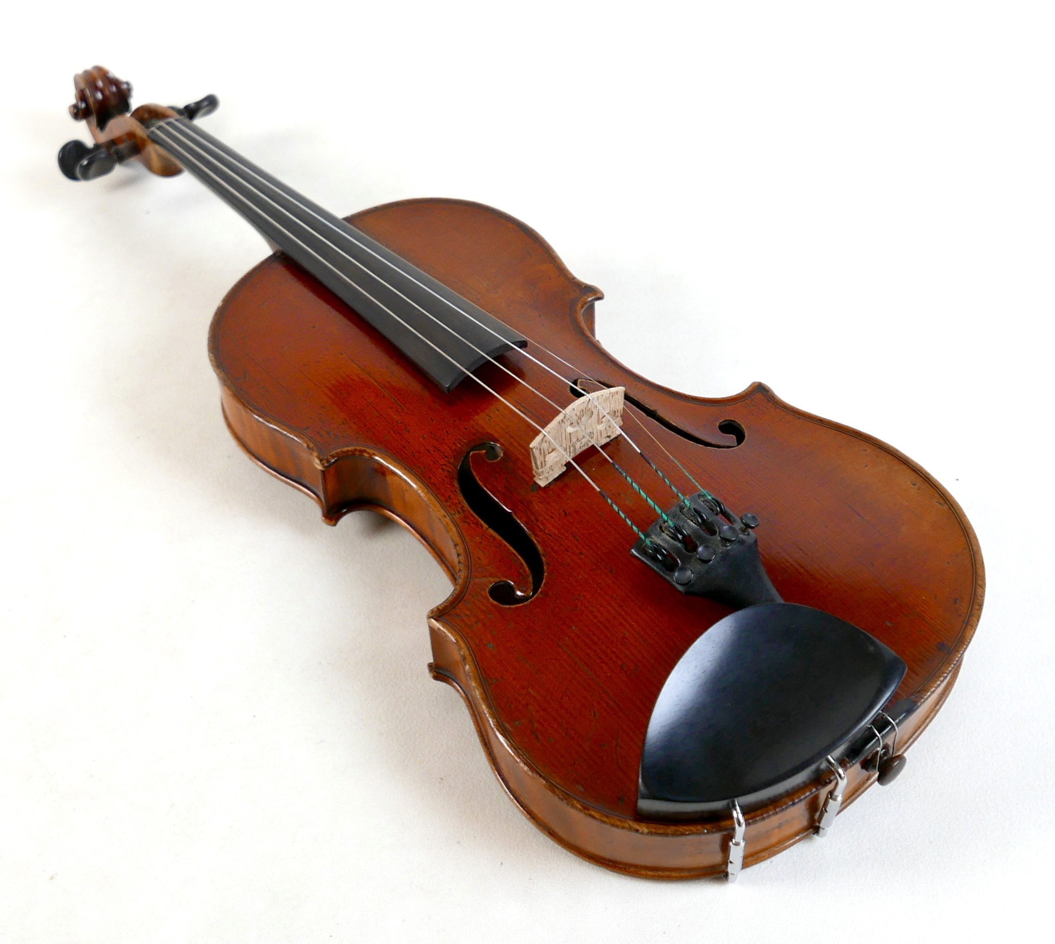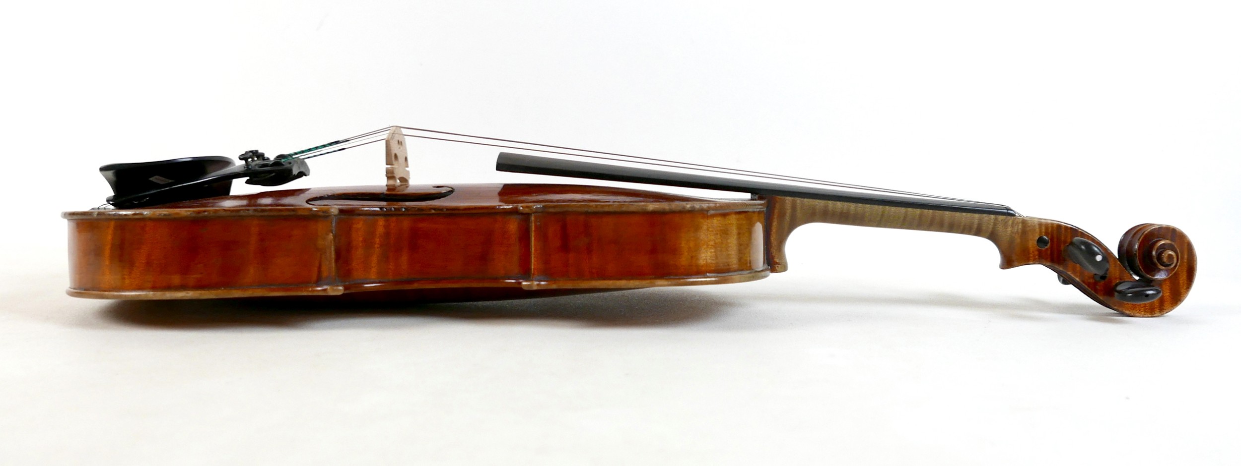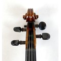 A fine 19th century French violin, with a single piece back, 14" long, bearing a label 'Gand Luthier du Conservatoire de Musique Rue Ctoir des Petits Champs 1620 Paris 1855', possibly a member of the Gand family, with bow stamped 'W-SEITERT', in a brown leather and fully fitted hard carry case.