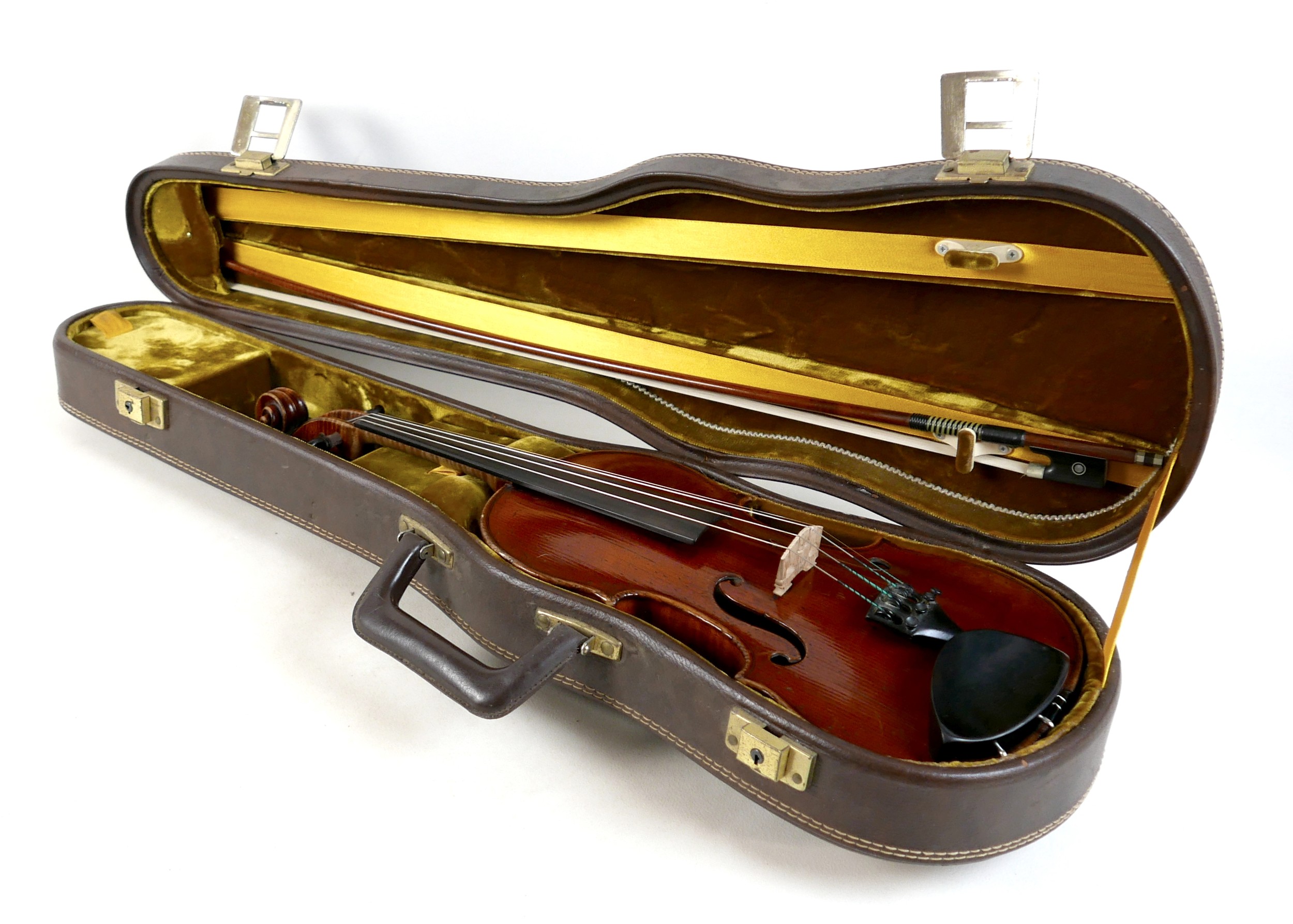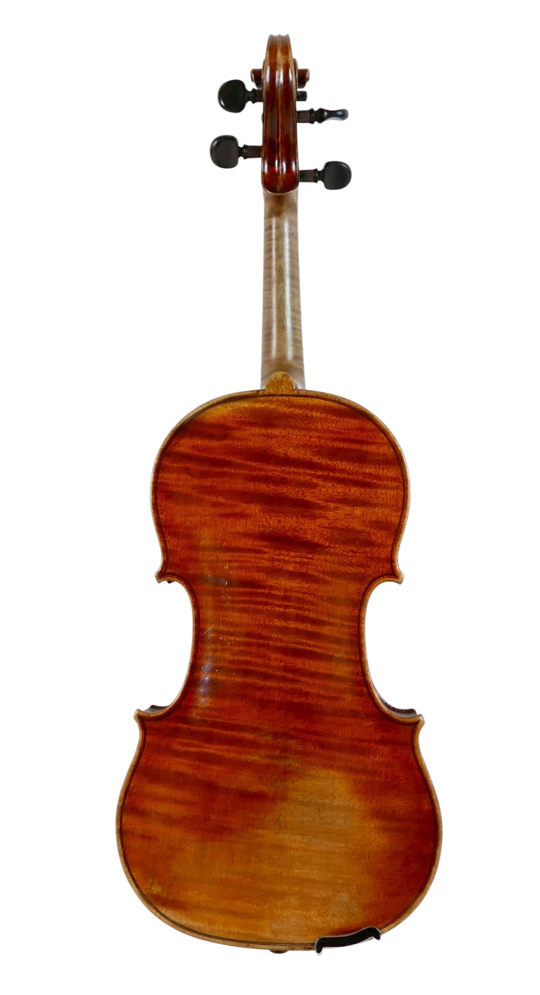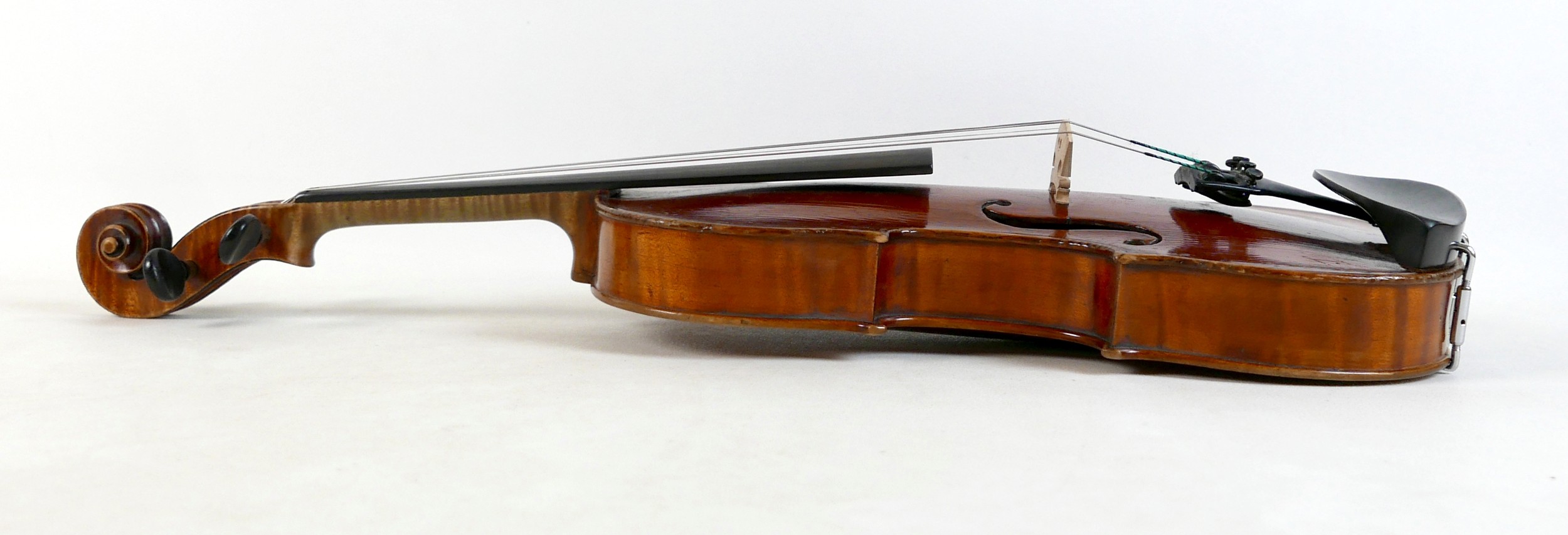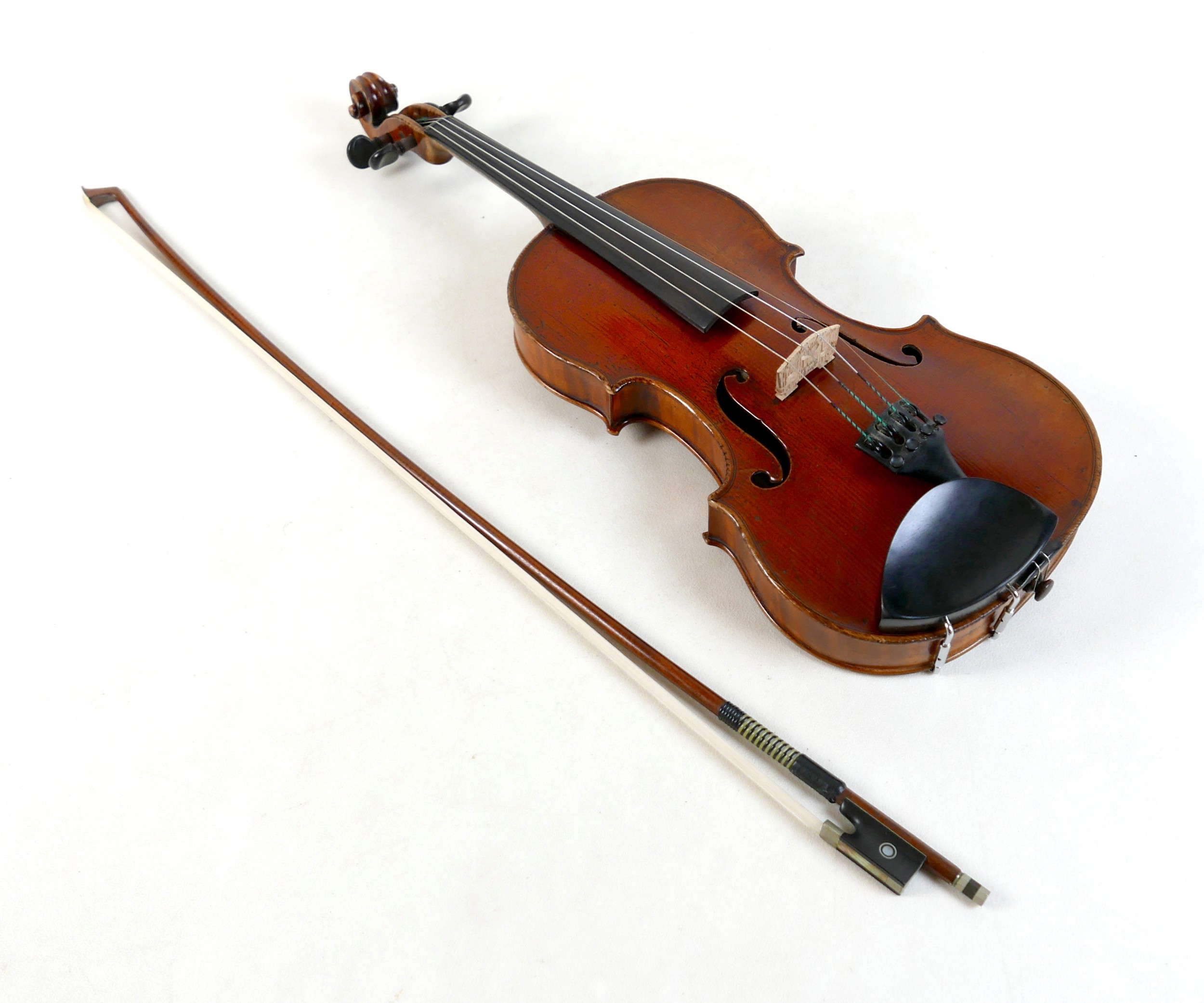 A fine 19th century French violin, with a single piece back, 14" long, bearing a label 'Gand Luthier du Conservatoire de Musique Rue Ctoir des Petits Champs 1620 Paris 1855', possibly a member of the Gand family, with bow stamped 'W-SEITERT', in a brown leather and fully fitted hard carry case.