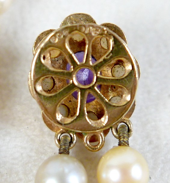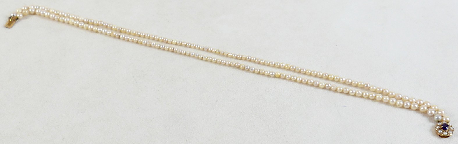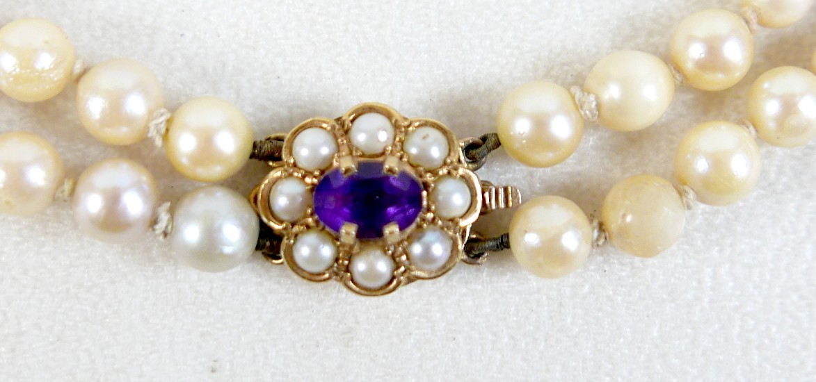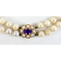 A twin strand pearl necklace with 9ct gold clasp set with faceted amethyst.