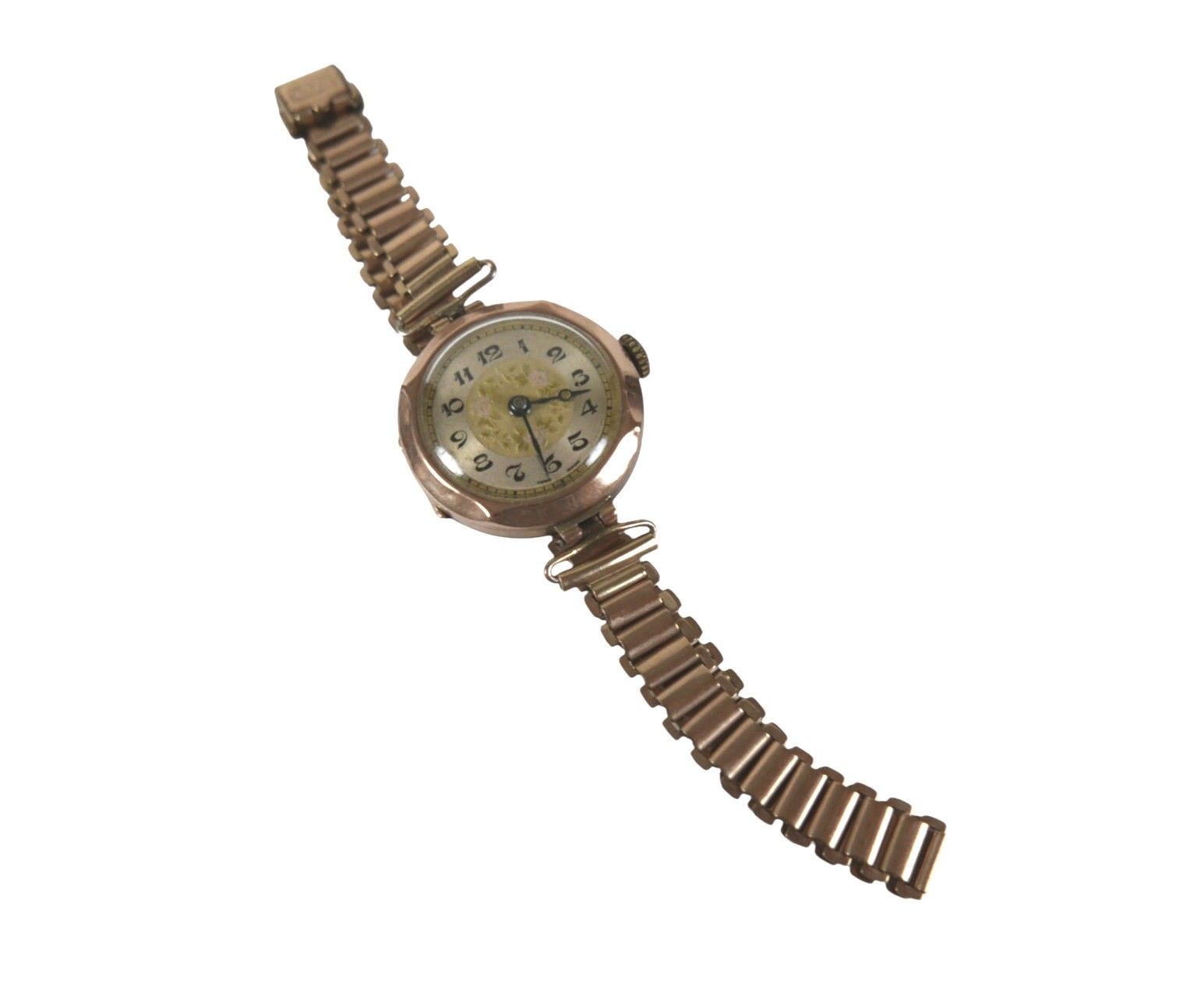 An Art Deco 9ct yellow gold cased lady's wristwatch, with circular silvered chapter ring, gold centre decorated with roses, blued steel hands, Buren 15 jewels movement, case number 494834, Louis Arnould (City Watch Case Company Ltd.), London 1929, case 25mm, on a gold plated Bonklip bracelet strap, 24.1g gross.