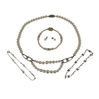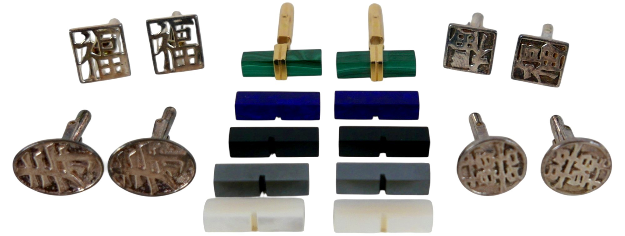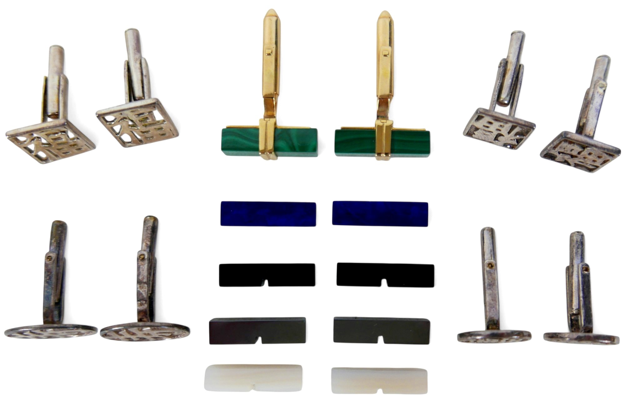 A pair of 18ct yellow gold cufflinks and four pairs of Chinese silver cufflinks, the gold cufflinks with interchangable heads( Lapis Lazuli, Onyx, Hematite and Malachite) silver weight 24.9g, gold weight 7.1g.