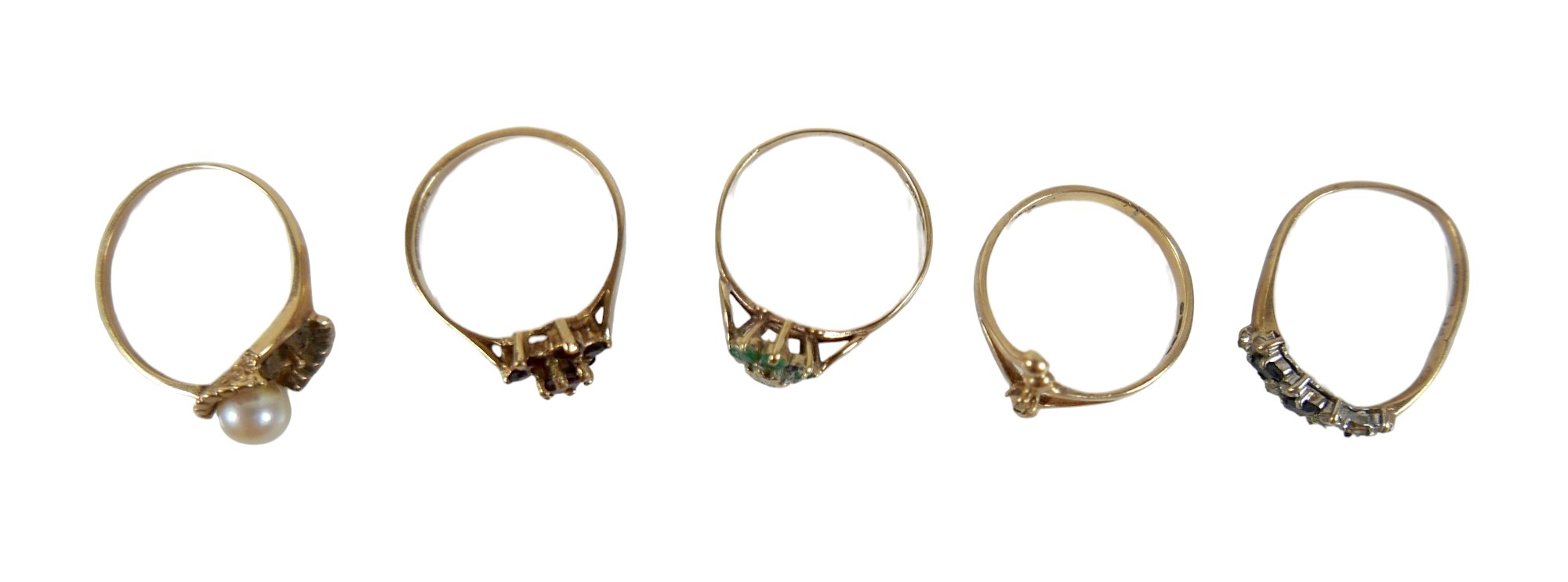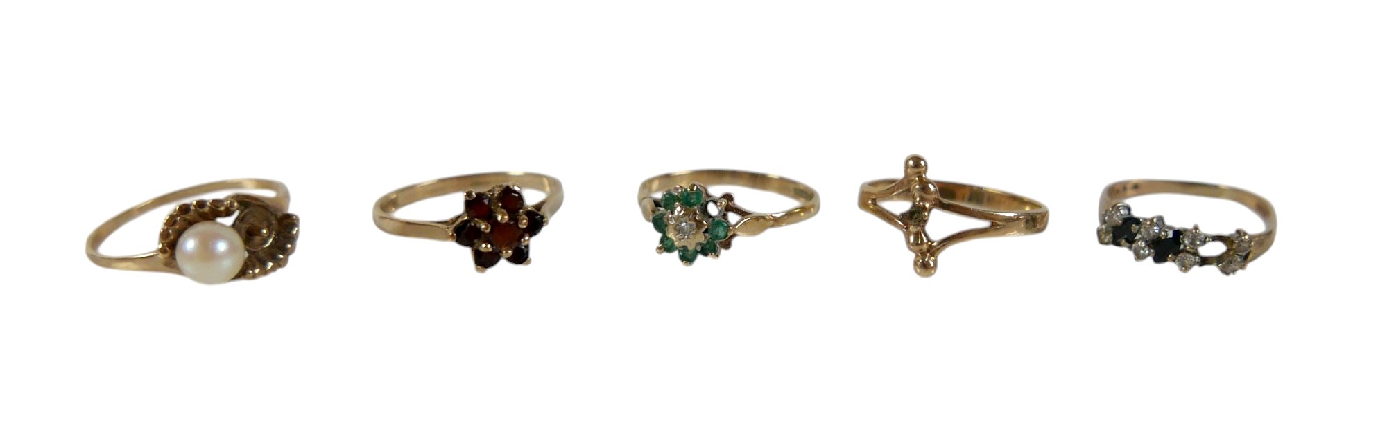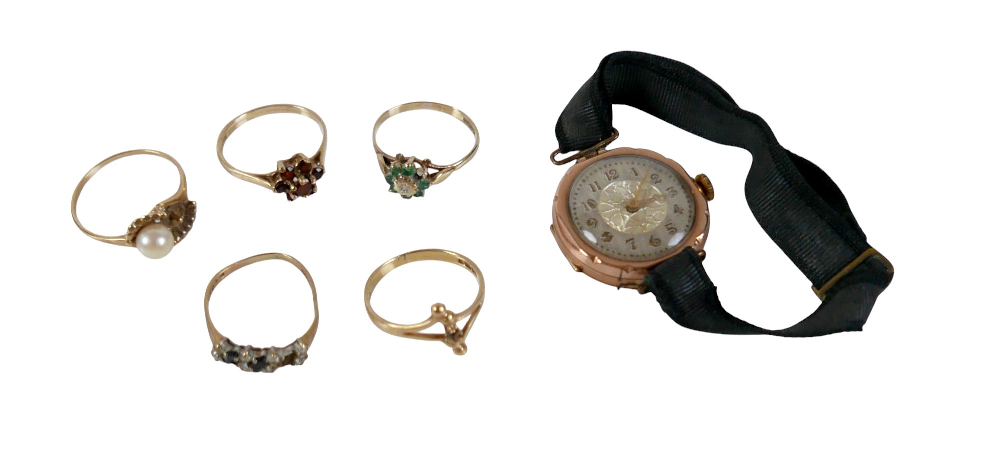 Five 9ct gold dress rings, comprising a garnet daisy ring, size N, 1.5g, a pearl ring a/f, size O, 1.6g, a blue sapphire and white stone ring a/f, size K, 1.2g, a diamond and emerald daisy ring, a/f, size M, 1.2g, another ring a/f, size M, 1.5g, together with a 9ct gold cased cocktail watch with ribbon strap, 15.2g gross. (1 bag)