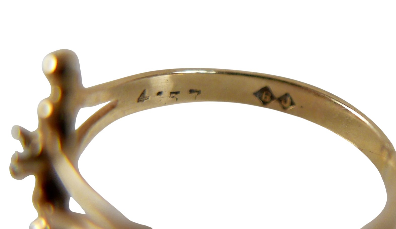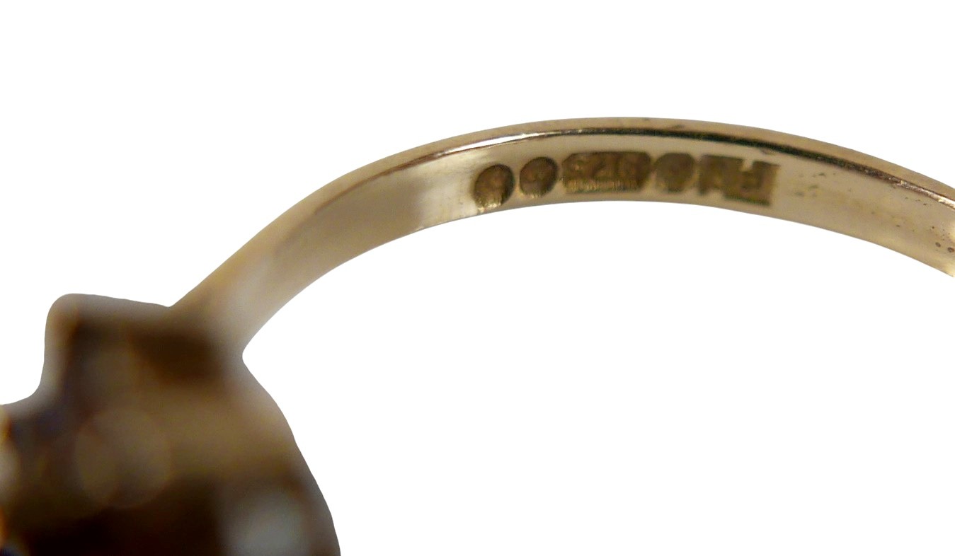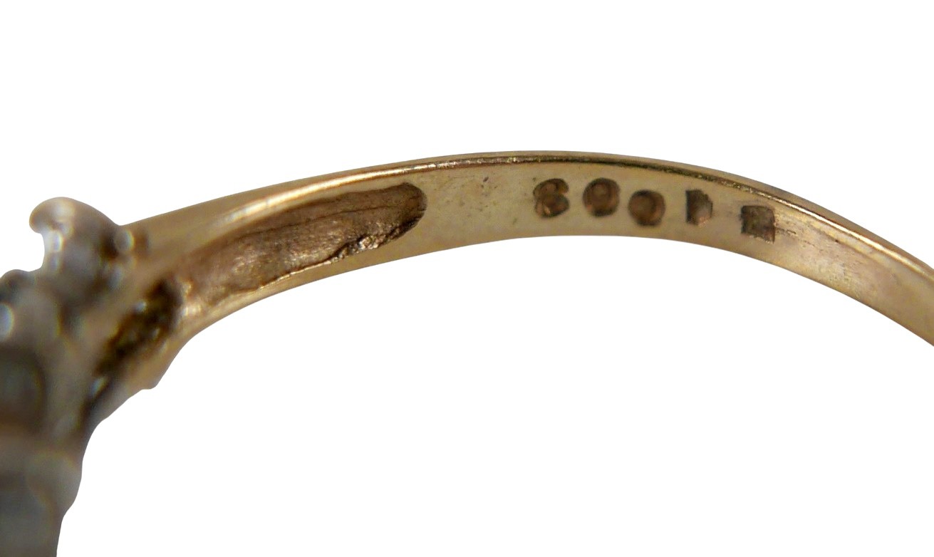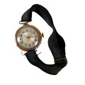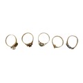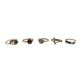 Five 9ct gold dress rings, comprising a garnet daisy ring, size N, 1.5g, a pearl ring a/f, size O, 1.6g, a blue sapphire and white stone ring a/f, size K, 1.2g, a diamond and emerald daisy ring, a/f, size M, 1.2g, another ring a/f, size M, 1.5g, together with a 9ct gold cased cocktail watch with ribbon strap, 15.2g gross. (1 bag)