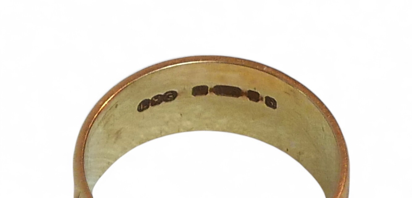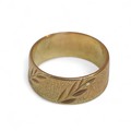 A 9ct gold band, with engraved leaf design and textured effe...