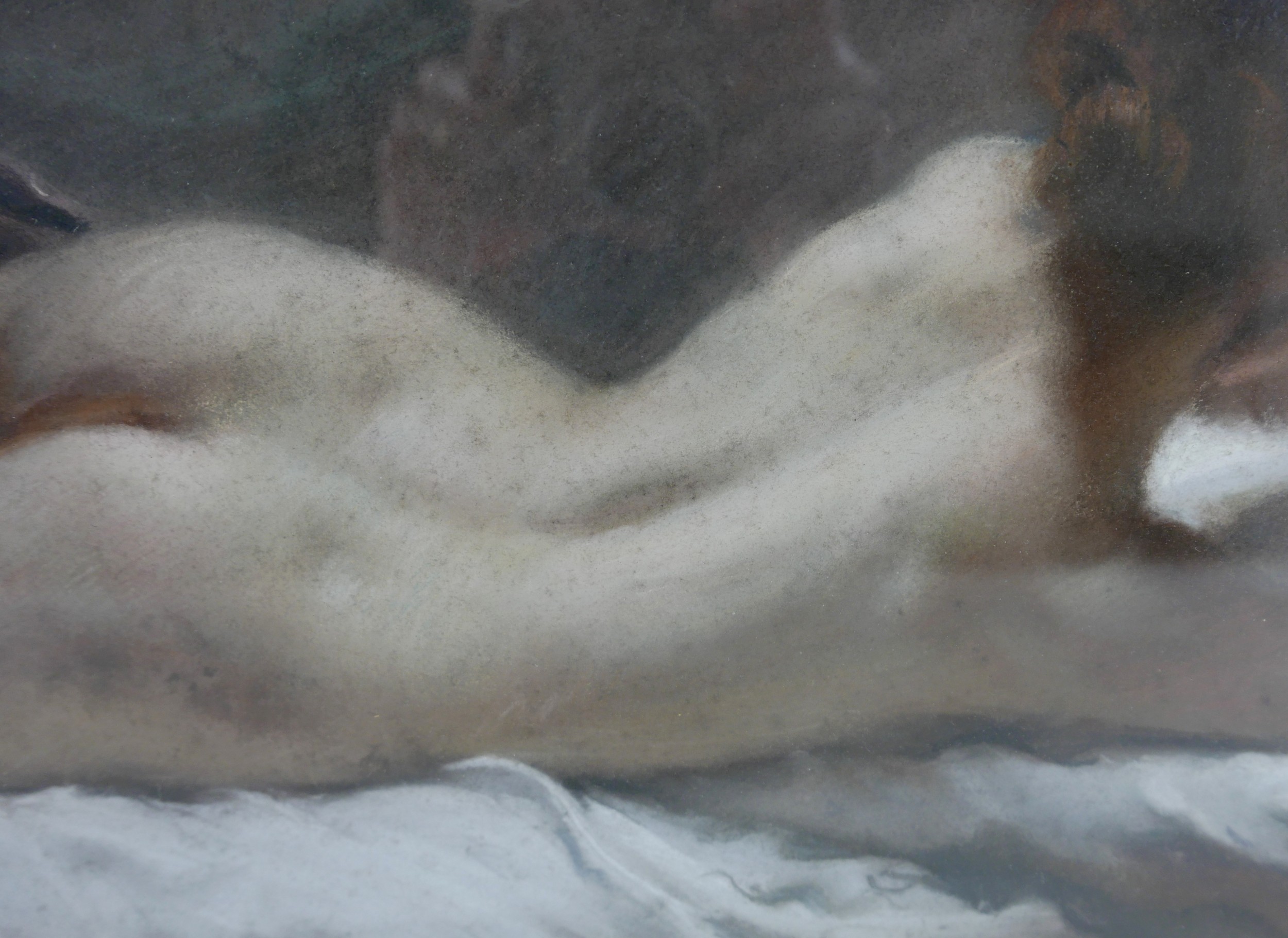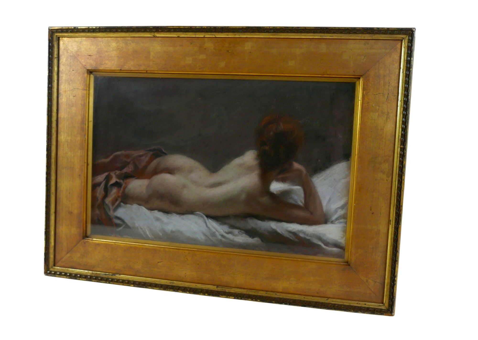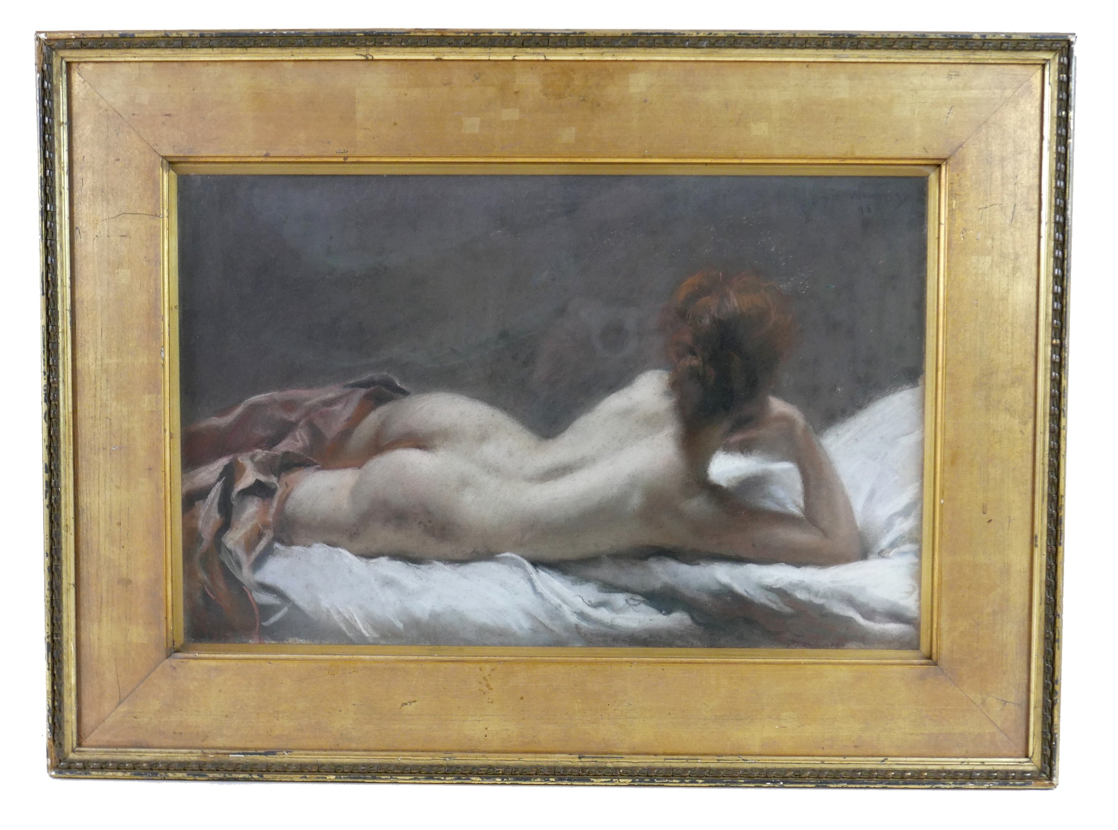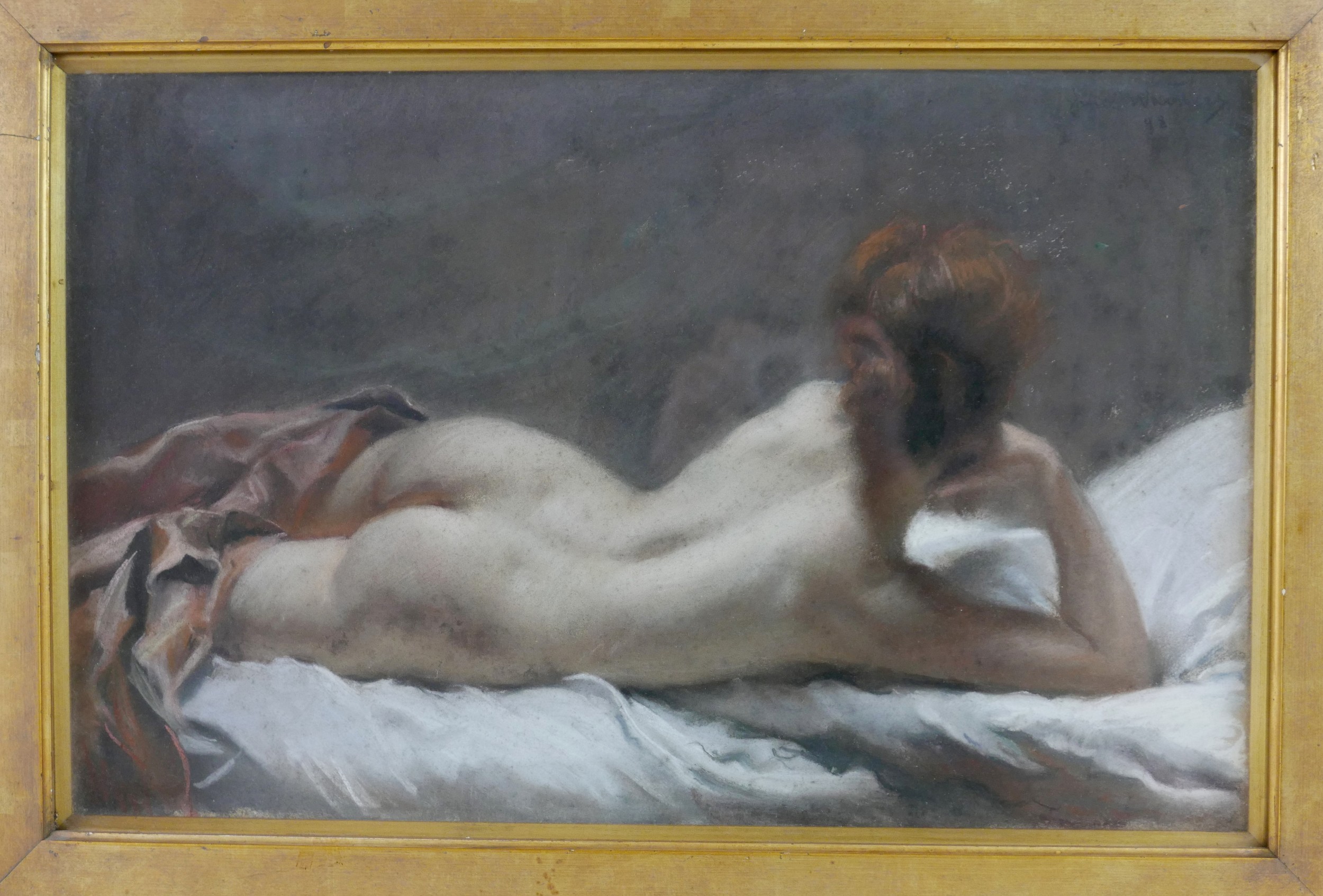 Emile Wauters (Belgian, 1846–1933): reclining female nude, depicting a red haired young woman lying on her front facing away, her chin propped on her right arm, a pink sheet draped across the back of her exposed thighs, pastel on paper, signed and dated '98' upper right, 32 by 50cm, glazed and in a gilt frame, 49 by 67cm.