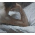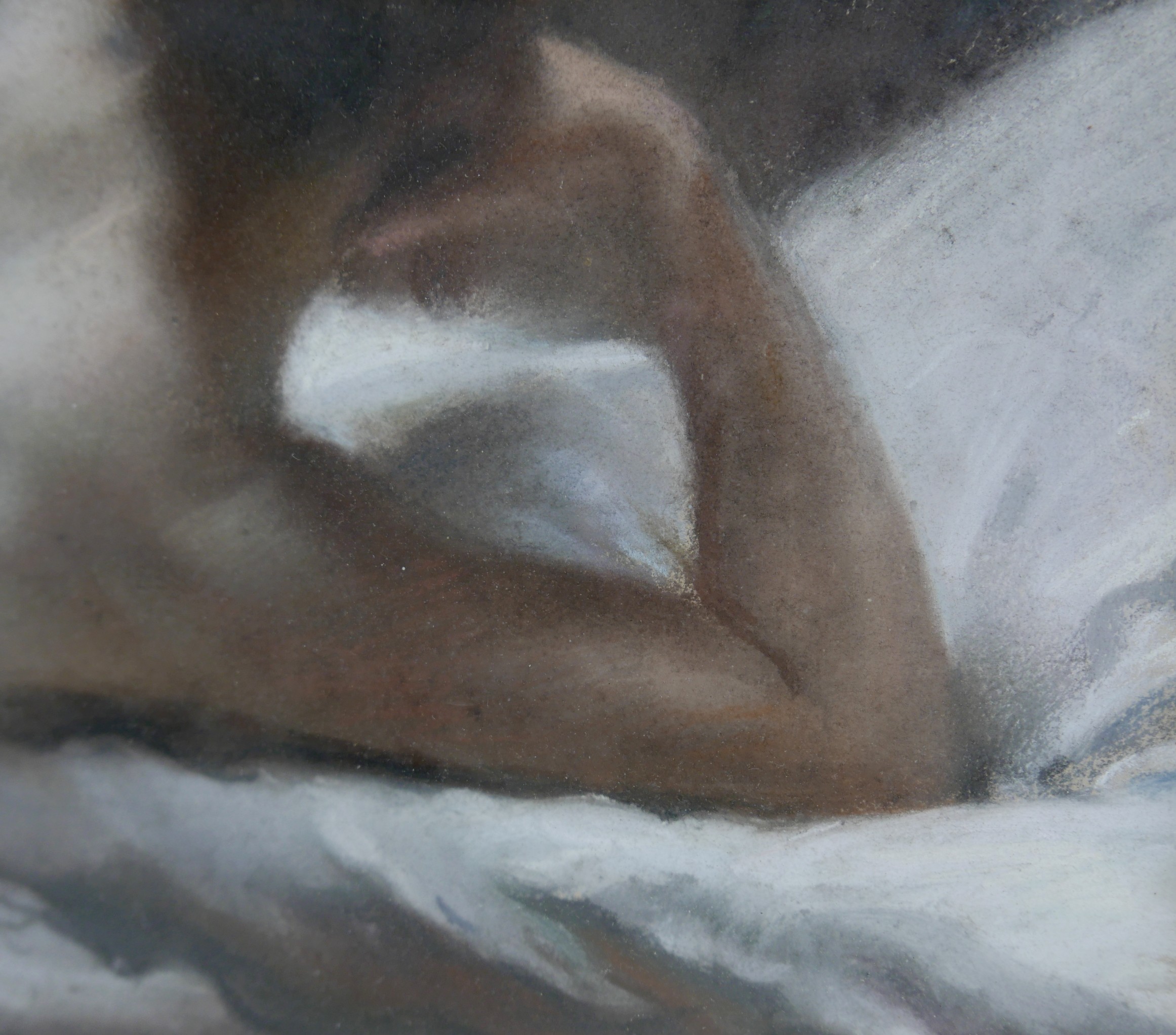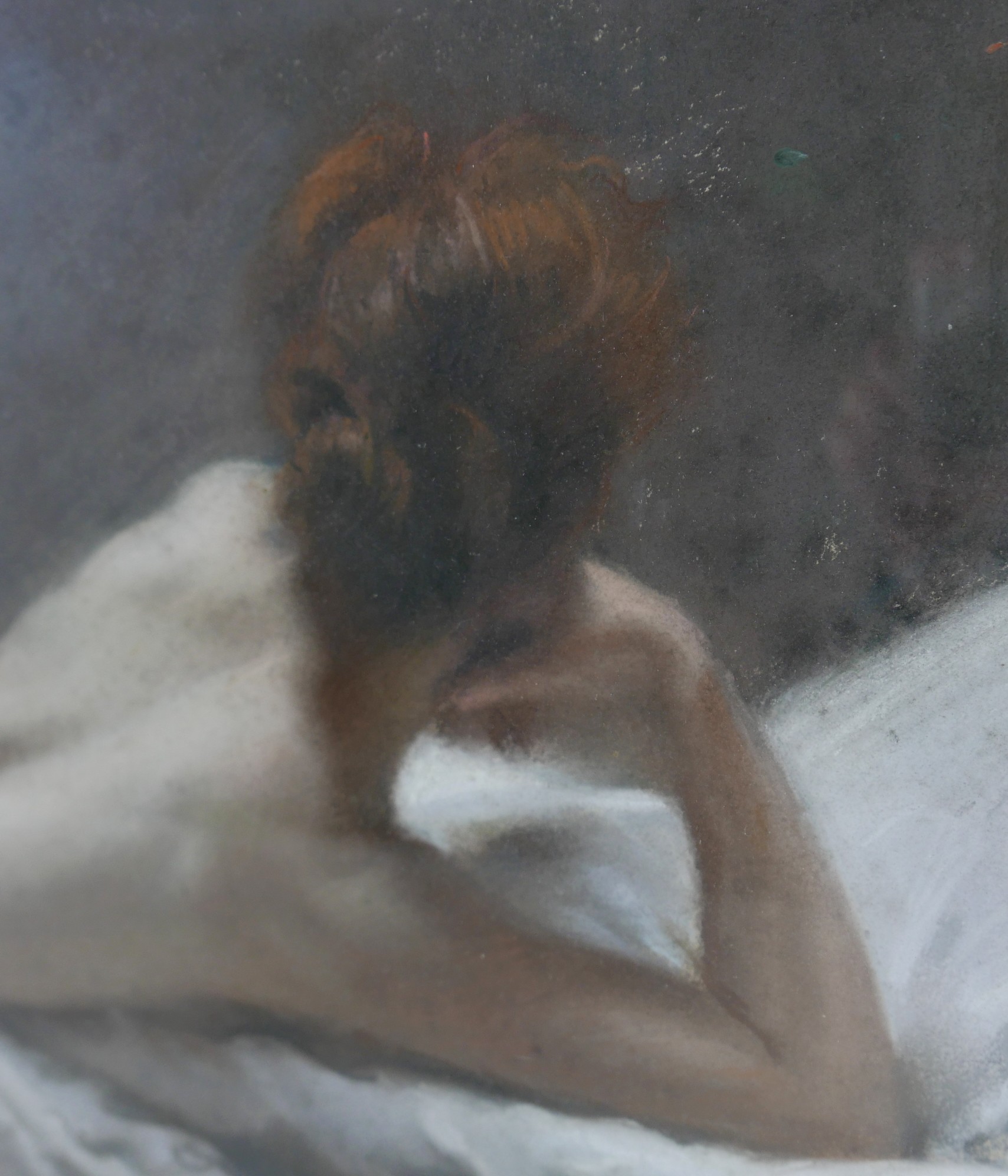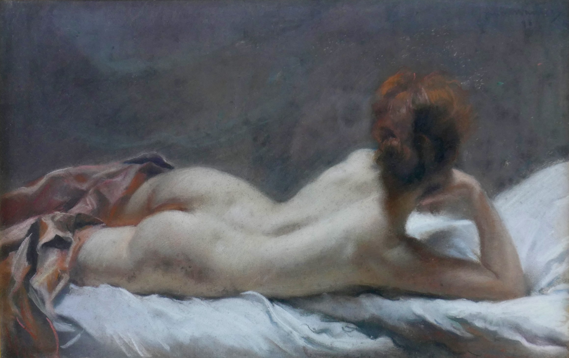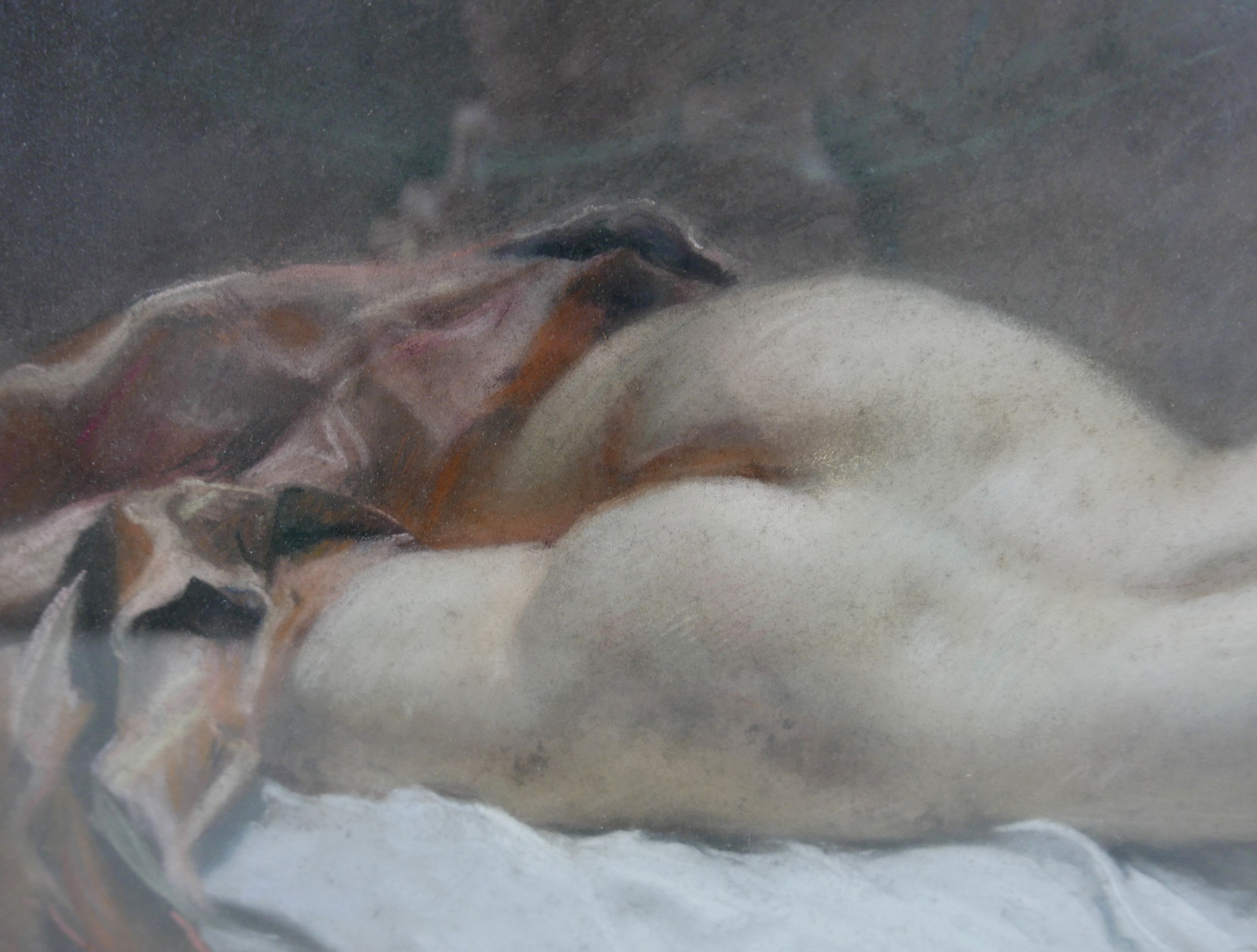 Emile Wauters (Belgian, 1846–1933): reclining female nude, depicting a red haired young woman lying on her front facing away, her chin propped on her right arm, a pink sheet draped across the back of her exposed thighs, pastel on paper, signed and dated '98' upper right, 32 by 50cm, glazed and in a gilt frame, 49 by 67cm.