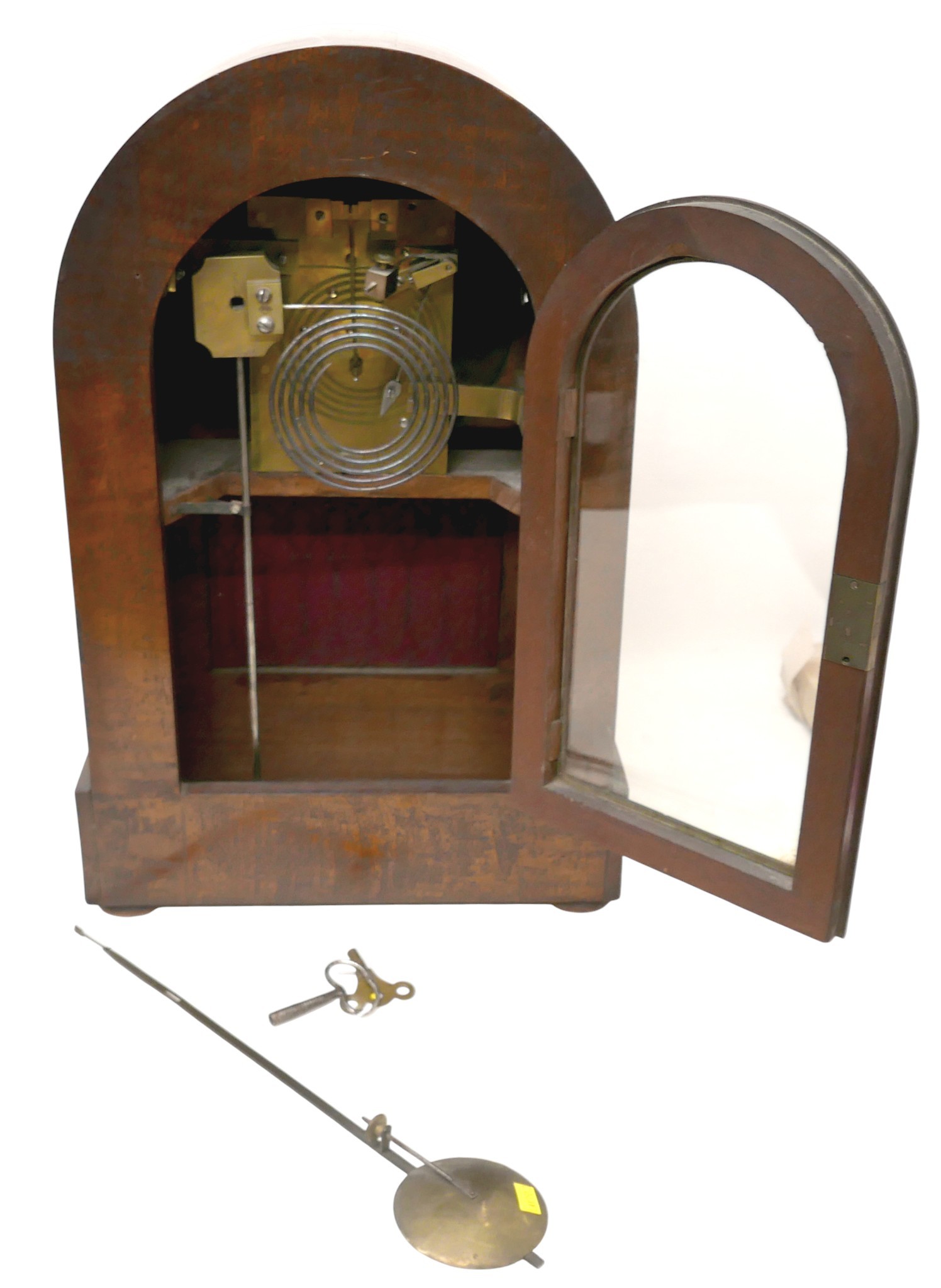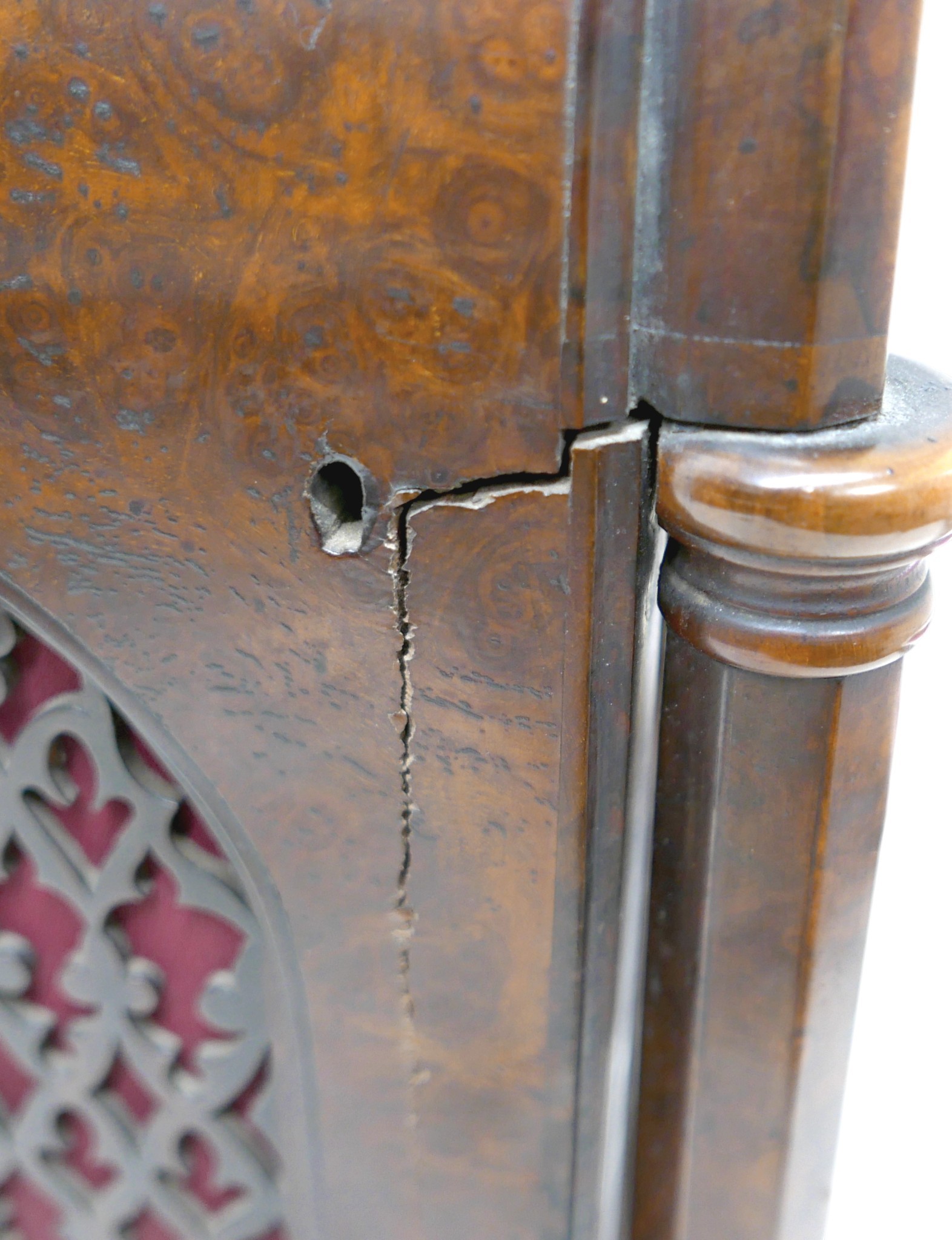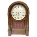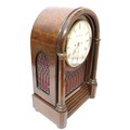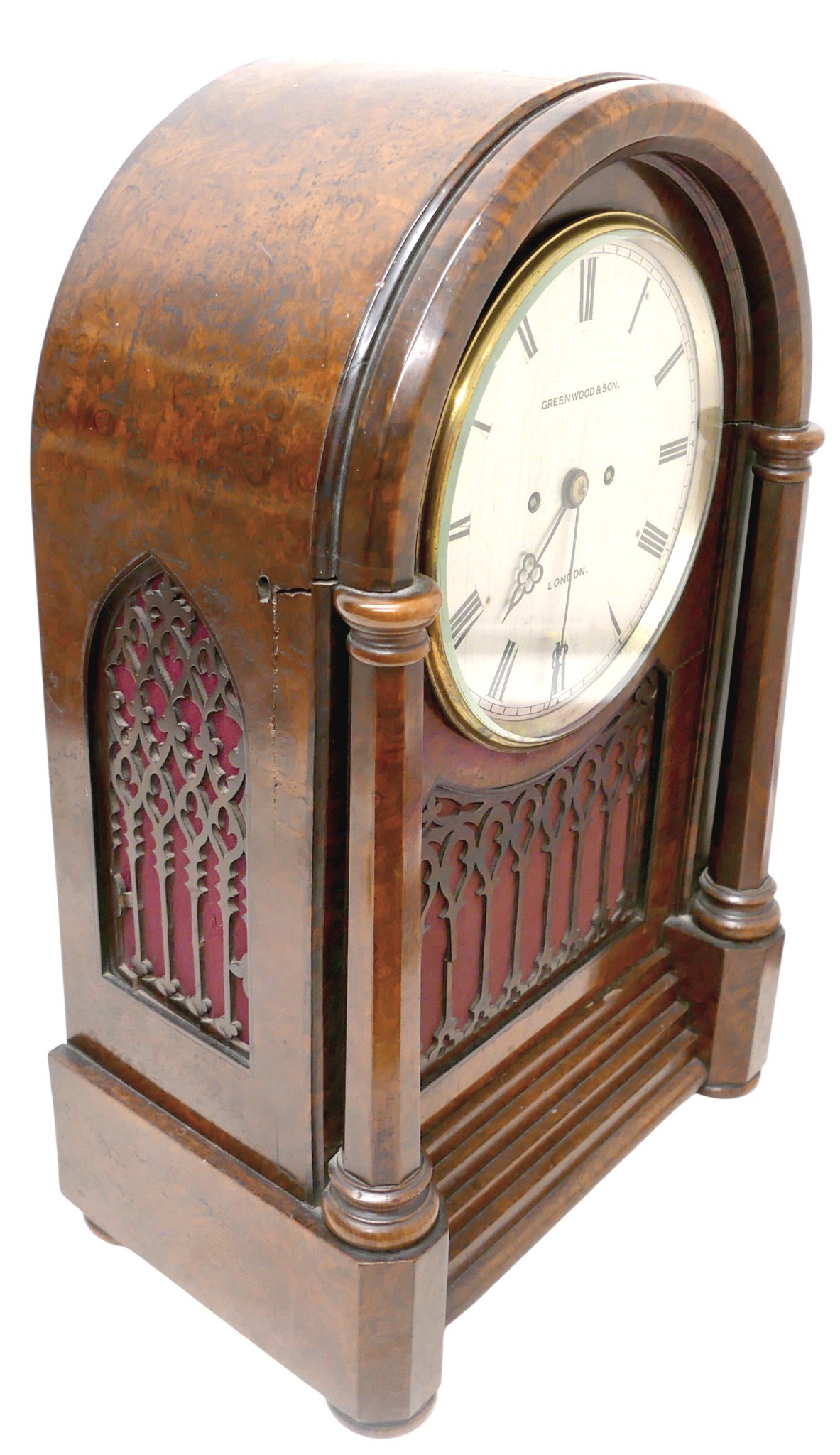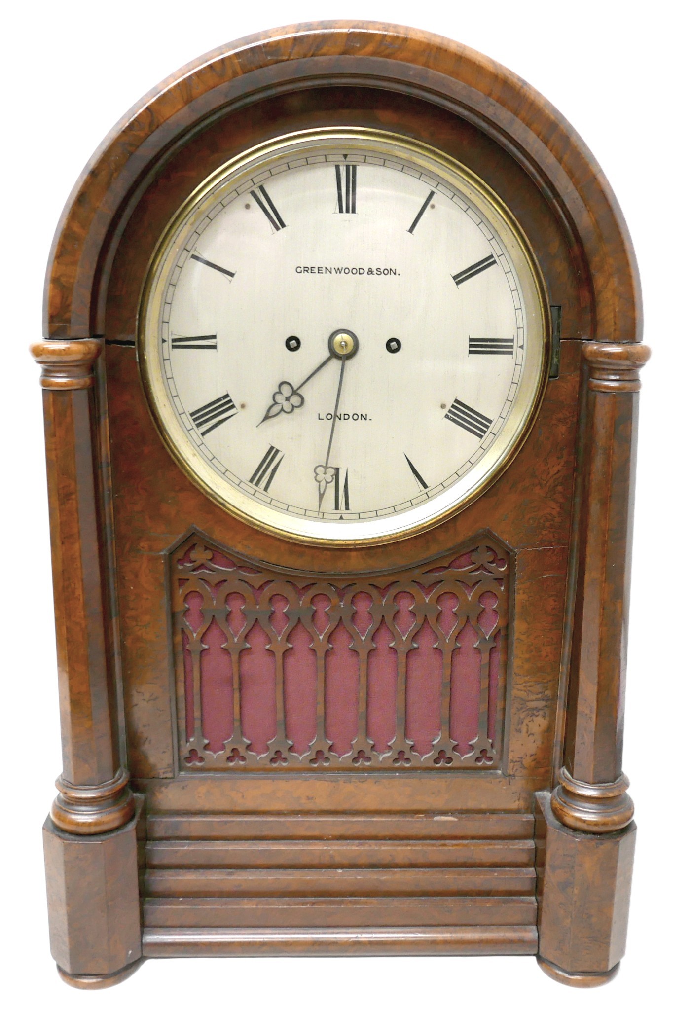 A Victorian burr walnut gothic revival bracket / table clock, domed case with octagonal pillars and open fretwork panels, plinth base, circular silvered dial signed Greenwood & Son, London, double fusee movement striking on a gong, 37 by 23 by 57cm high.