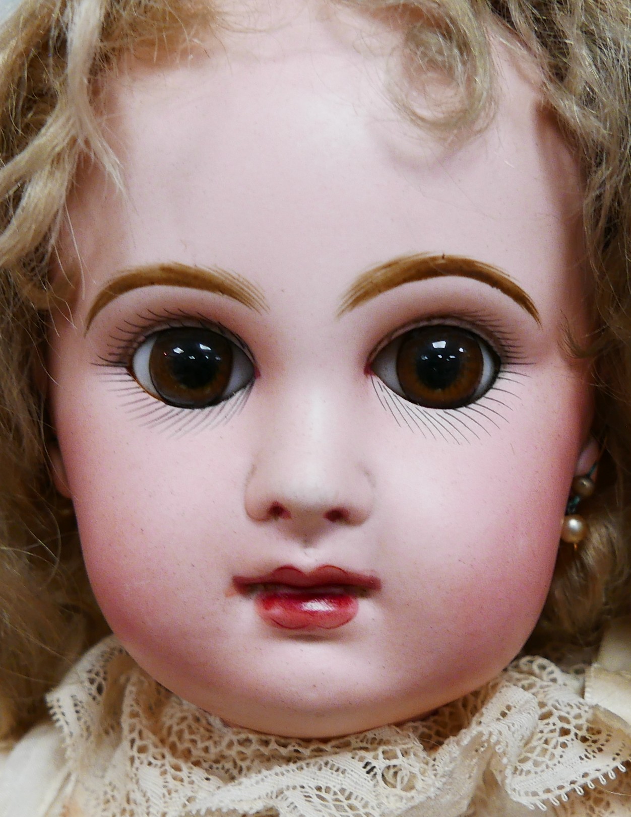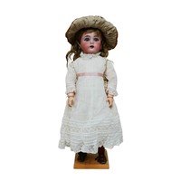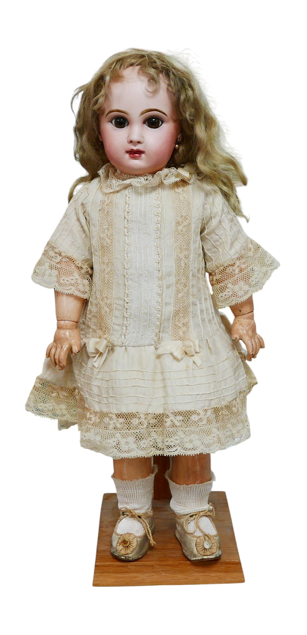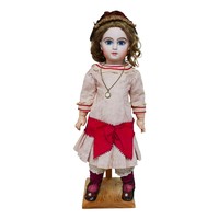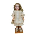 A bisque headed Jumeau doll, with glass eyes, hand painted eye lashes, eye brows and lips, closed mouth, impressed marks to the back of its head back of neck printed with '....SGDG', 16 1/2" (42cm) high.