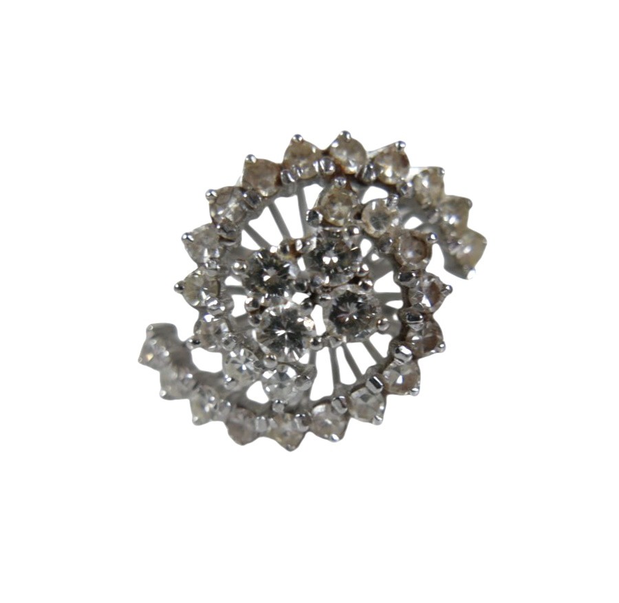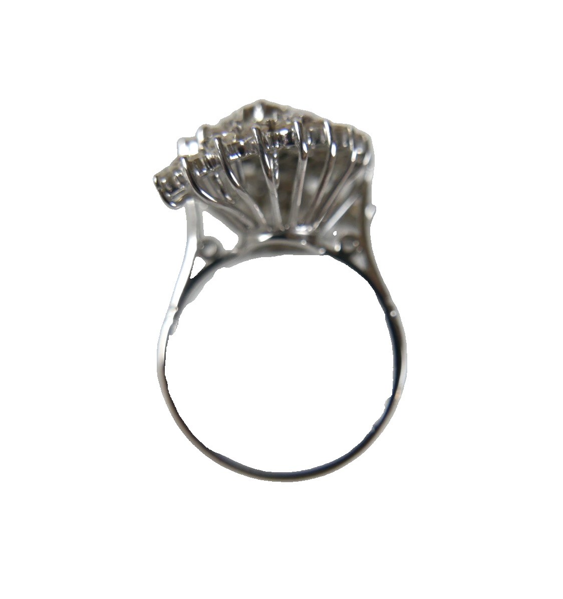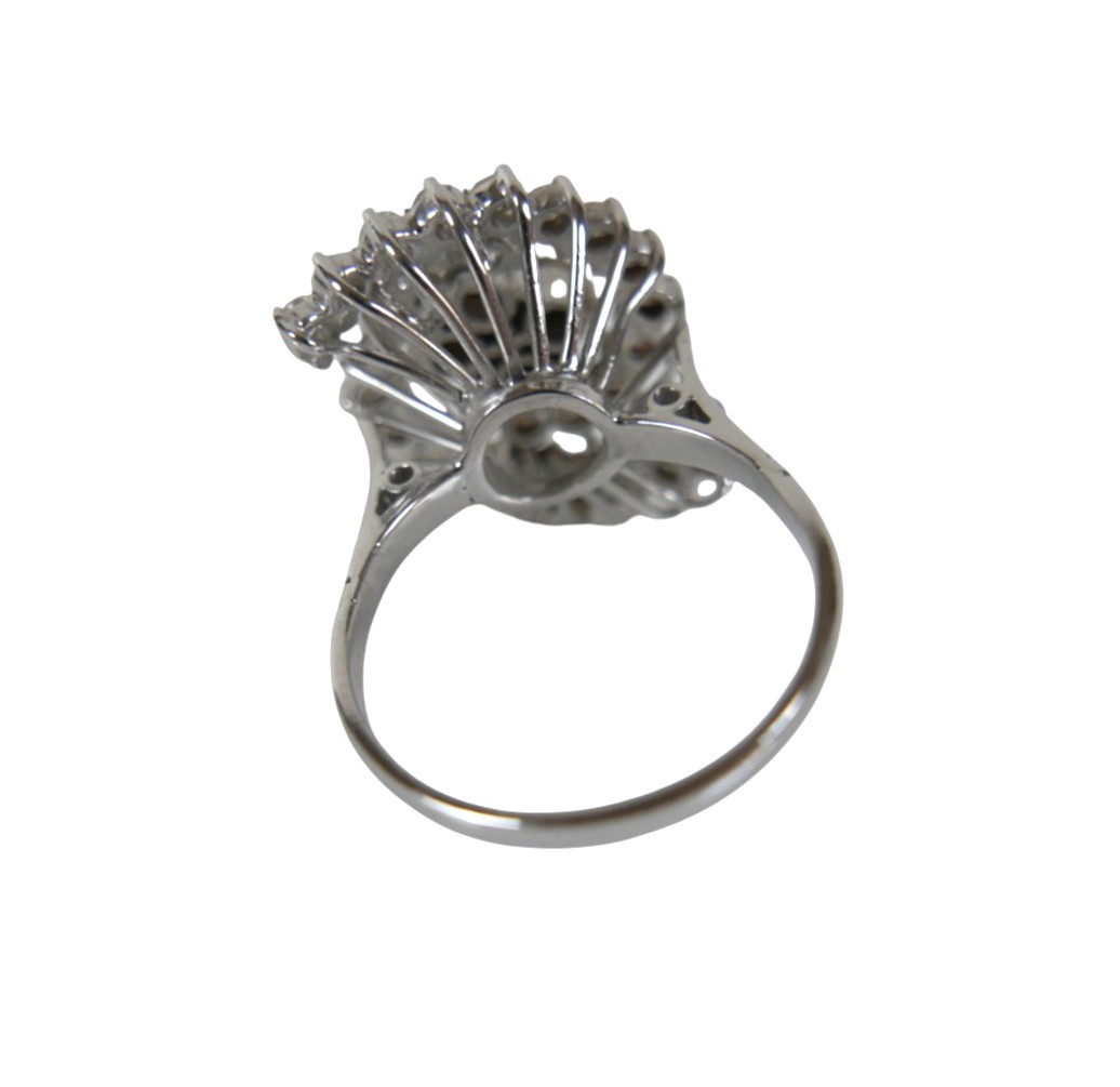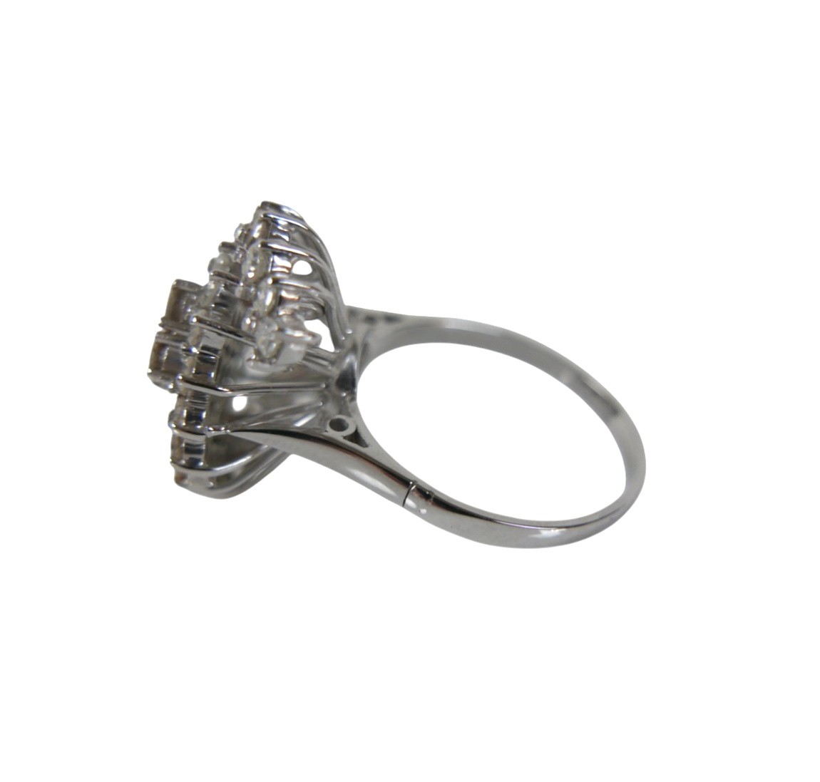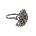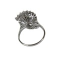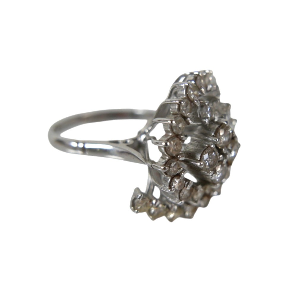 A white gold and diamond set cluster ring, set centrally with four brilliant cut stones, each 3.0mm, 0.11ct, surrounded by two curved bands of thirteen brilliant cut stones, each 2.2mm, 0.04ct, approximate total diamond weight 1.5ct, overall head size 21 by 17mm, 12mm high from back of band, band width 2.0mm, unmarked, size Q, 8.1g.