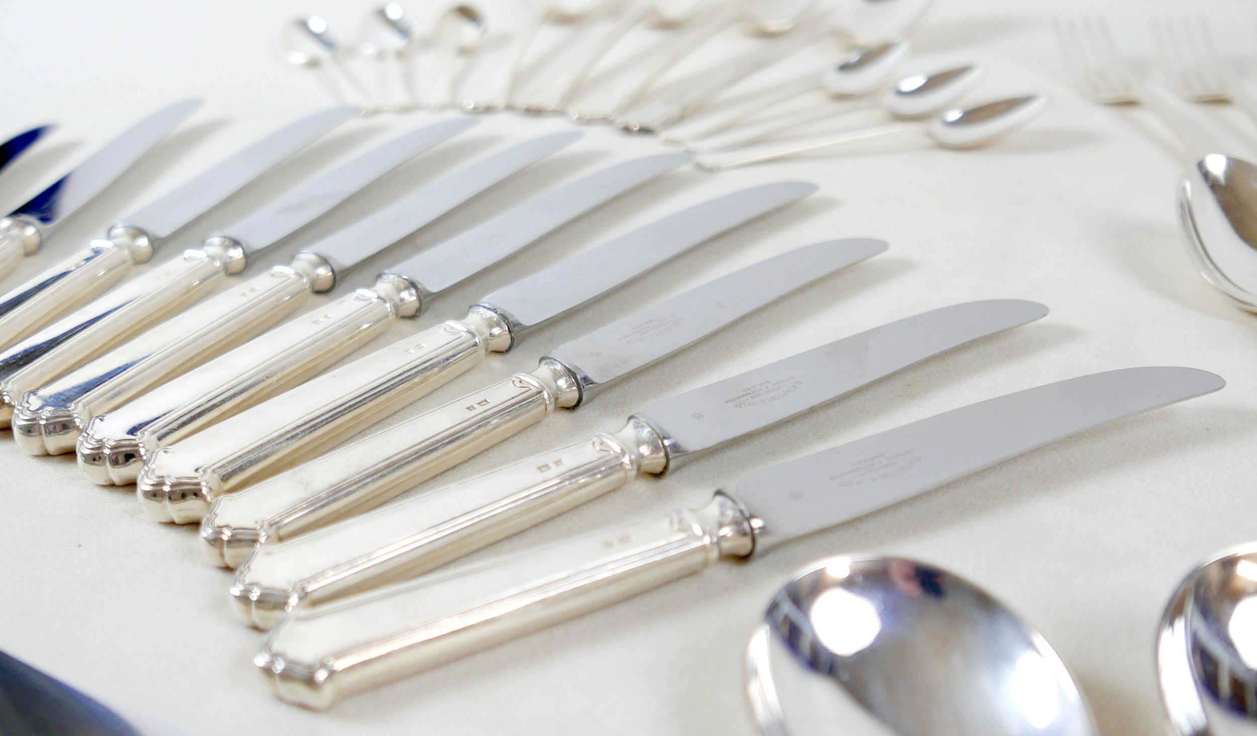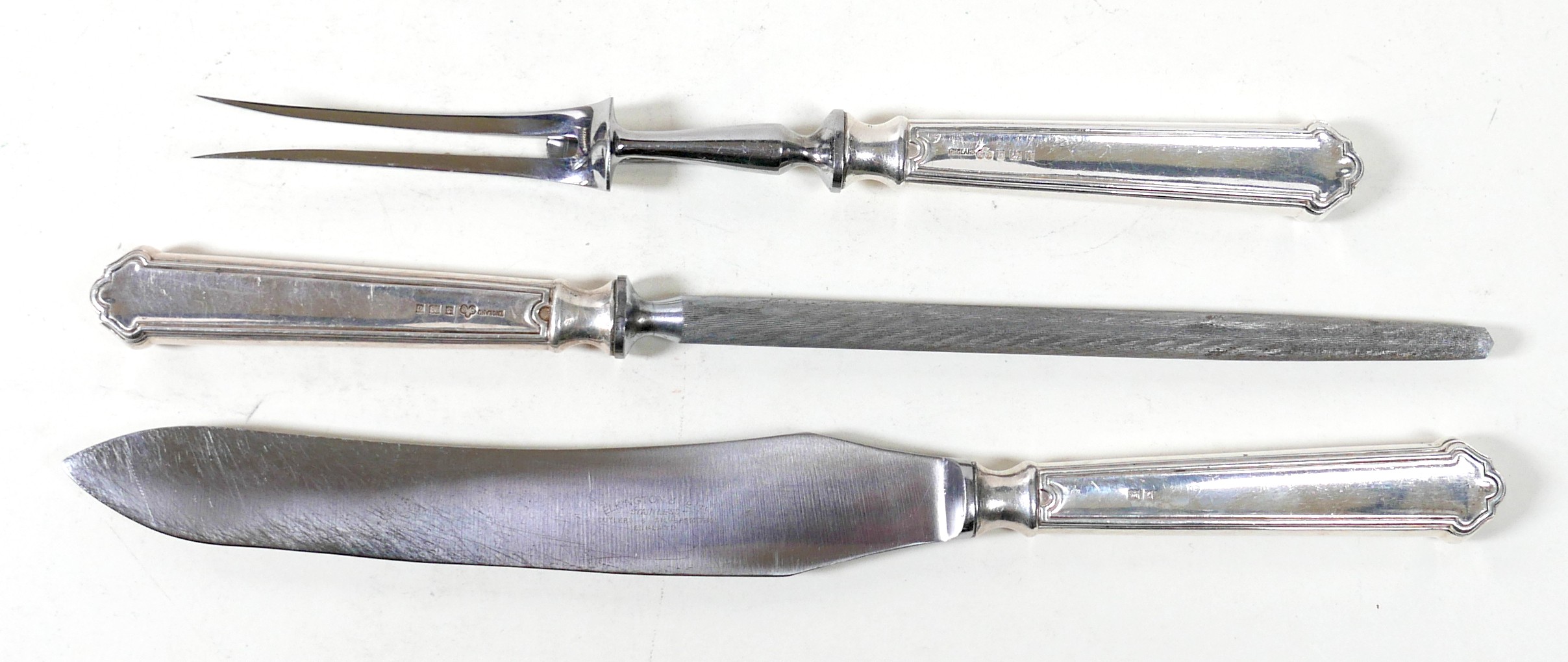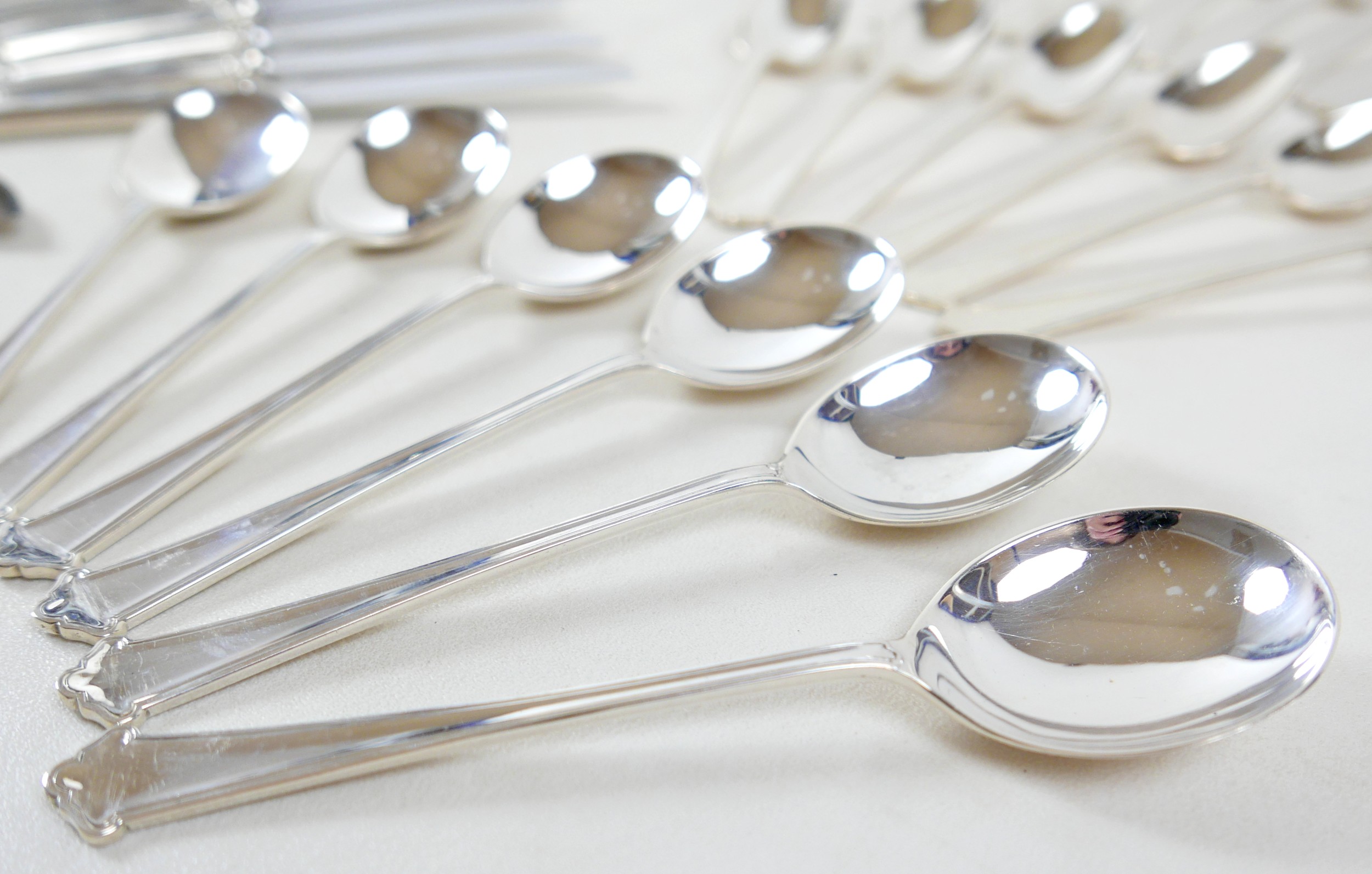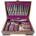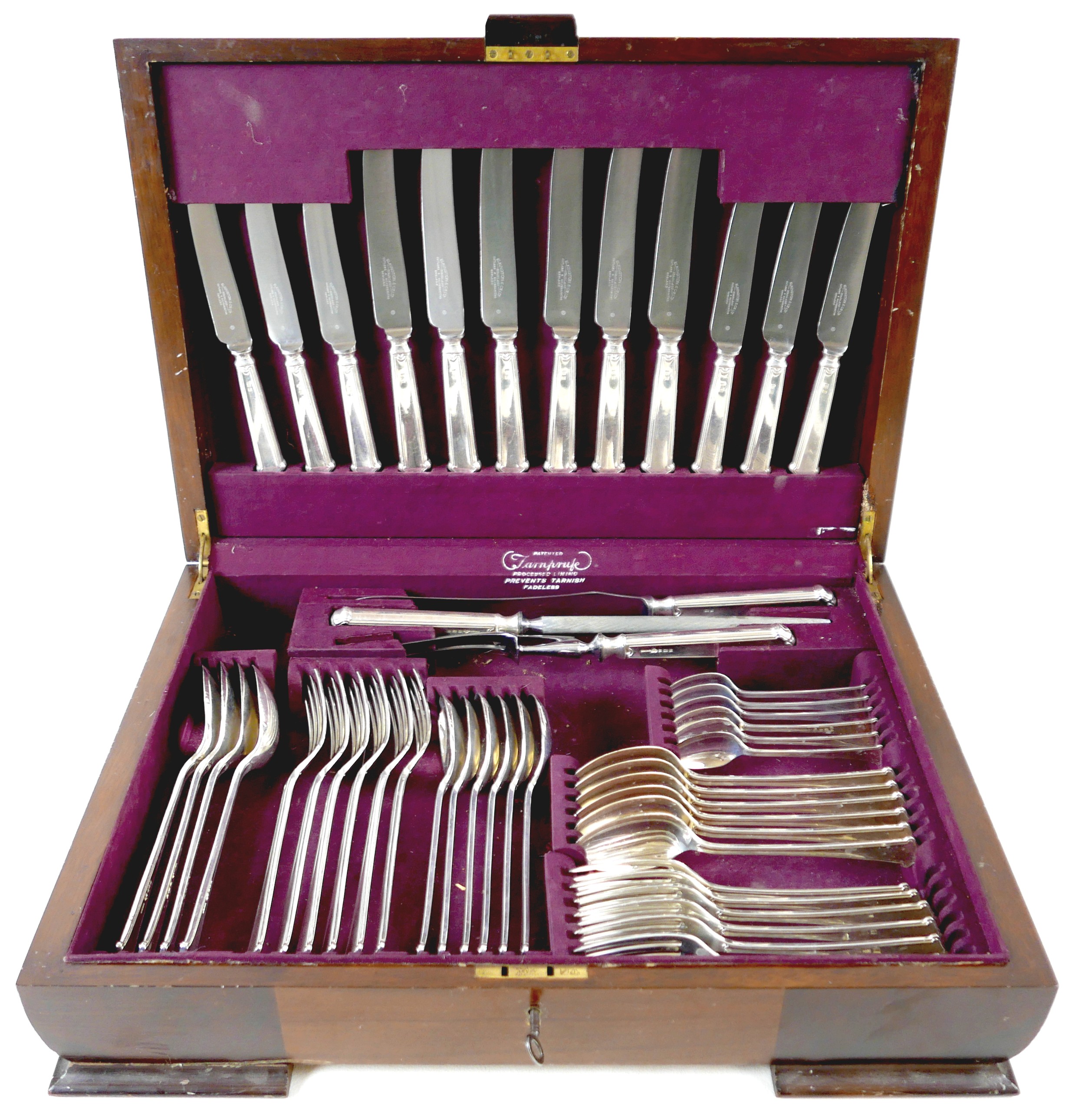 An Elizabeth II silver suite of cutlery, by Elkington & Co, comprising four tablespoons, 21.7cm long, six table forks, 20.5cm long, six table knives with silver handles and steel blades, 23.7cm long, six soup spoons, 18.7cm long, six dessert forks, 18.3cm long, six dessert knives with silver handles and steel blades, 21cm long, six dessert spoons, 18.5cm long, six teaspoons, 12.7cm long, carving knife, fork, and sharpening steel with silver handles and steel blades, Elkington & Co, Birmingham predominantly 1960 and 1961 with some later pieces 1972, total combined silver weight (not including steel bladed items) 61.53toz / 1913.8g, the steel bladed items combined gross weight 1280g, all in a mahogany and walnut 'Tarnprufe' canteen, with key.