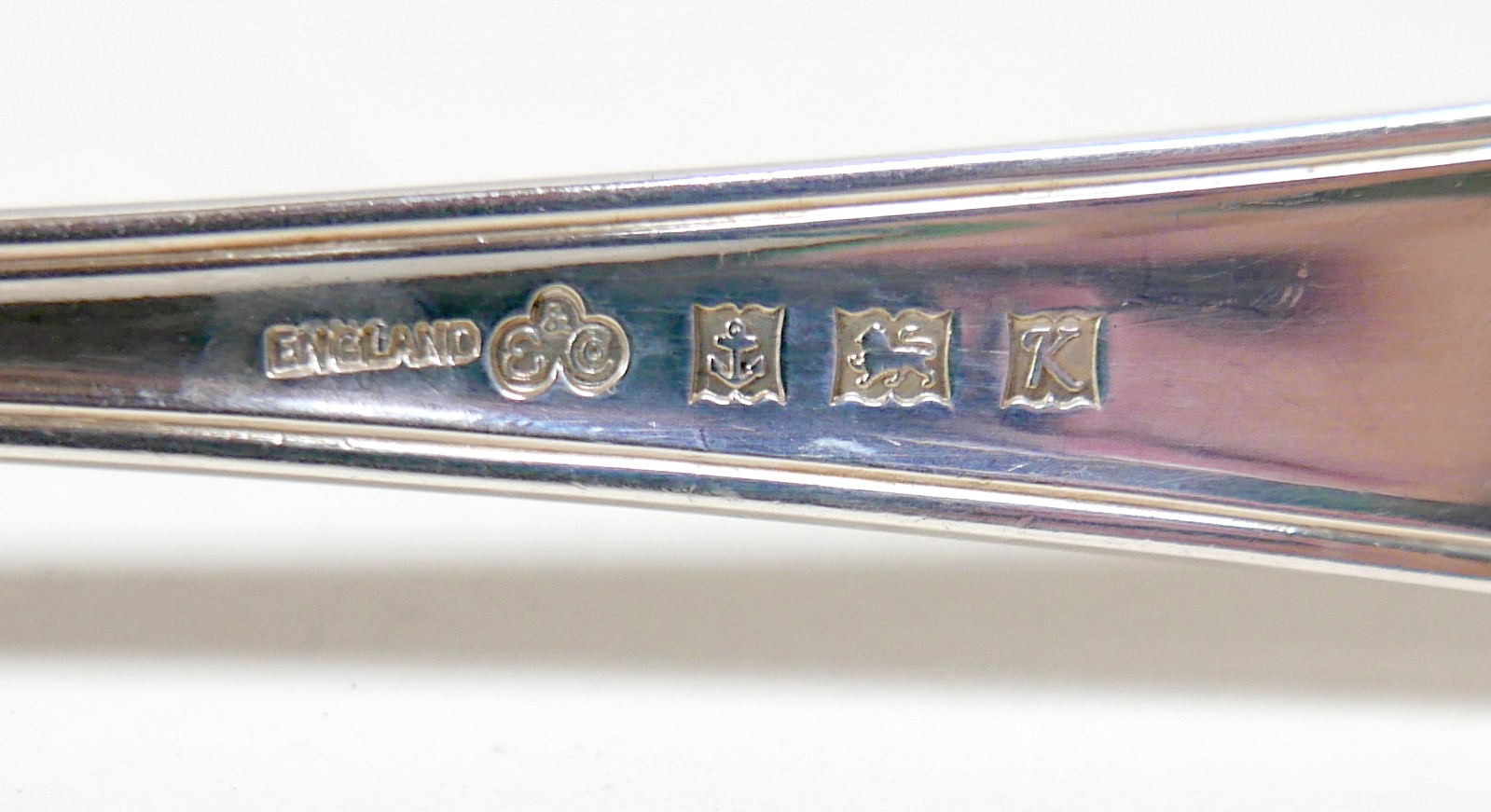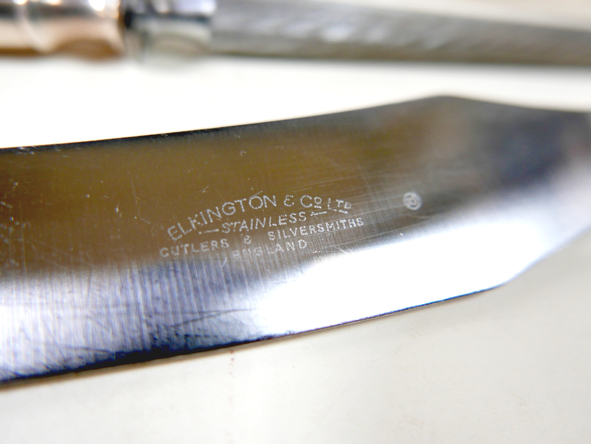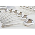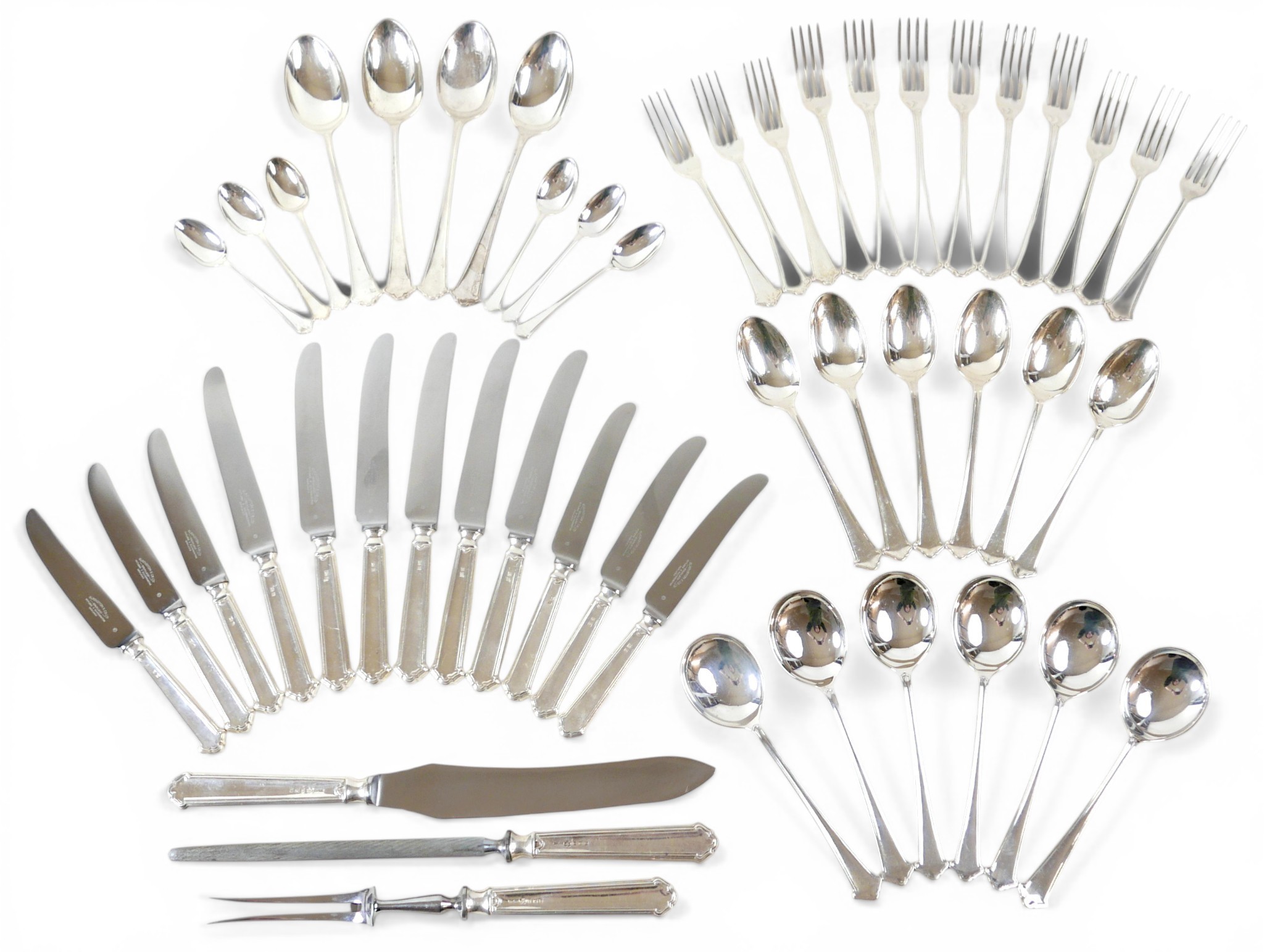An Elizabeth II silver suite of cutlery, by Elkington & Co, comprising four tablespoons, 21.7cm long, six table forks, 20.5cm long, six table knives with silver handles and steel blades, 23.7cm long, six soup spoons, 18.7cm long, six dessert forks, 18.3cm long, six dessert knives with silver handles and steel blades, 21cm long, six dessert spoons, 18.5cm long, six teaspoons, 12.7cm long, carving knife, fork, and sharpening steel with silver handles and steel blades, Elkington & Co, Birmingham predominantly 1960 and 1961 with some later pieces 1972, total combined silver weight (not including steel bladed items) 61.53toz / 1913.8g, the steel bladed items combined gross weight 1280g, all in a mahogany and walnut 'Tarnprufe' canteen, with key.