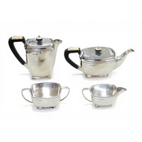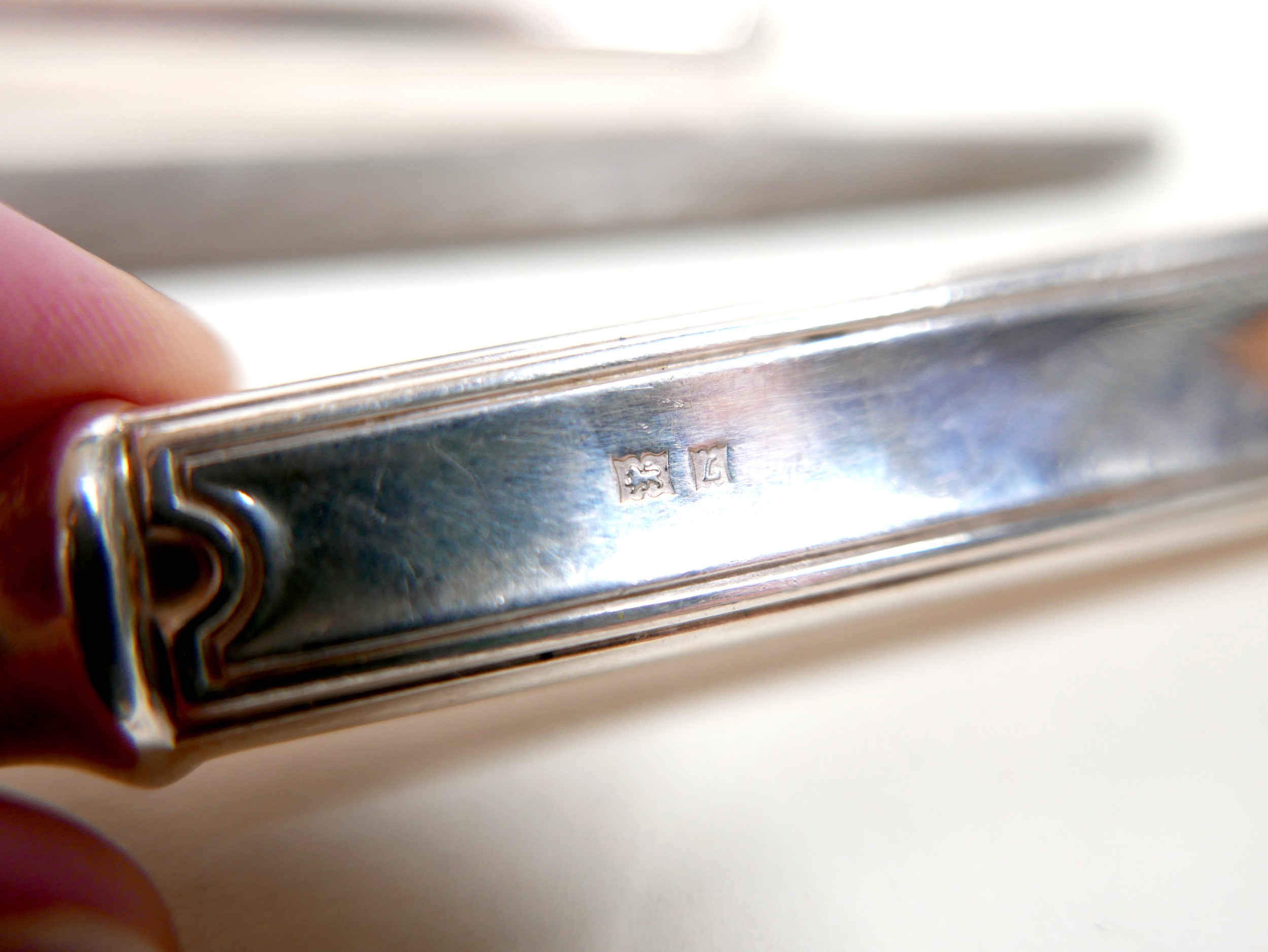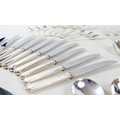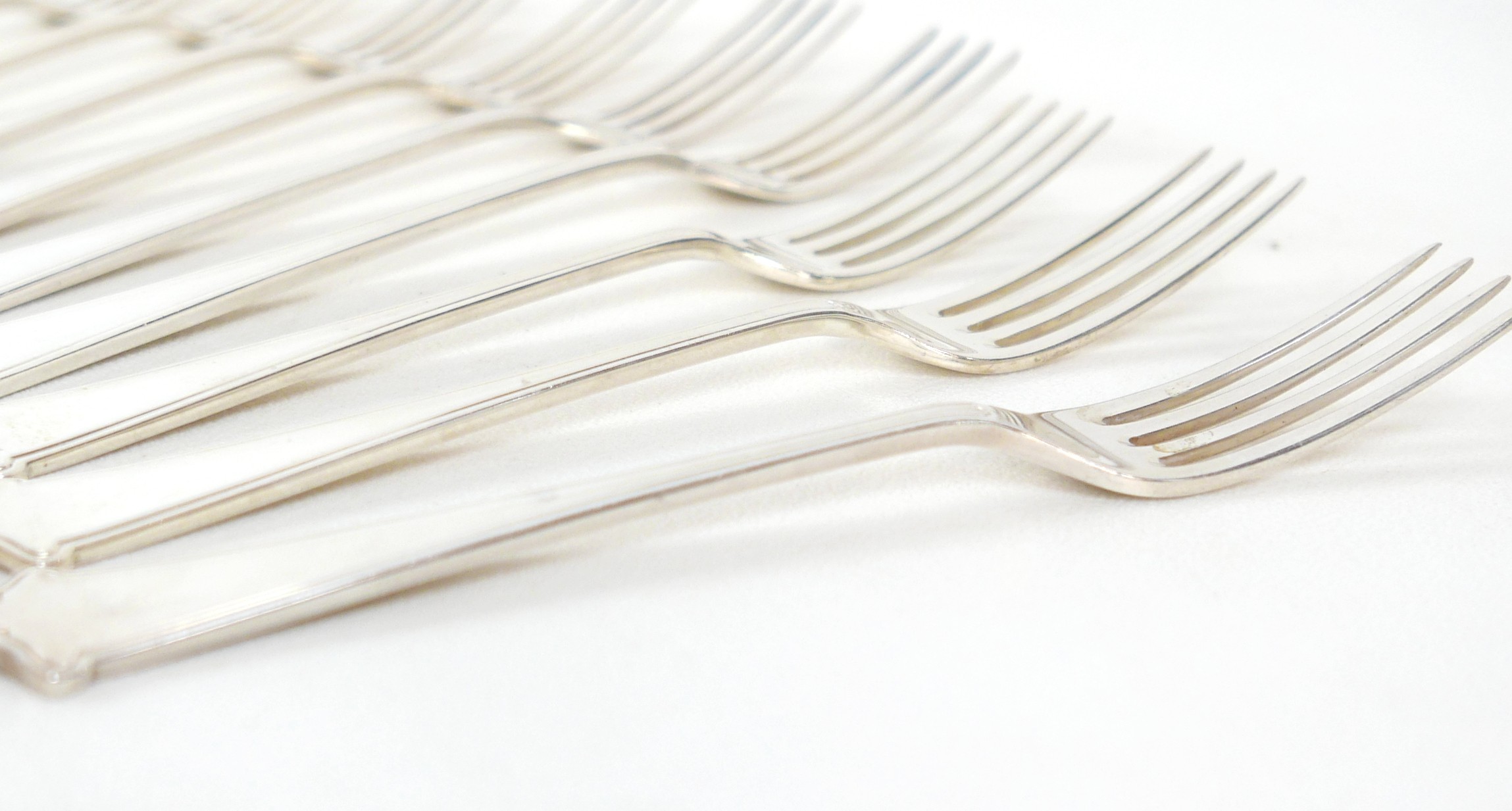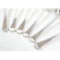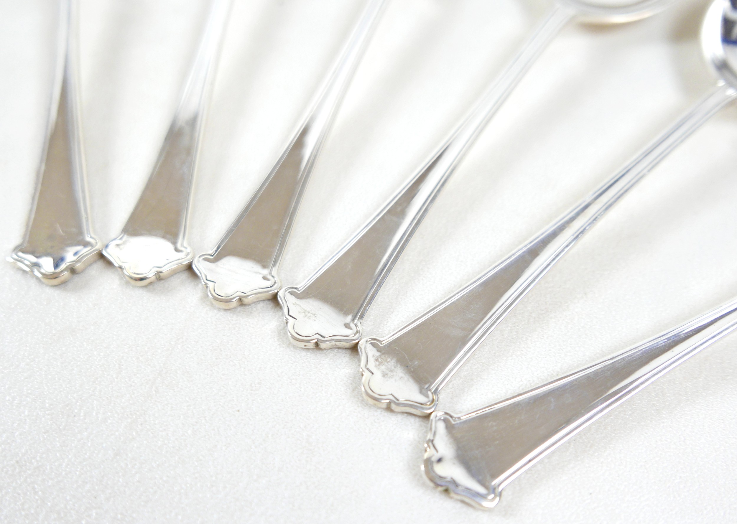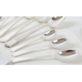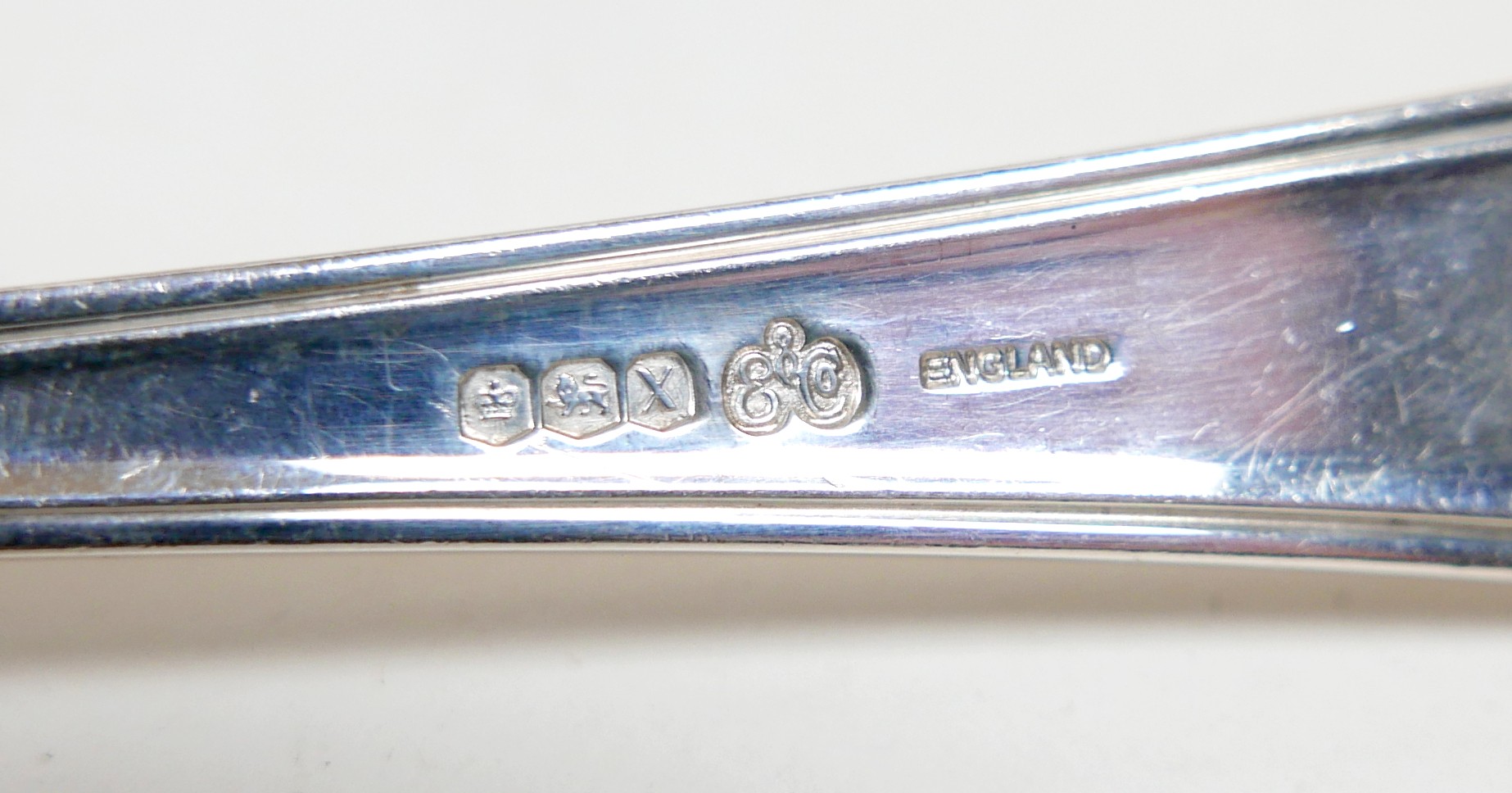 An Elizabeth II silver suite of cutlery, by Elkington & Co, comprising four tablespoons, 21.7cm long, six table forks, 20.5cm long, six table knives with silver handles and steel blades, 23.7cm long, six soup spoons, 18.7cm long, six dessert forks, 18.3cm long, six dessert knives with silver handles and steel blades, 21cm long, six dessert spoons, 18.5cm long, six teaspoons, 12.7cm long, carving knife, fork, and sharpening steel with silver handles and steel blades, Elkington & Co, Birmingham predominantly 1960 and 1961 with some later pieces 1972, total combined silver weight (not including steel bladed items) 61.53toz / 1913.8g, the steel bladed items combined gross weight 1280g, all in a mahogany and walnut 'Tarnprufe' canteen, with key.