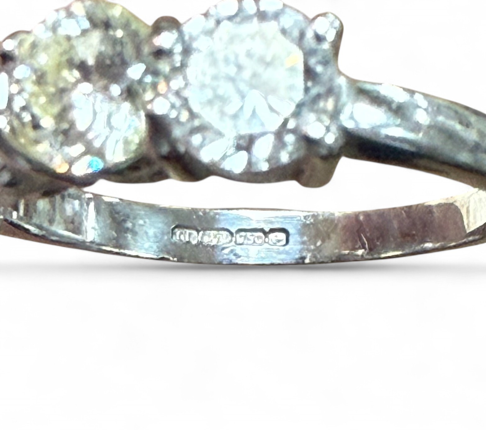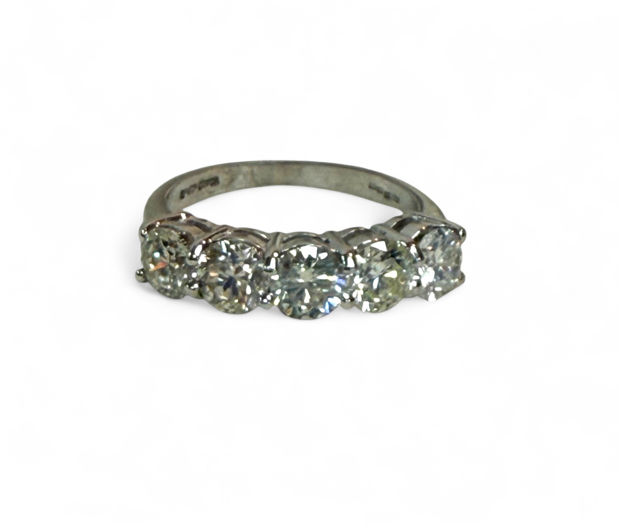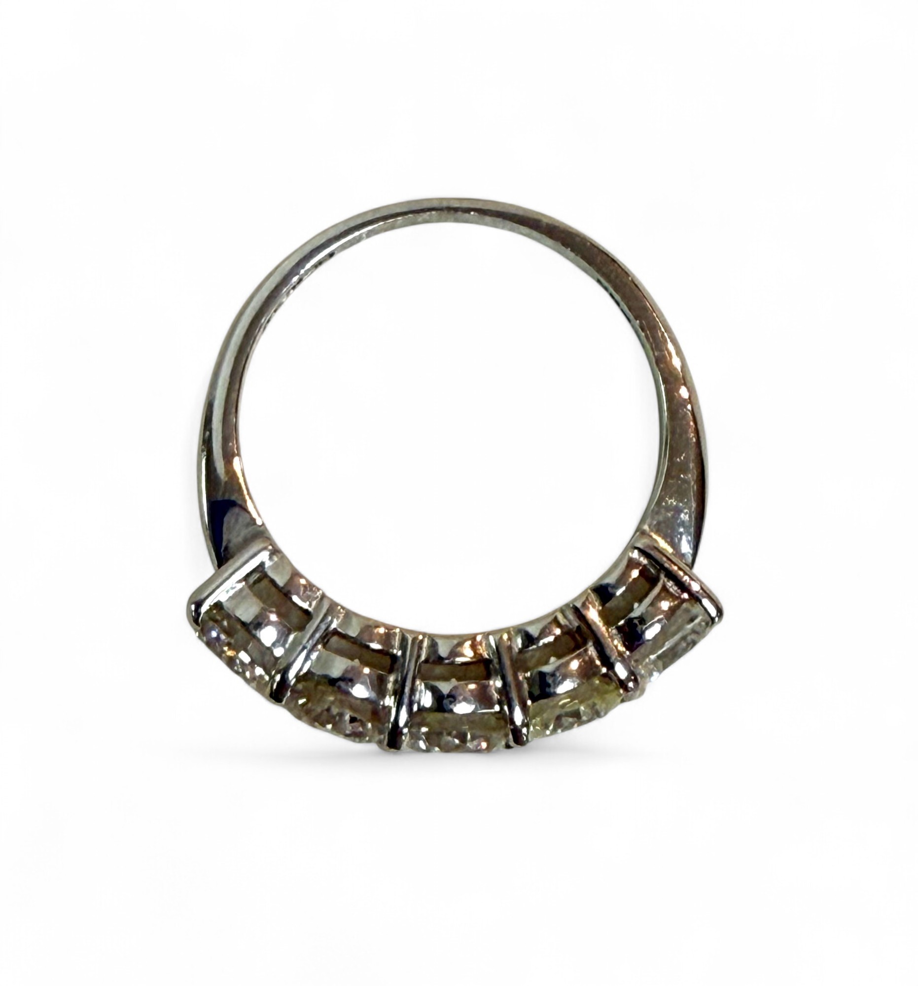 An 18ct white gold five stone diamond ring, each stone approximately 5mm diameter, size Q, 5.4g.