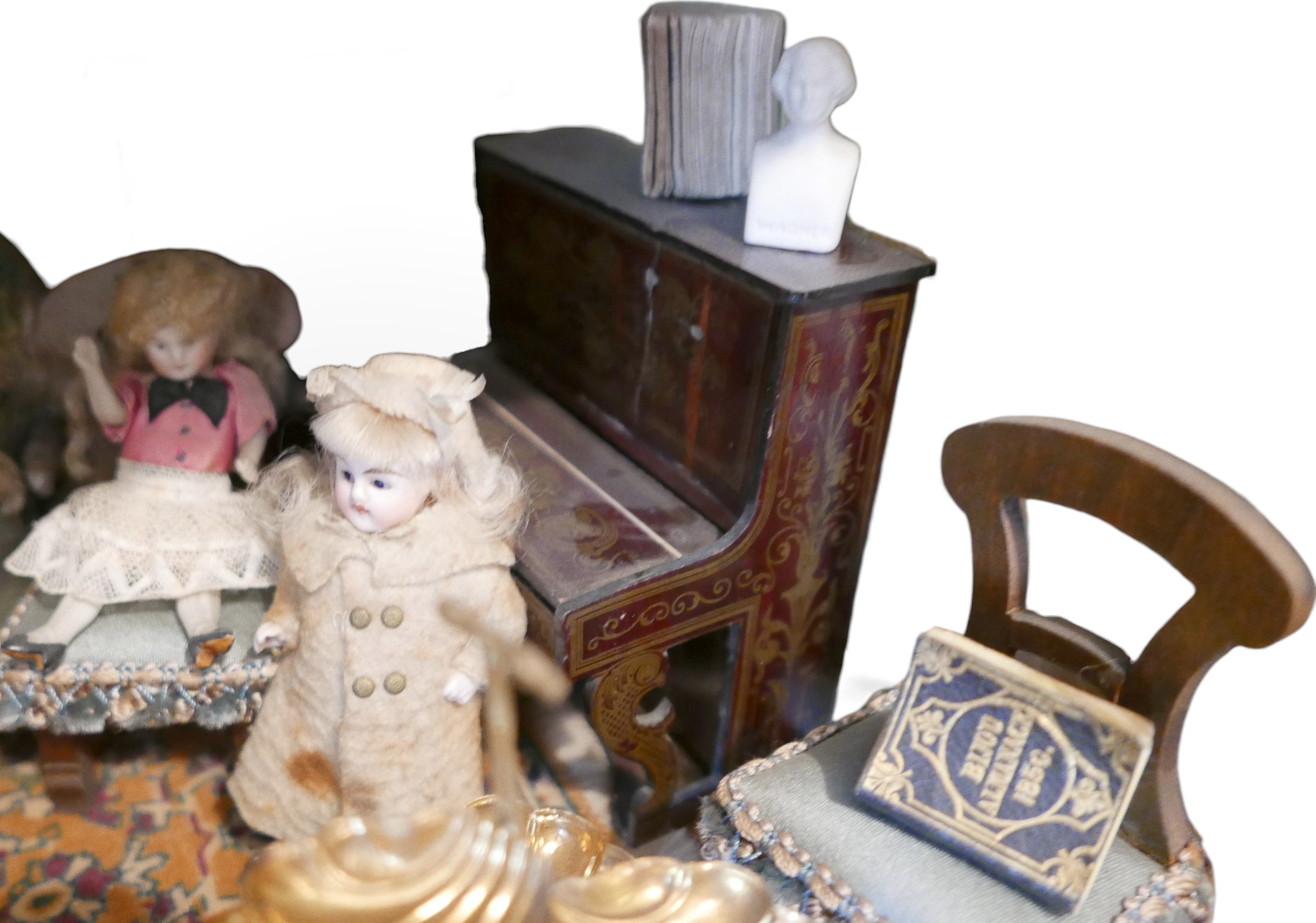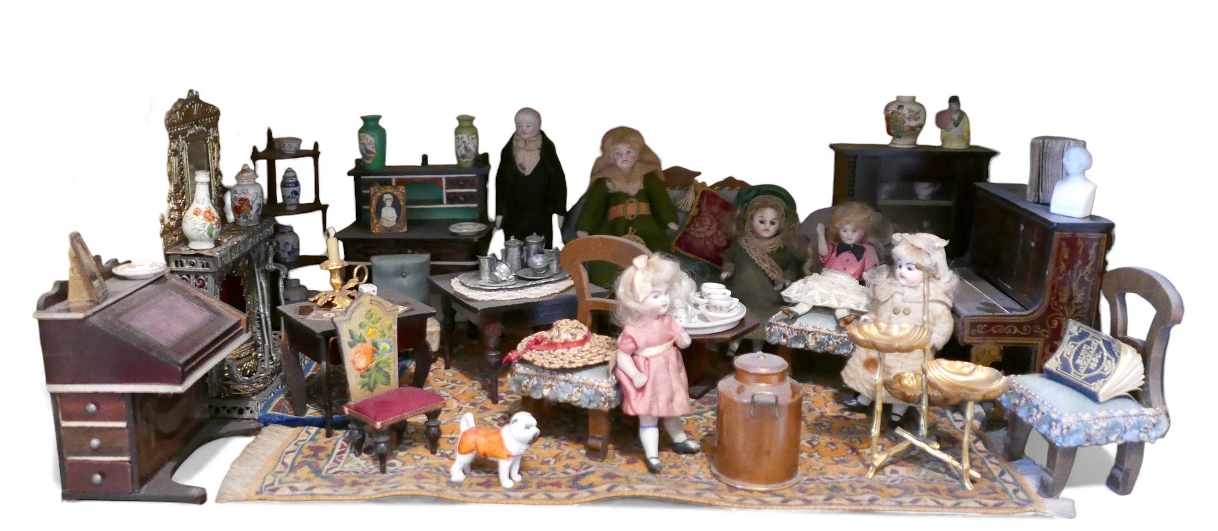 Six dolls and assorted doll's house furnishings, including a piano, some Chinese blue and white ceramics, and a whatnot. (1 box)