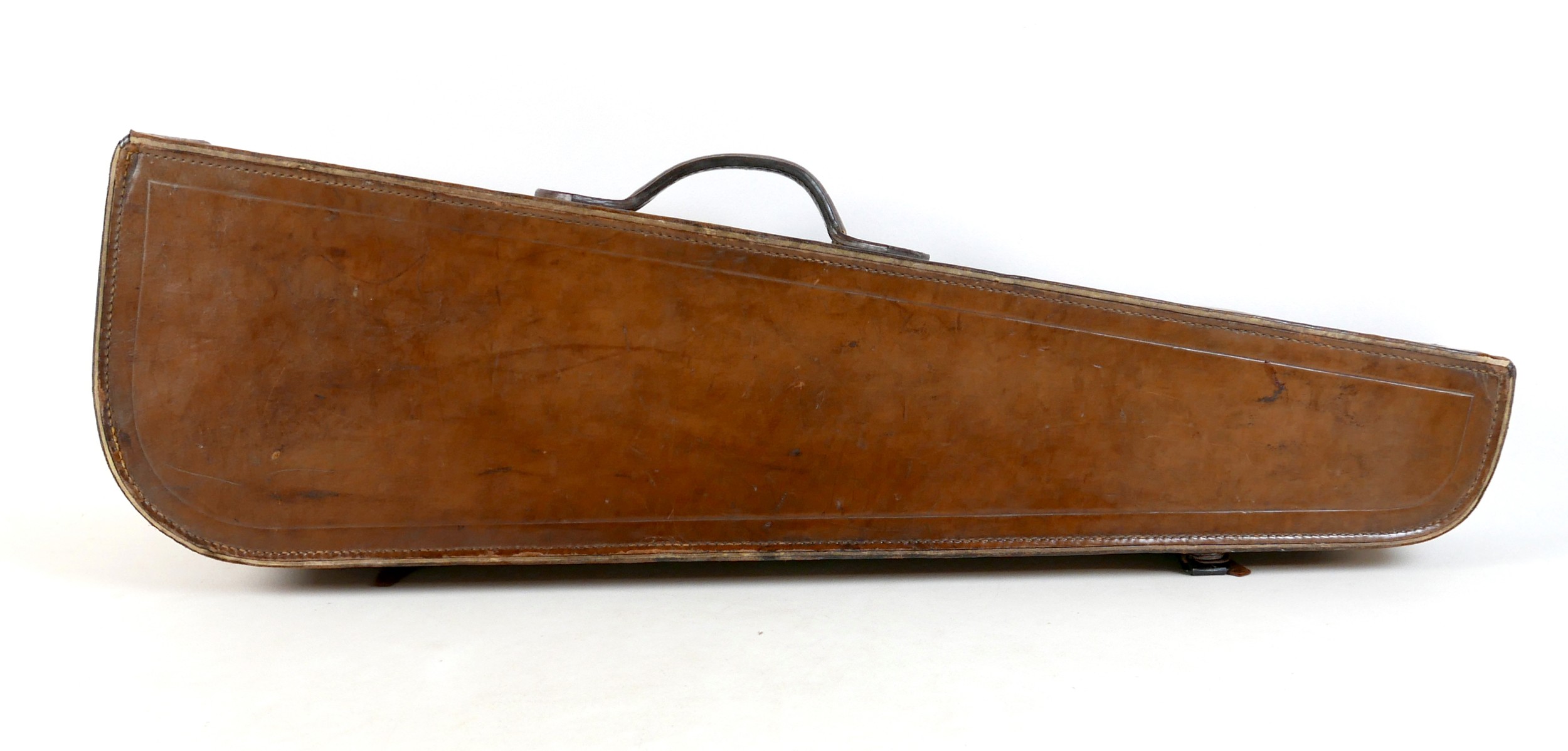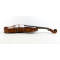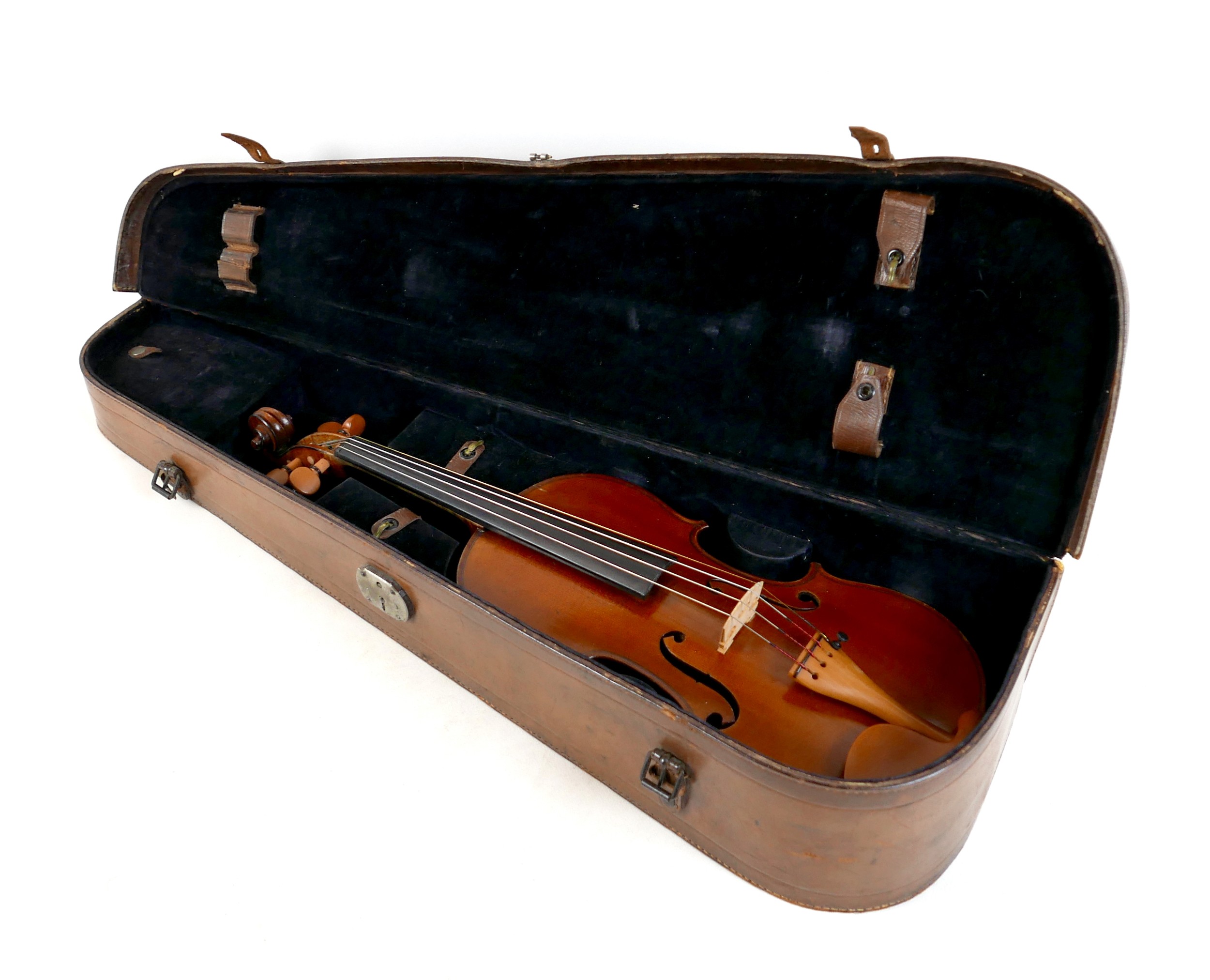 A late 19th century Mirecourt violin, two piece back, unlabelled, 35.8cm / 14 1/8", 59.5cm long overall, in brown leather carry case.
