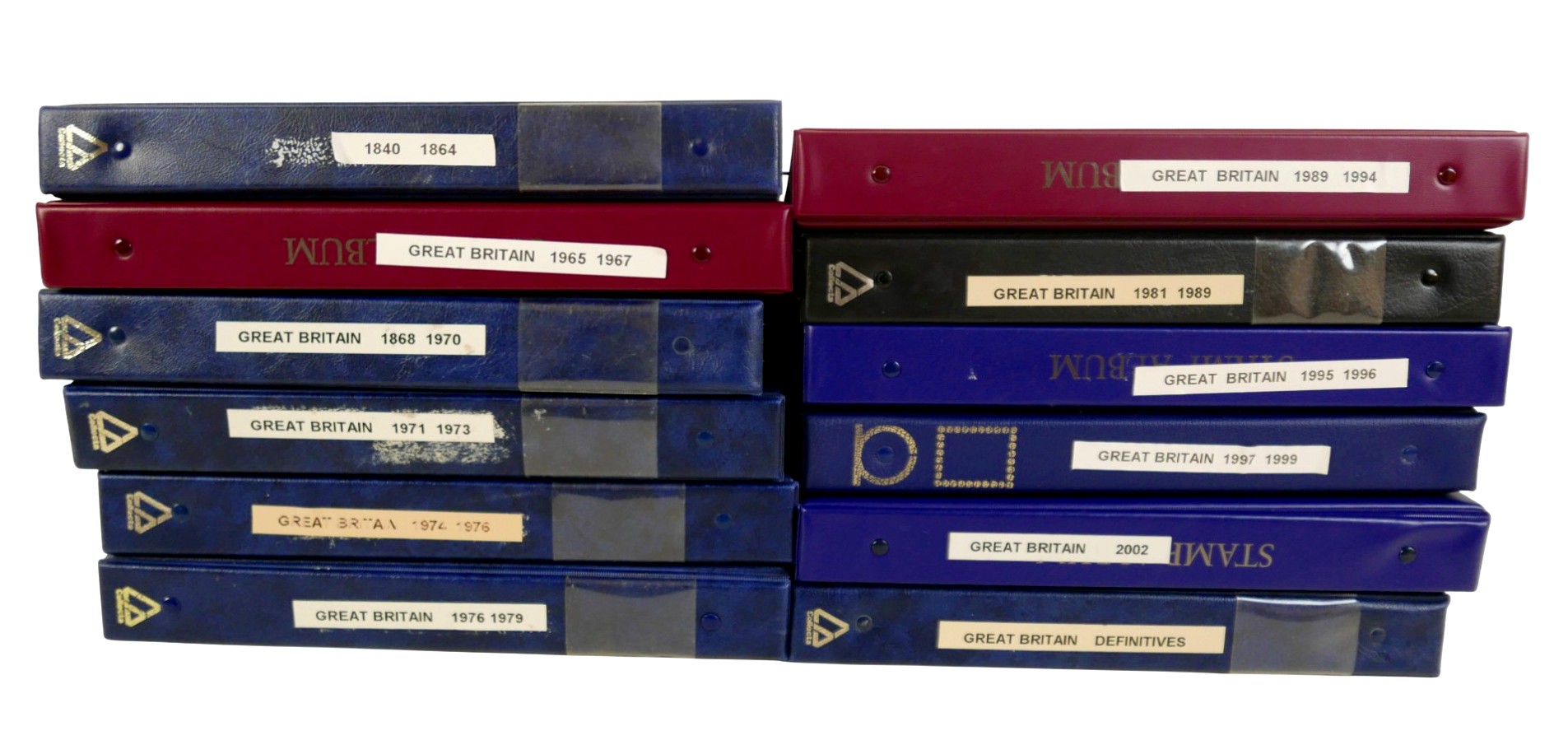 A good collection of Great Britain stamps, Queen Victoria to Elizabeth II, 1840 to 2023, including approximately 280 Penny Red, 2 Penny Black, 7 Two Pence Blue, many with FDC issue, mint, and franked versions of each stamp, later years are mostly FDC issues / franked, removed and mounted, plus some presentation examples, in 12 well organised and dated albums. (12)