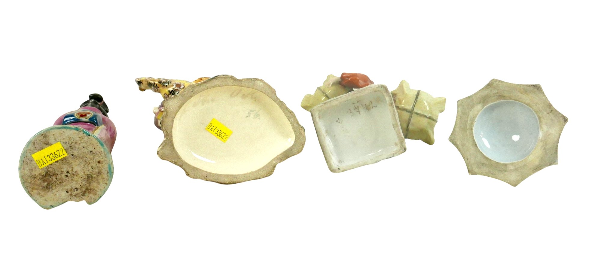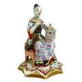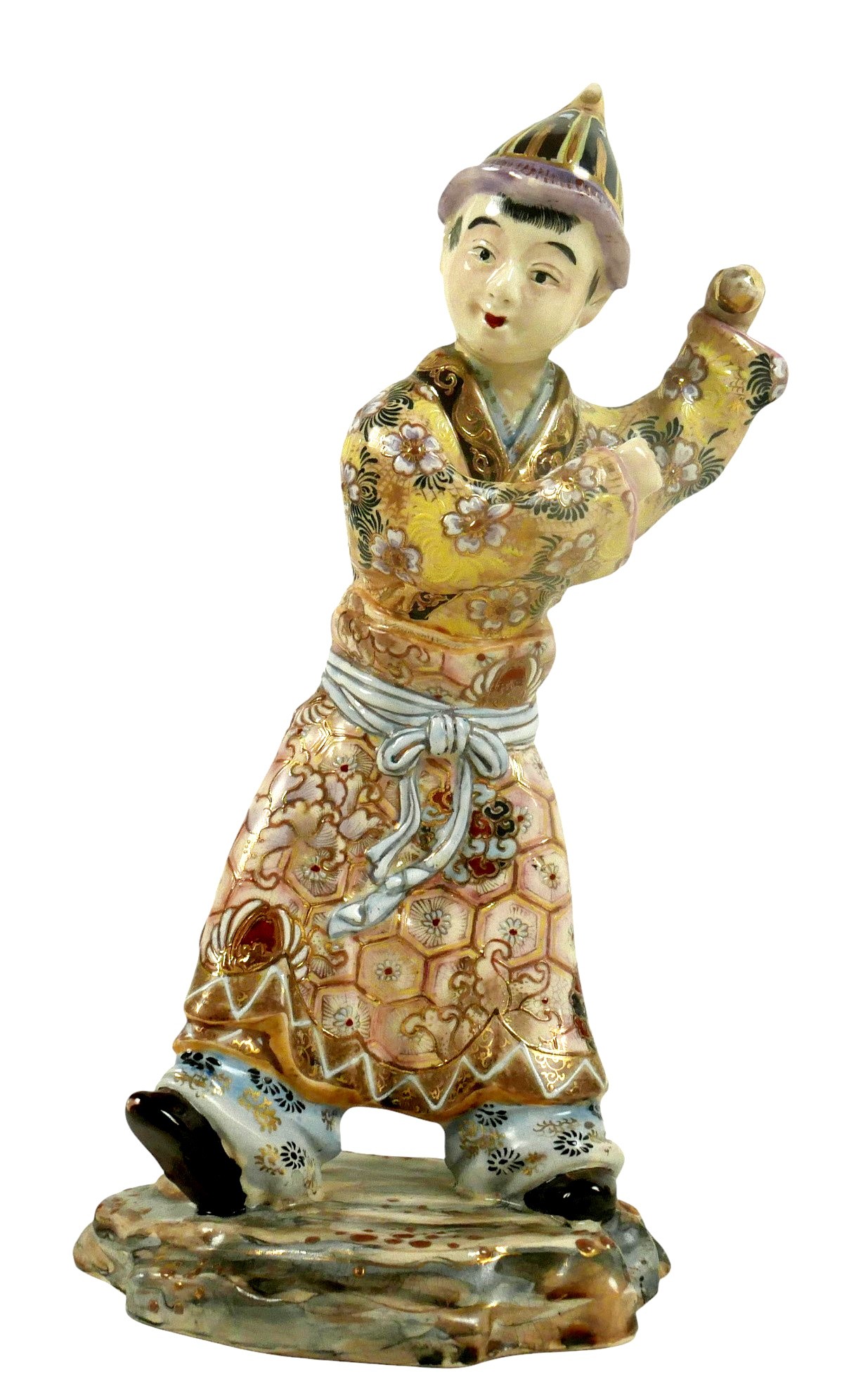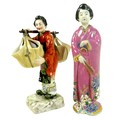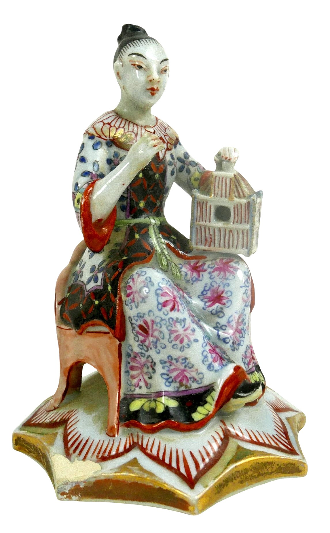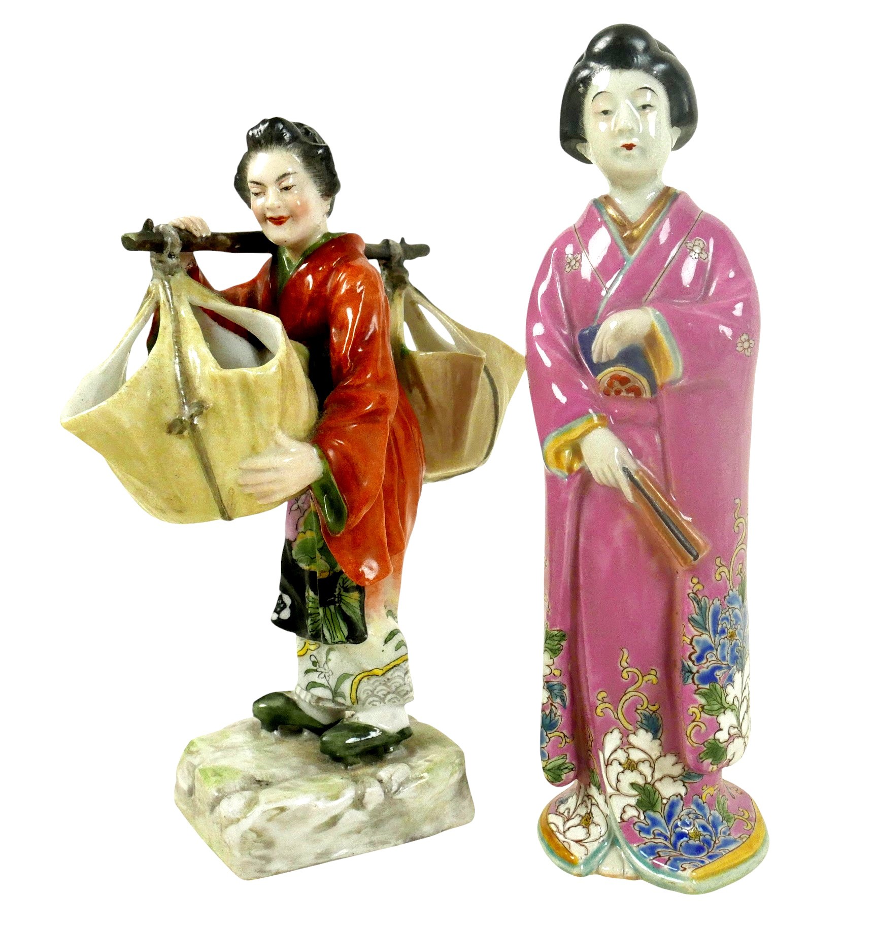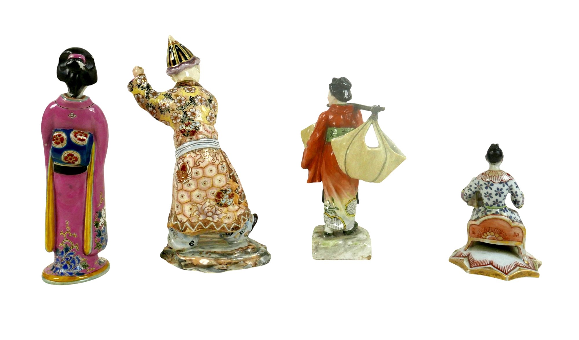 A group of four porcelain Oriental figurines; a Hochst style Chinese lady carrying her wares, with cartwheel mark to base '3742', 16 by 11 by 19cm high, a Japanese boy playing with a ball, indistinct markings to base, 13 by 9 by 23.5cm high, a seated Chinese lady holding a birdcage, raised upon an octagonal form base, 8.5 by 13cm high, and a Japanese lady in pink kimono, unmarked base, 6.1 by 6.3 by 21.5cm high. (4)