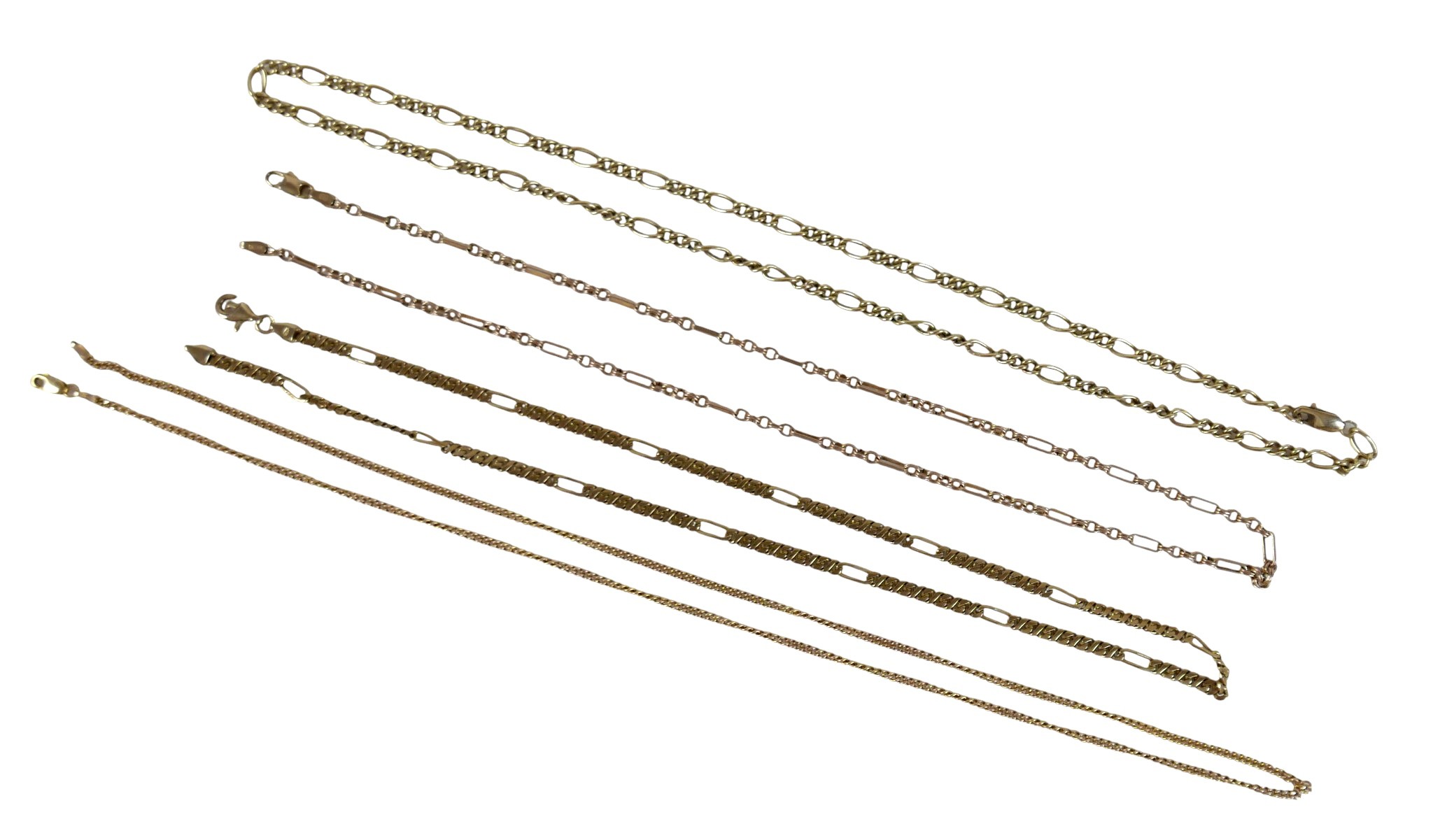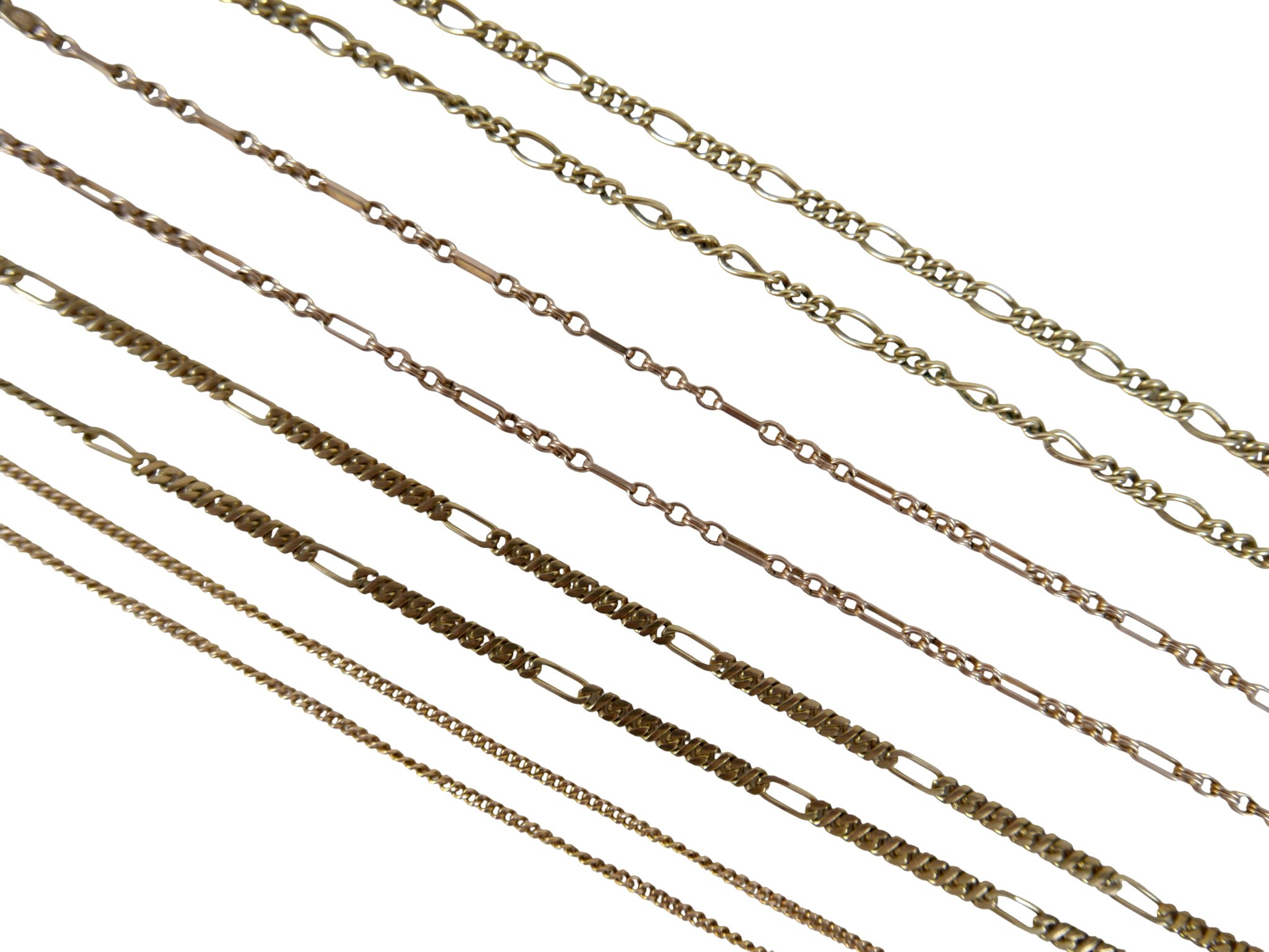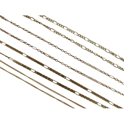 A collection of four 9ct yellow gold necklaces longest 56cm,...