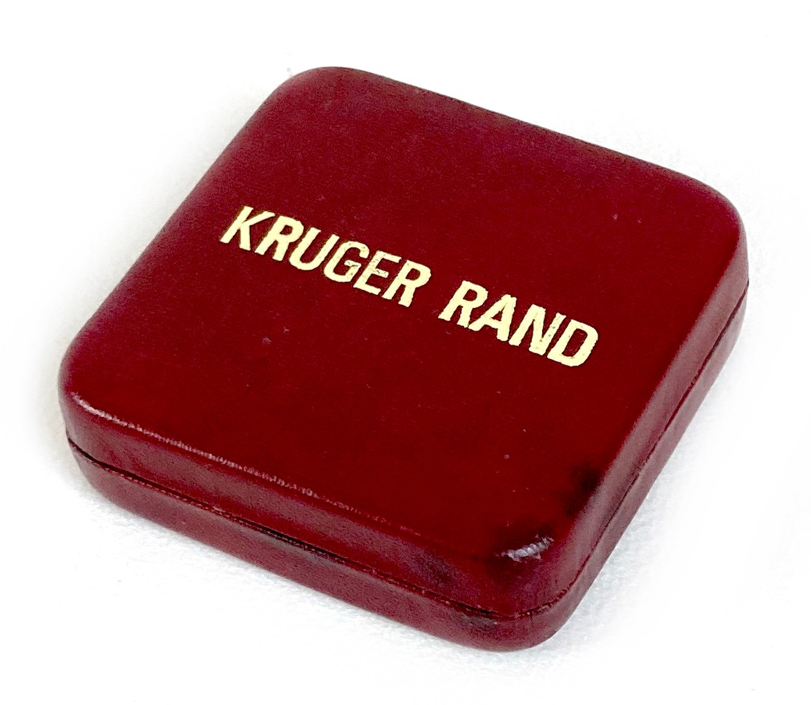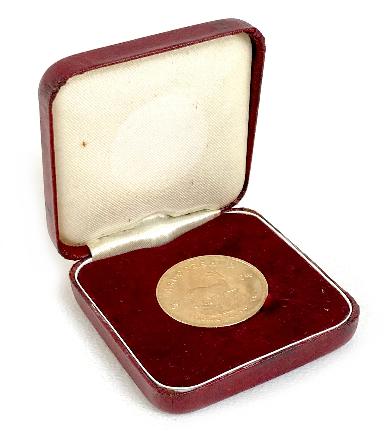 A 22ct gold South African Krugerrand, 1974, 'Fyngoud 1oz Fine Gold', 32.5mm, 33.8g, in burgundy coloured fitted case.