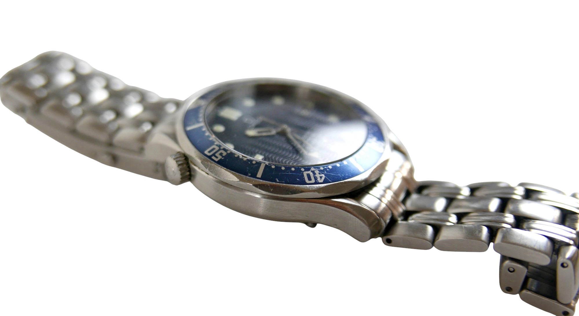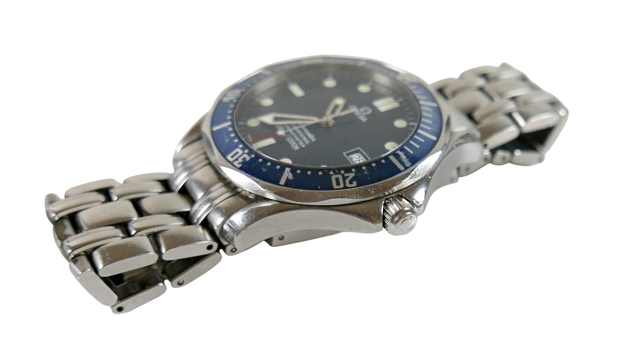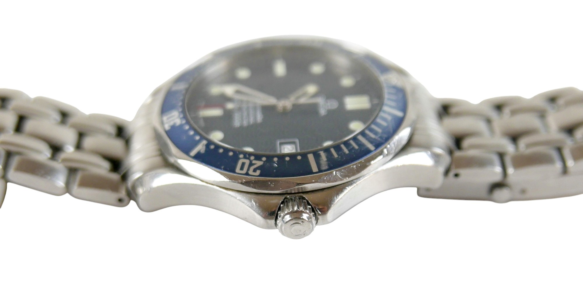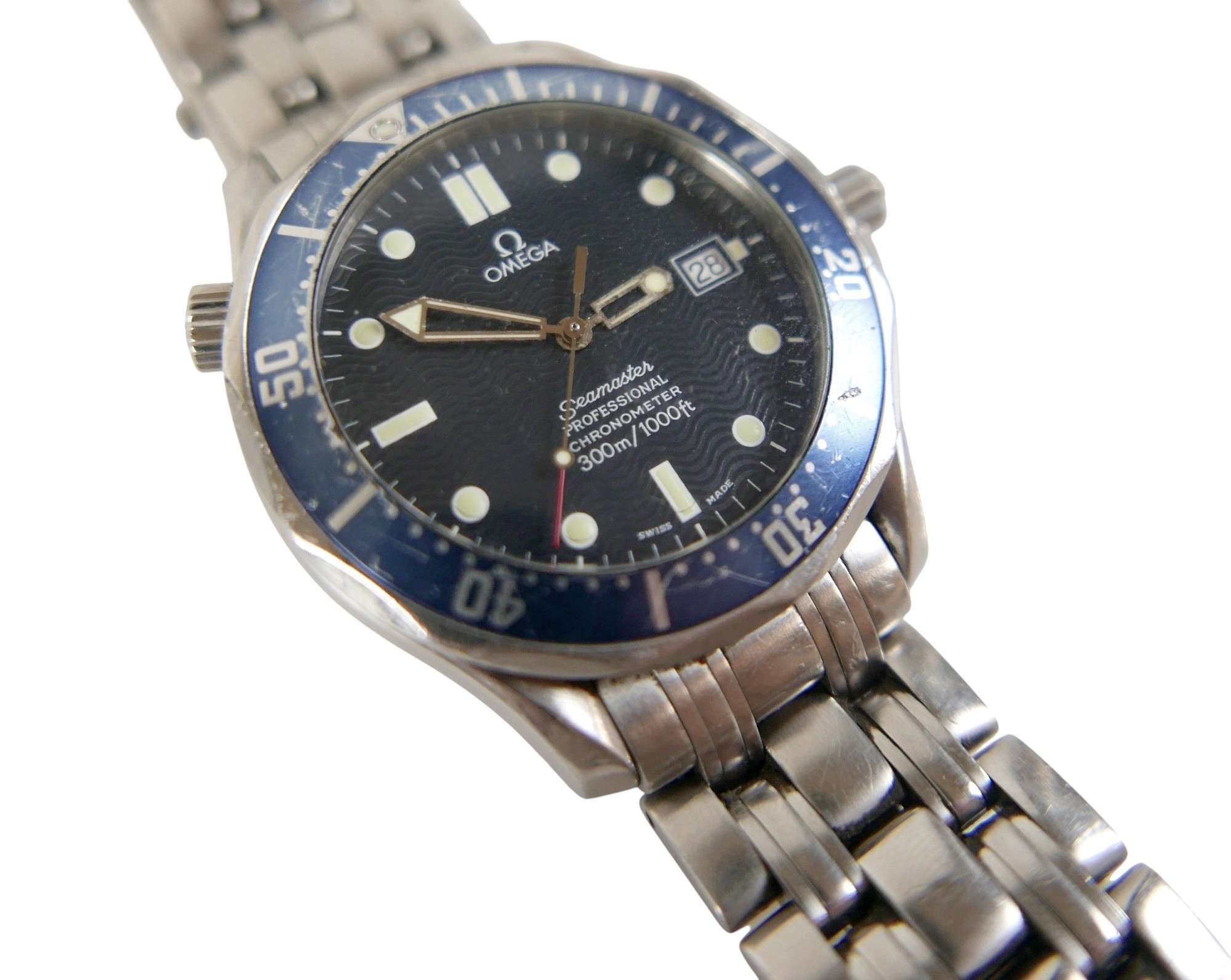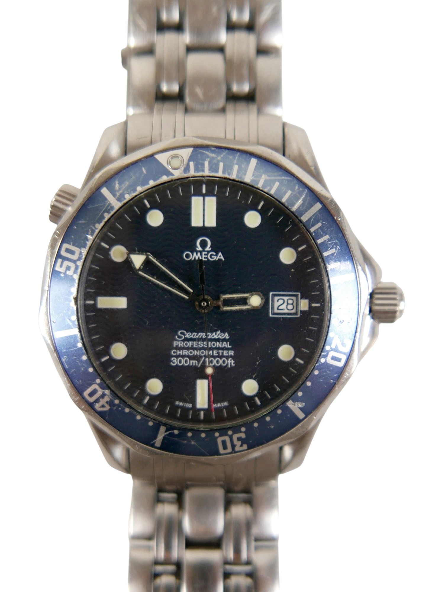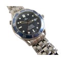 An Omega Seamaster Professional Chronometer 300m/1000ft stainless steel gentleman's wristwatch, model 168.1623, circa 2000, circular navy dial with wave detail, luminous hour dot and baton markers, date aperture, rotating blue bezel, 23 jewels automatic movement, cal. 1120, on a stainless steel 825 strap with deployment clasp, stamped '32S 1503/825', case 42mm, 156.5g.