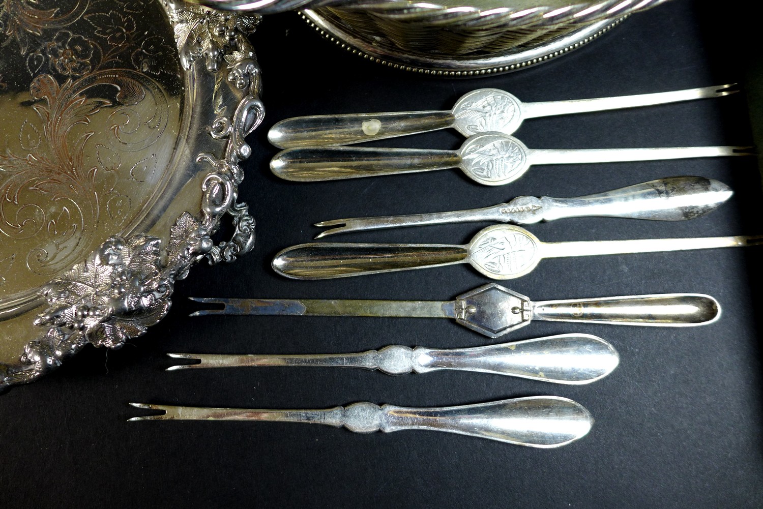 A collection of silver plated items, including a large oval galleried silver plated tray with four bun feet, 60.5 by 40.7 by 7cm high, a coffee pot, 24 by 14 by 19.7cm high, with spare finial, four white metal spirit labels two 'Gin', largest with scroll form borders and broken chain, 5 by 3cm, 'Whiskey' of Hexagonal form, 4.5 by 2.8cm, with broken chain, and Brandy, 3 by 1.8cm, a wooden canteen with some ivorine handled flatware inside. (1 box)