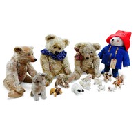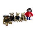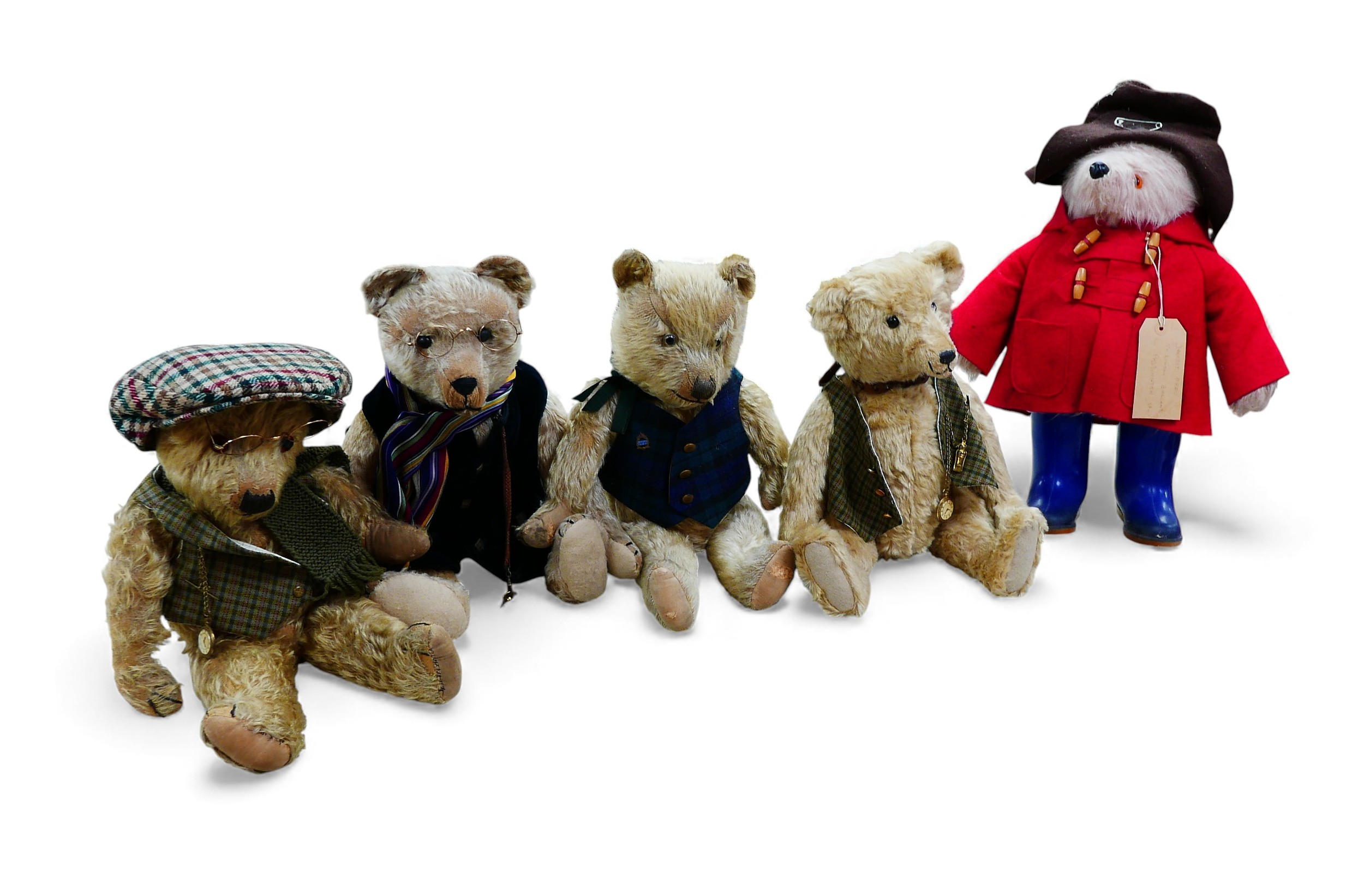 A Gabrielle Designs Paddington bear, with Dunlop boots, a homemade name label, 46cm high, and four other bears, including an Atlantic Bears teddy with waistcoat and pocket watch and whistle accessories. (1 box)