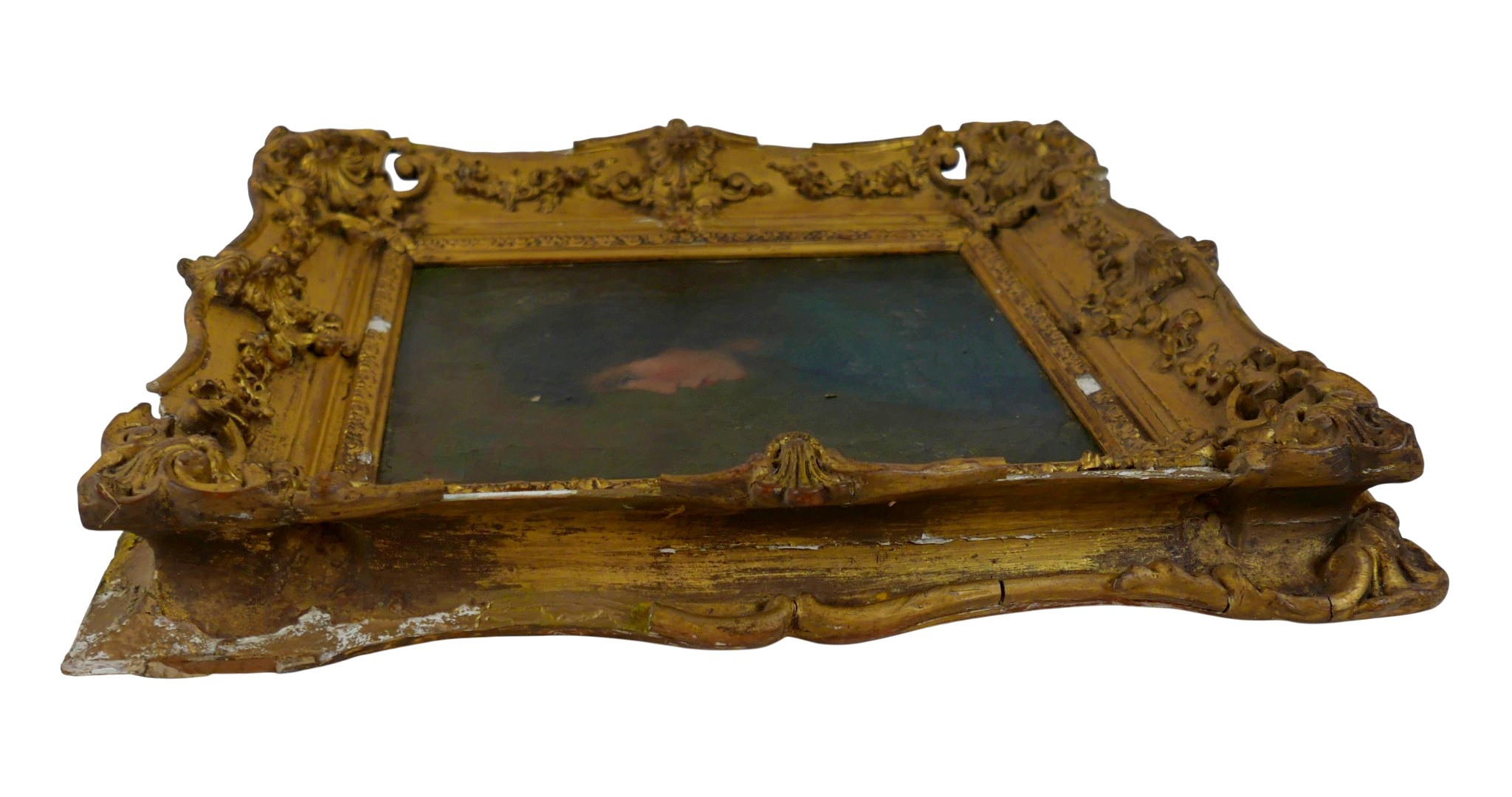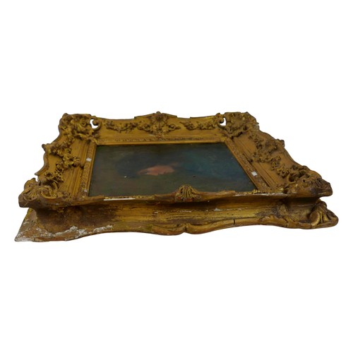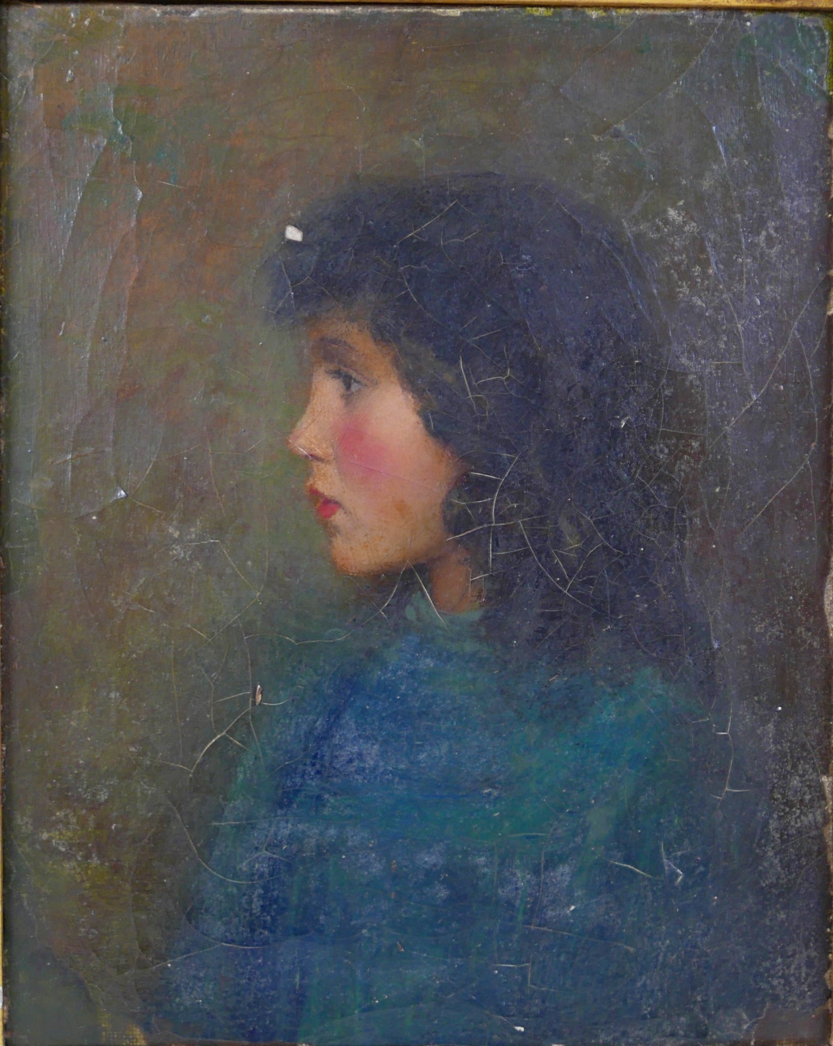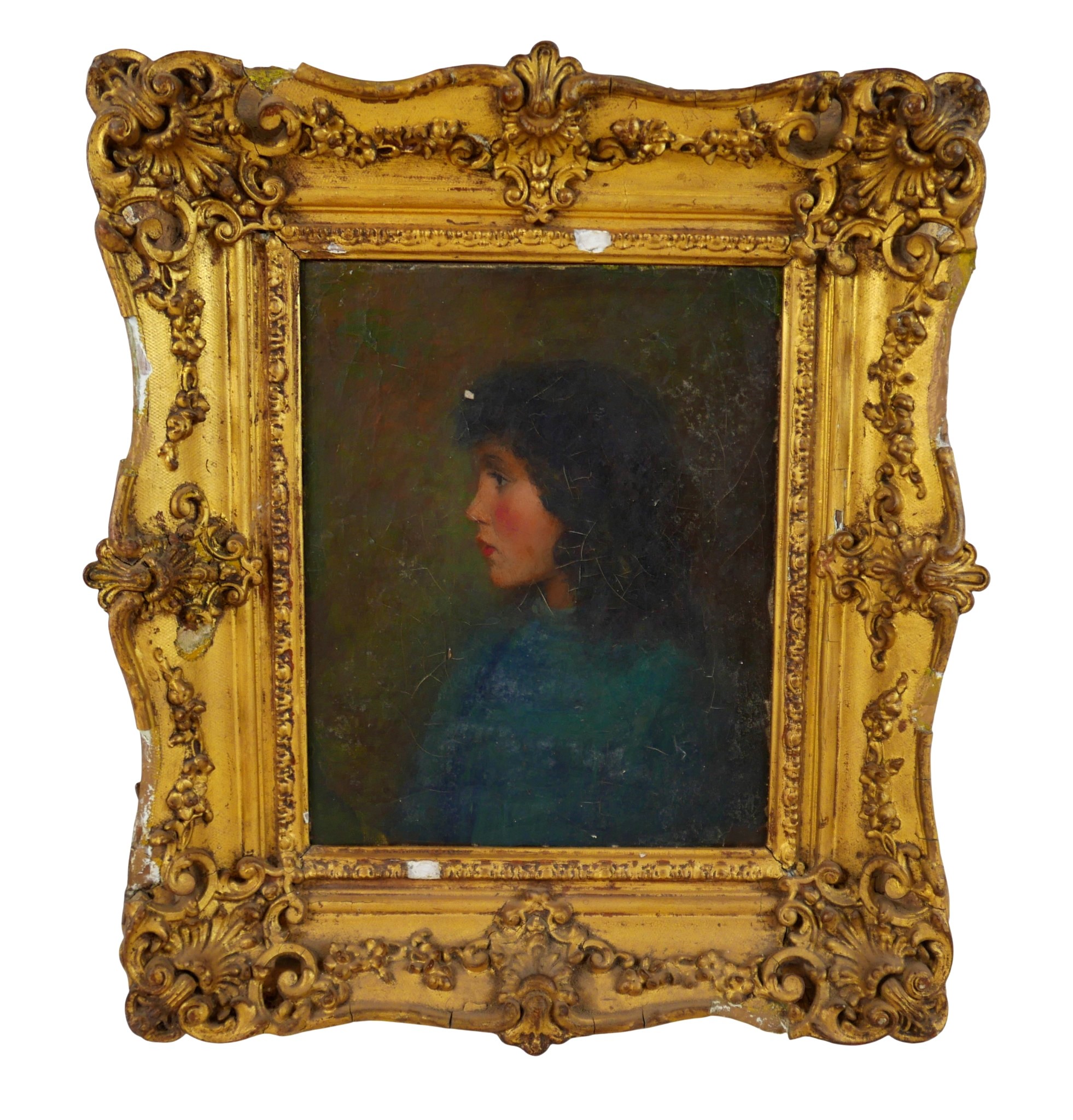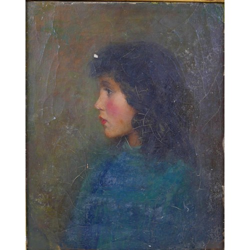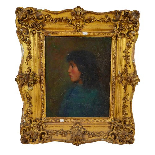 A Victorian half length portrait of a young lady wearing a blue dress, facing left, oil on canvas, signed to back stretcher 'Augustus John 1896', possibly Augustus John (Welsh, 1878-1961), 25 by 20cm, in a gilt swept frame 36 by 41 by 7cm.