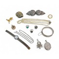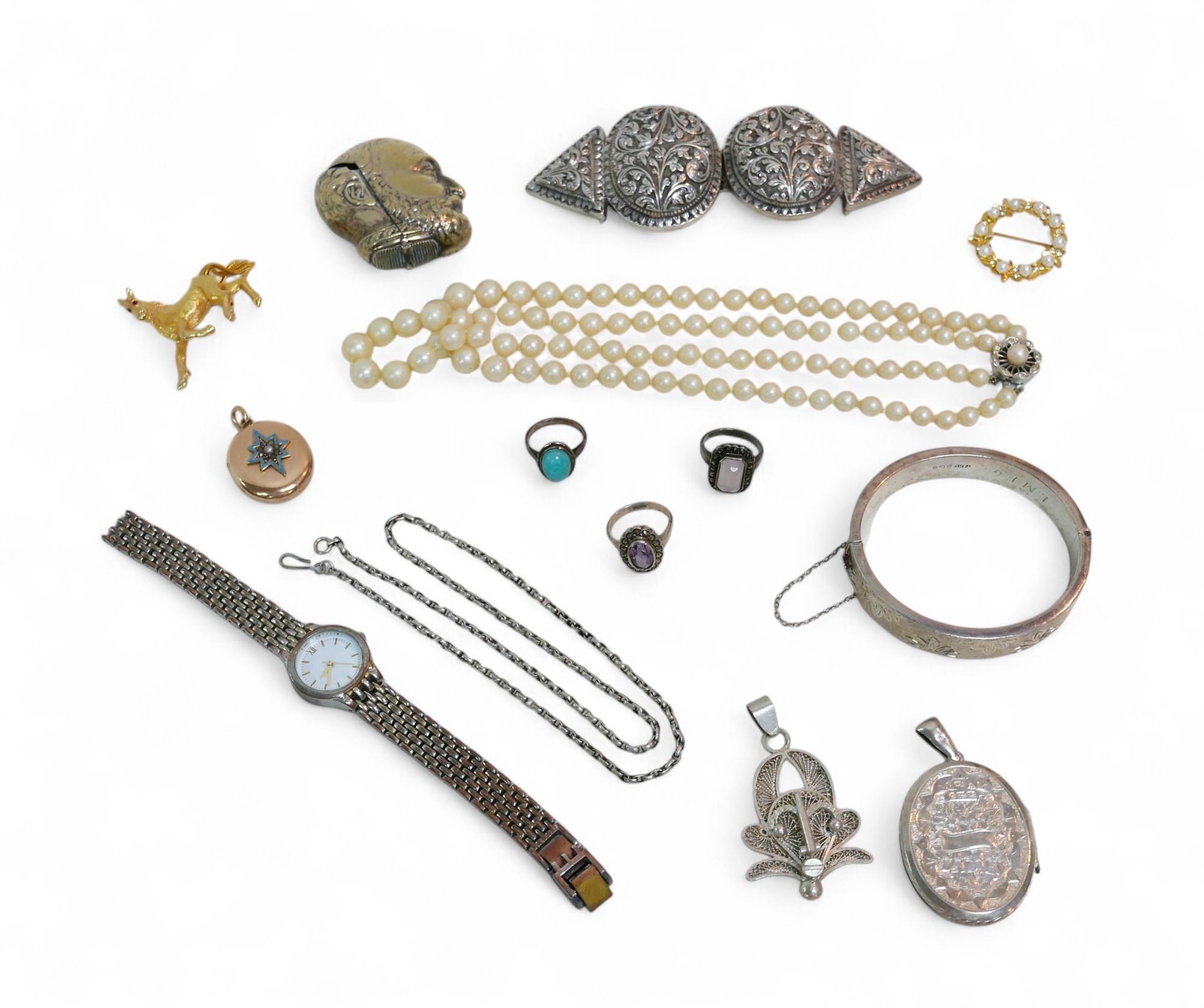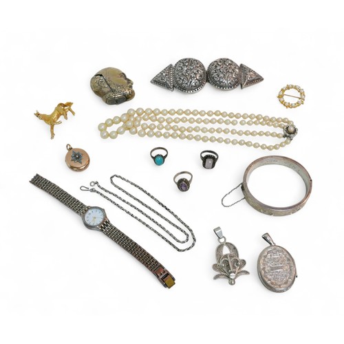 A group of silver and costume jewellery, including a silver bangle and locket, 1.6toz, together with a white metal buckle with profuse foliate design. (1 bag)
