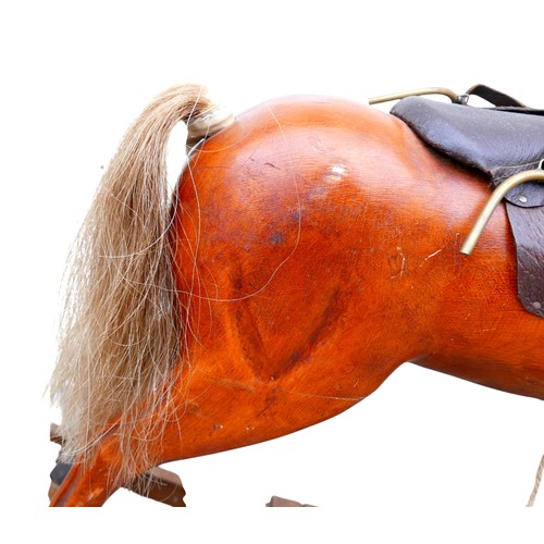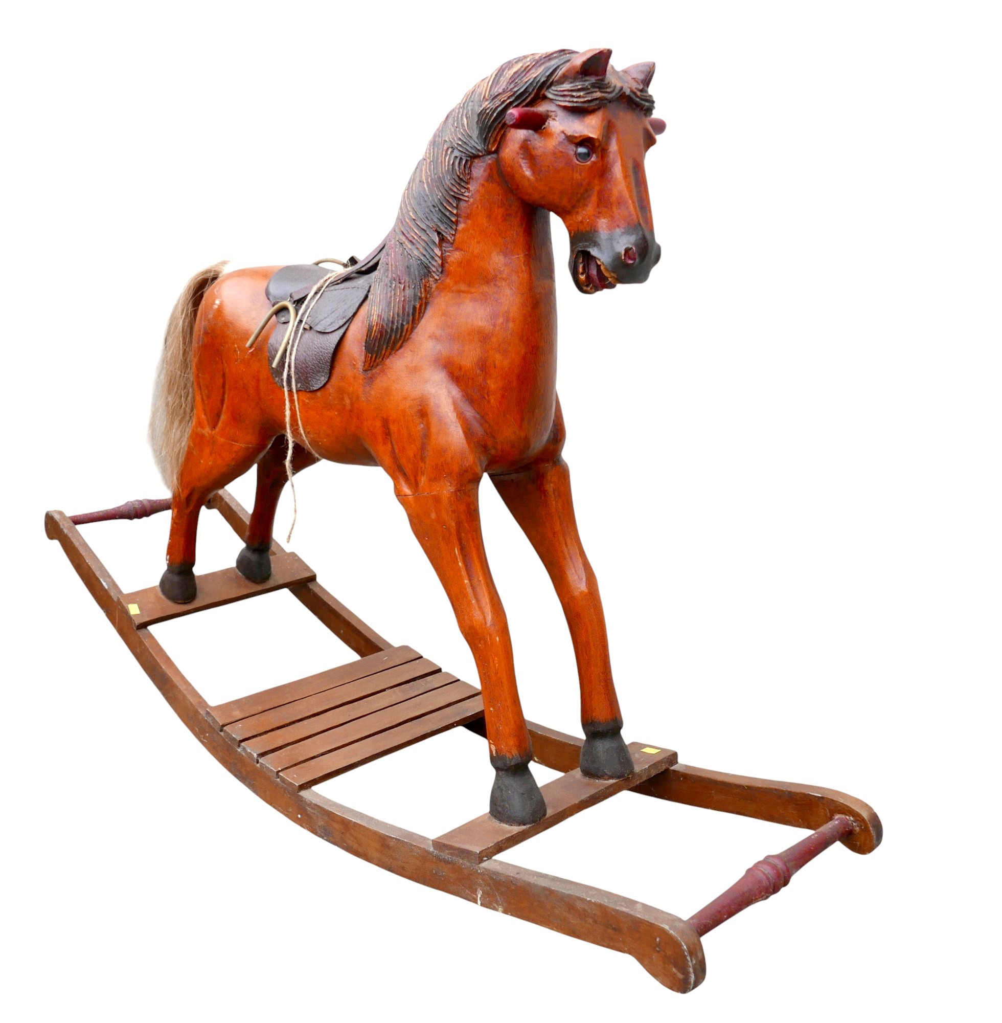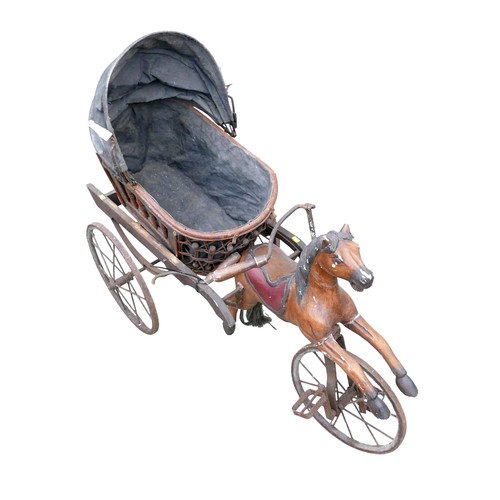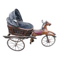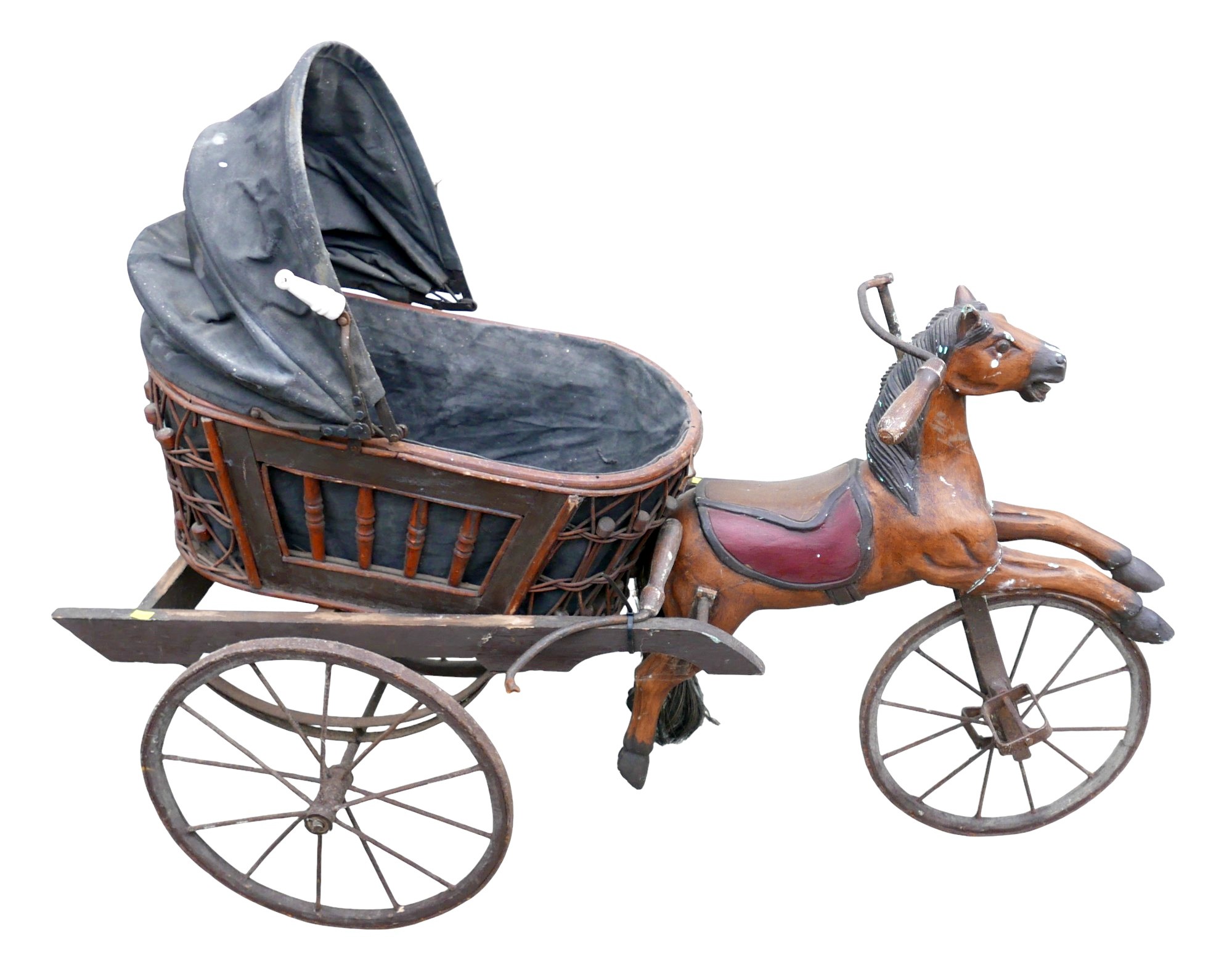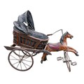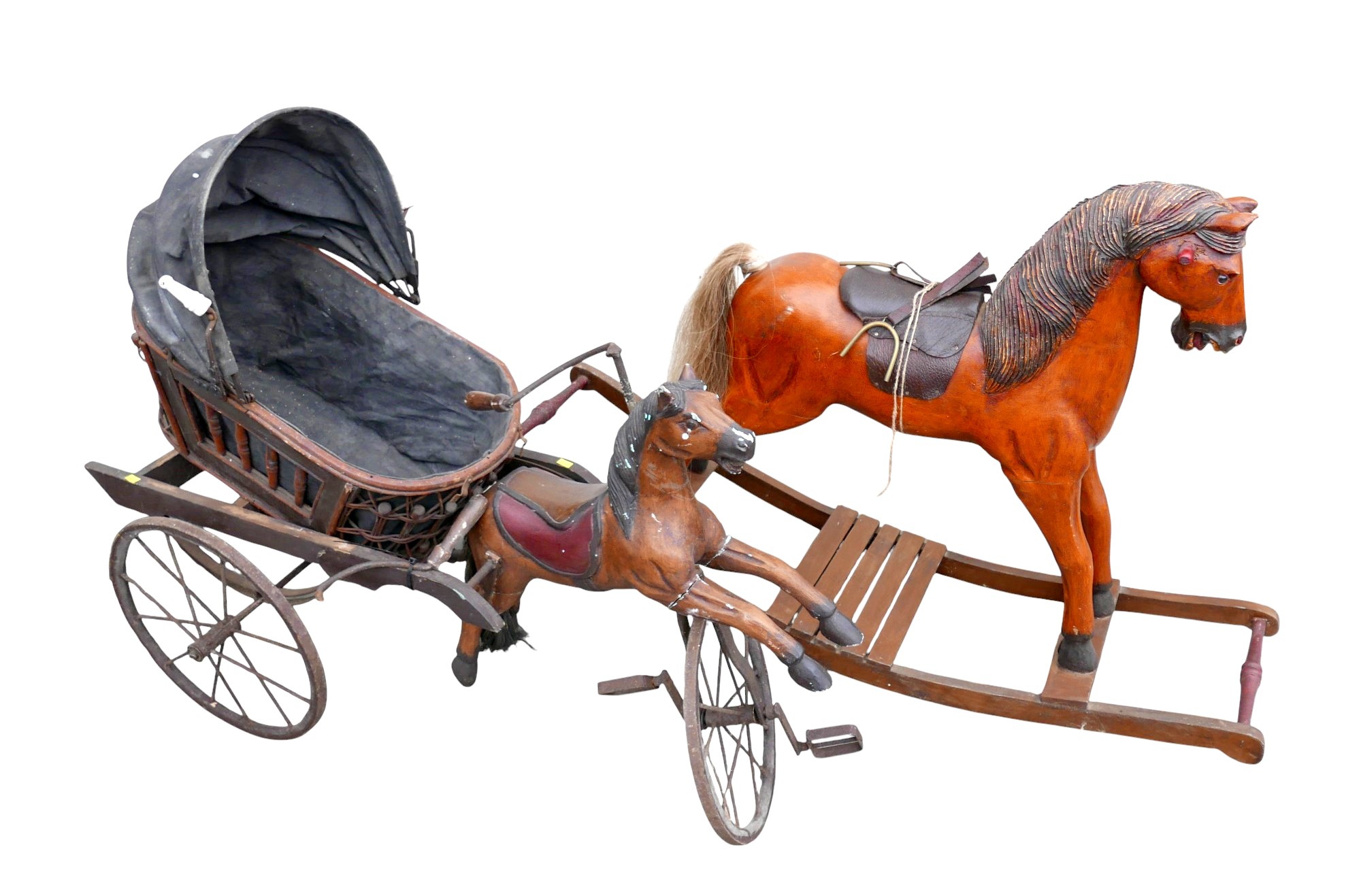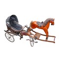 A wooden rocking horse, together with a child's horse and buggy, both a/f in need of restoration, horse measures 105 by 20 by 80cm high. (2)