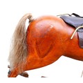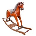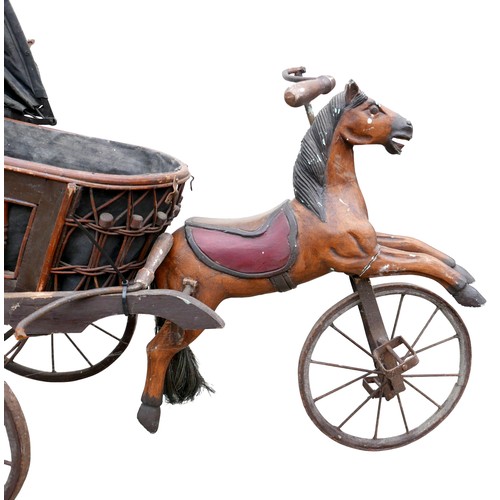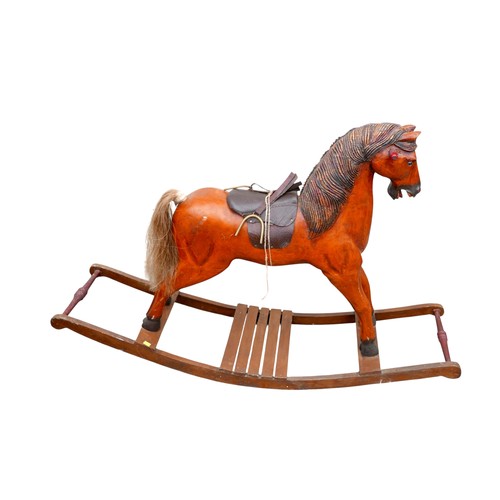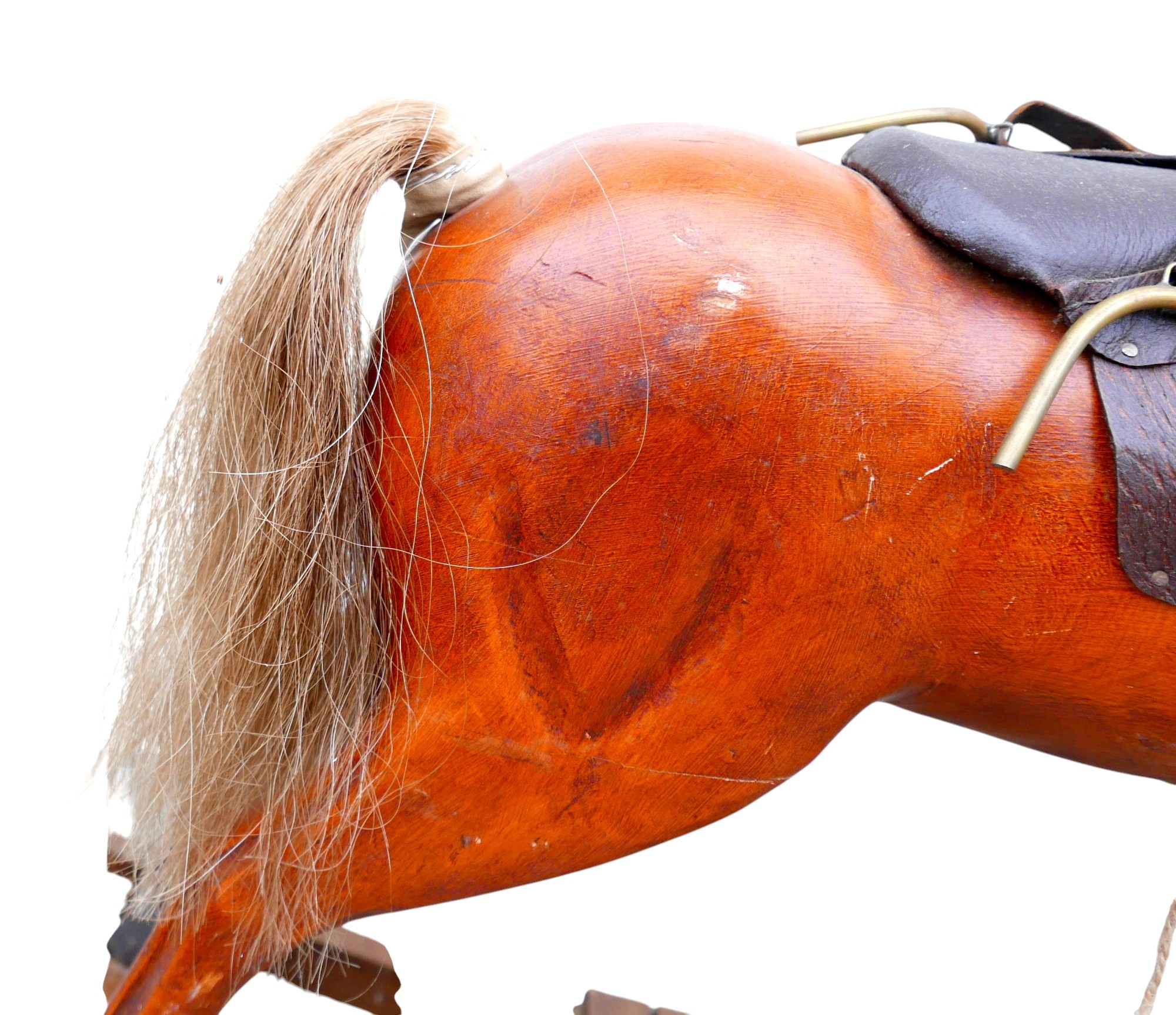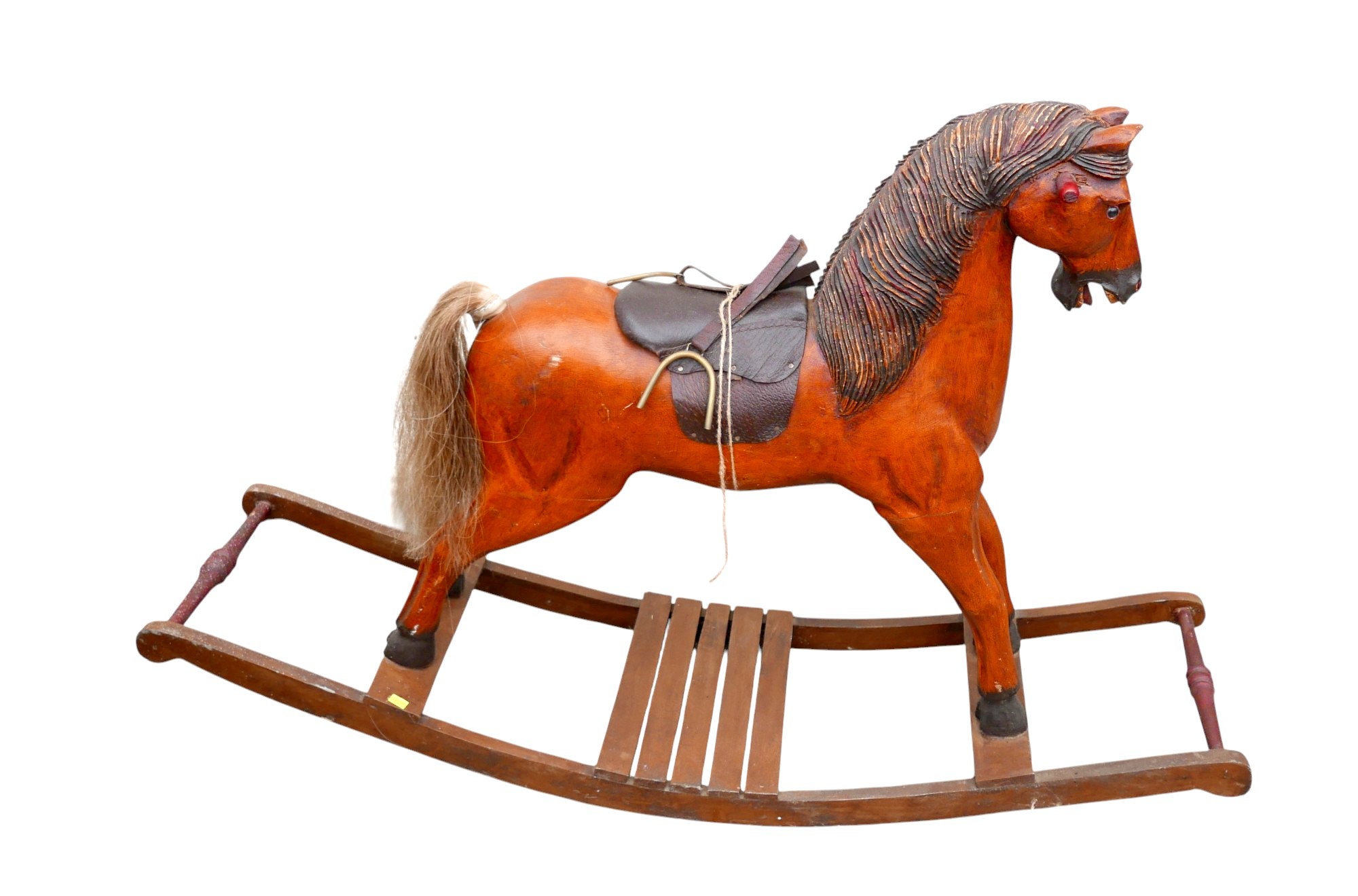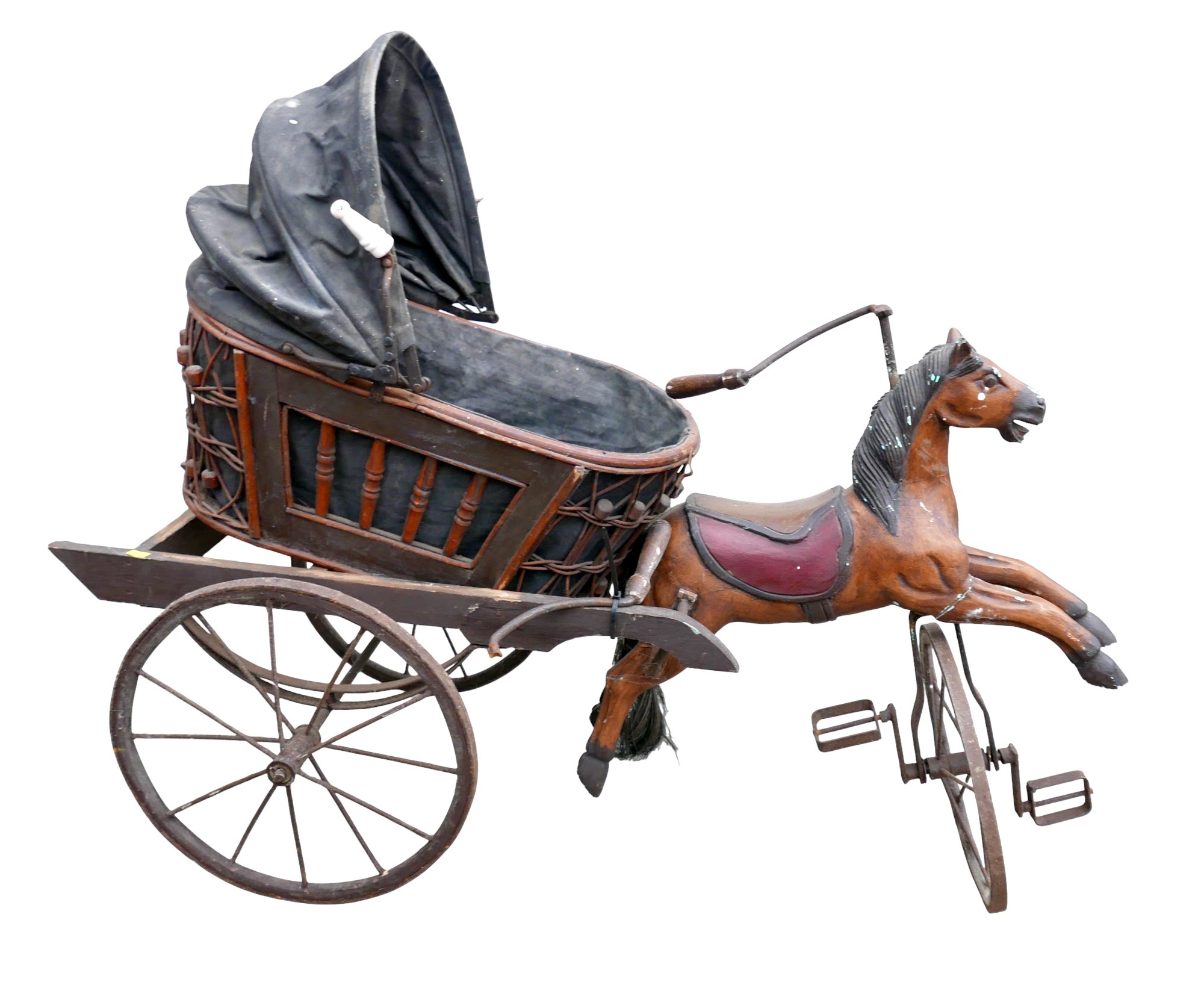 A wooden rocking horse, together with a child's horse and buggy, both a/f in need of restoration, horse measures 105 by 20 by 80cm high. (2)