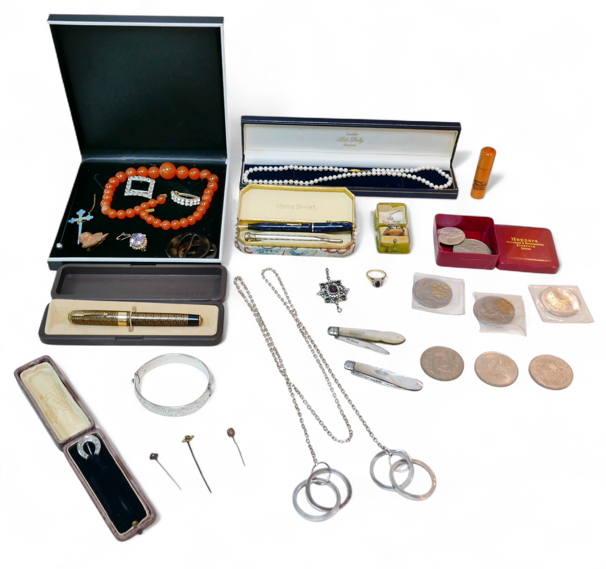 A Conway Stewart 14ct gold nibbed fountain pen and a collection of costume jewellery, including some silver. (1 bag)