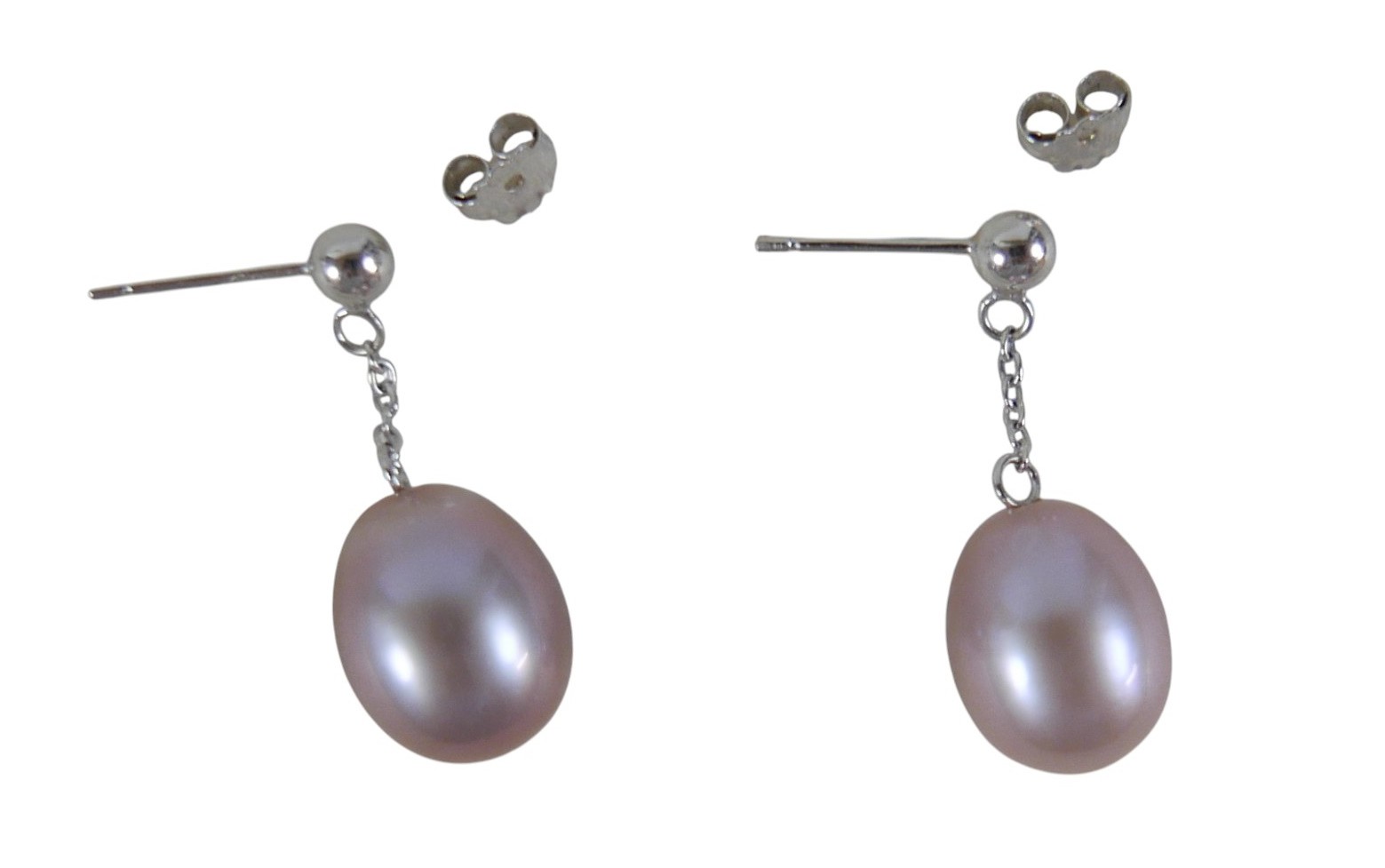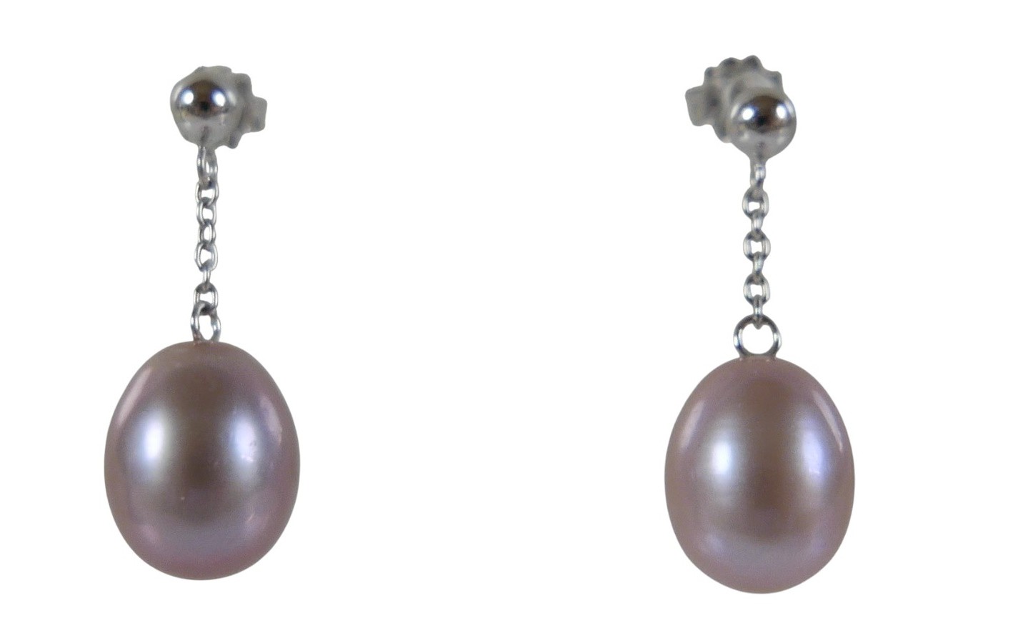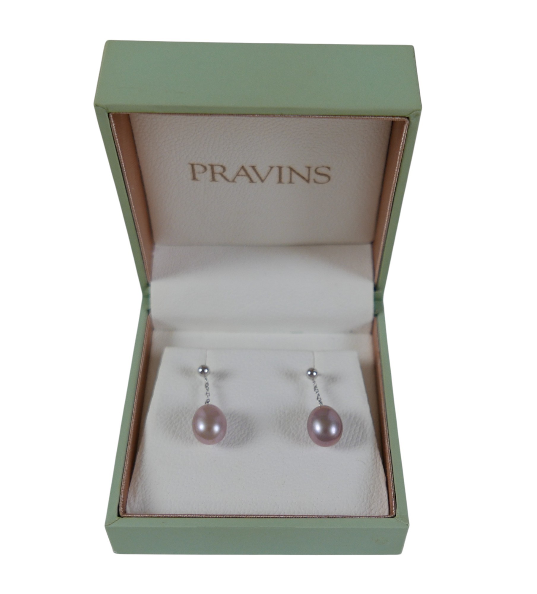 A pair of 18ct white gold pearl earrings retailed by Pravins, pearls have a pink hew measuring 8 x 10mm on a fine chain and stud fittings.