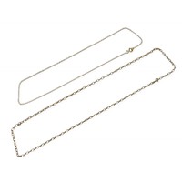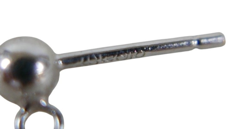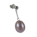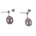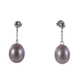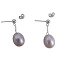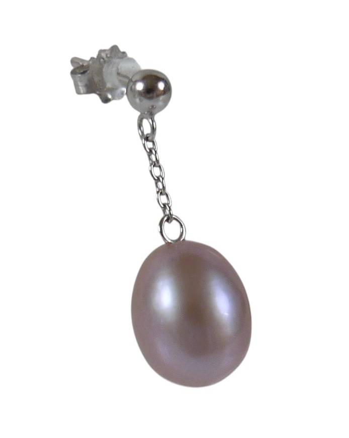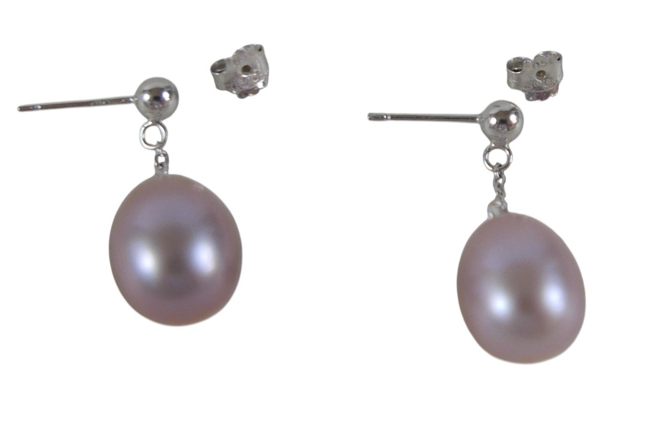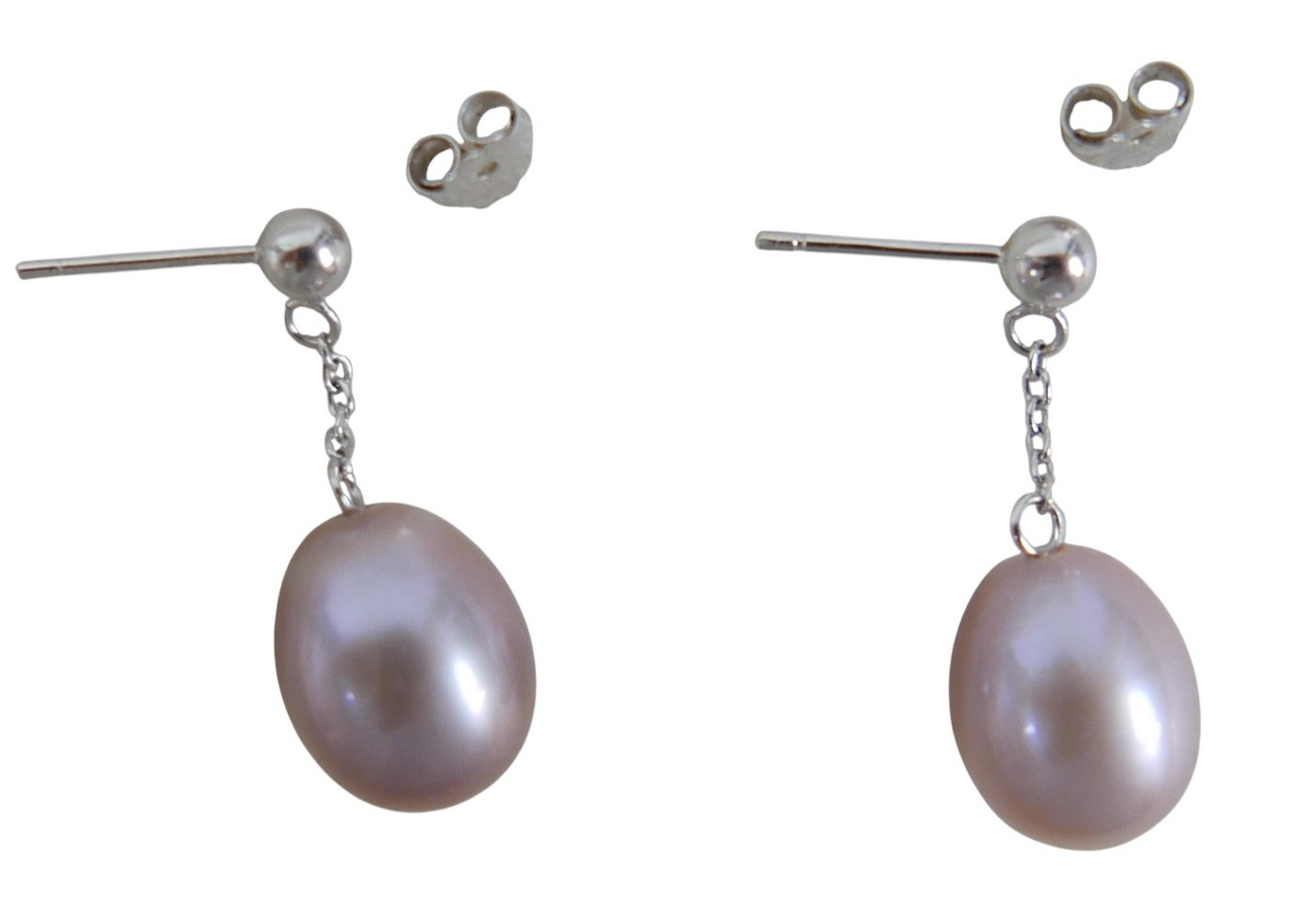 A pair of 18ct white gold pearl earrings retailed by Pravins, pearls have a pink hew measuring 8 x 10mm on a fine chain and stud fittings.