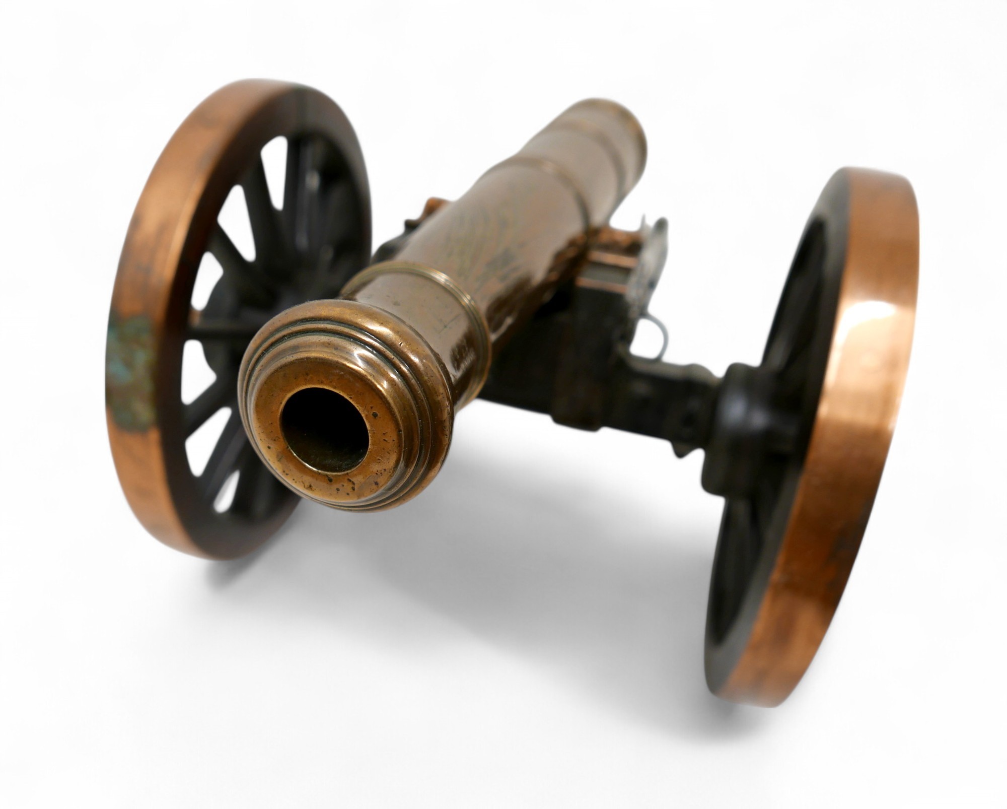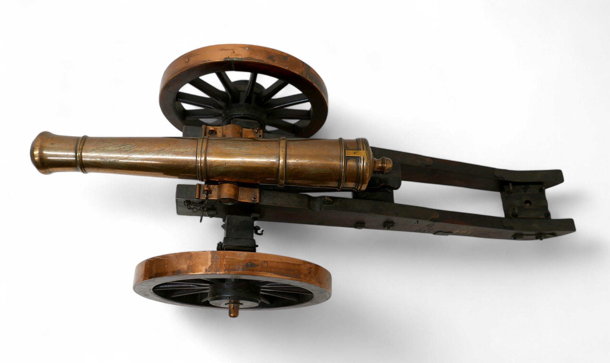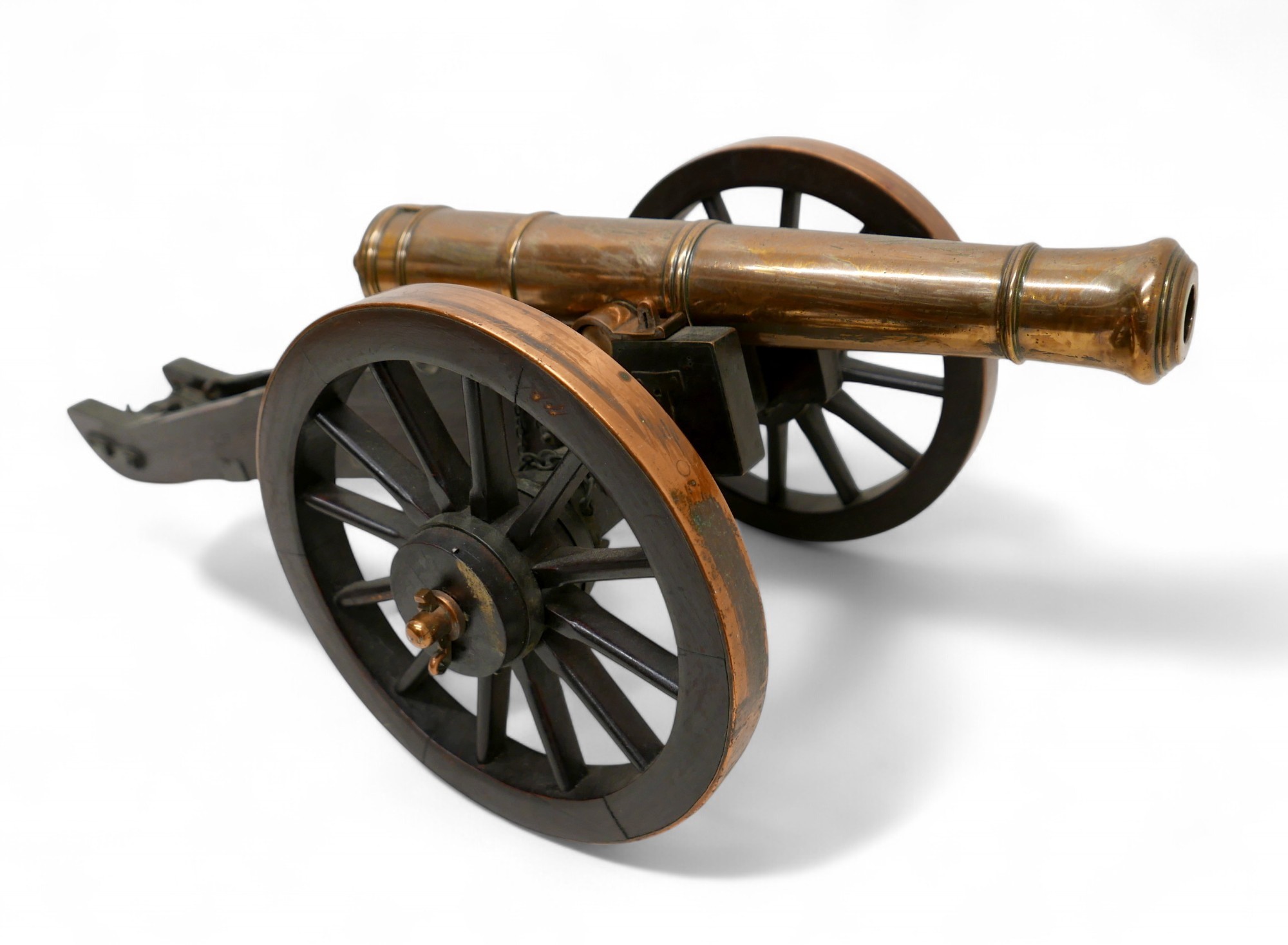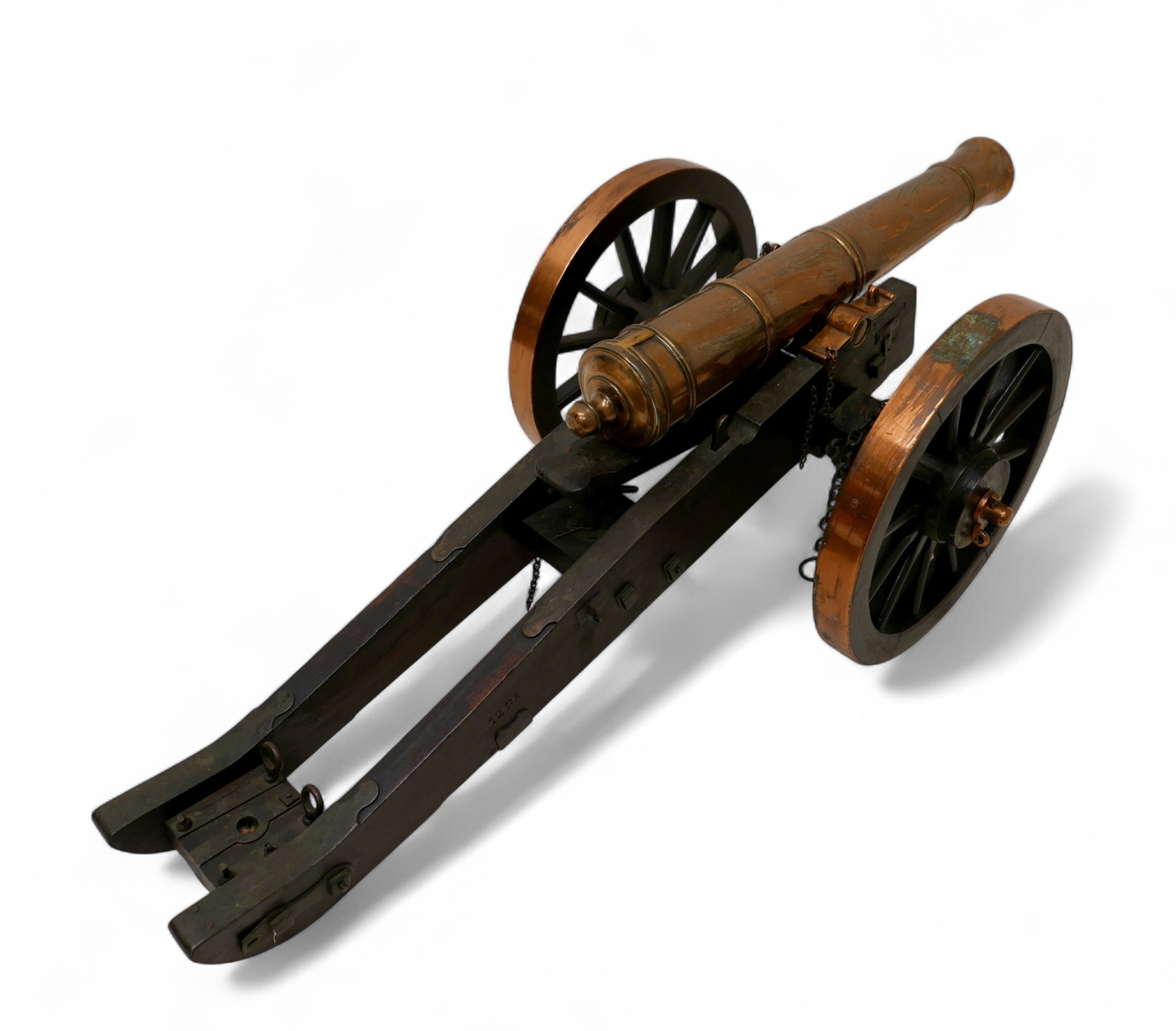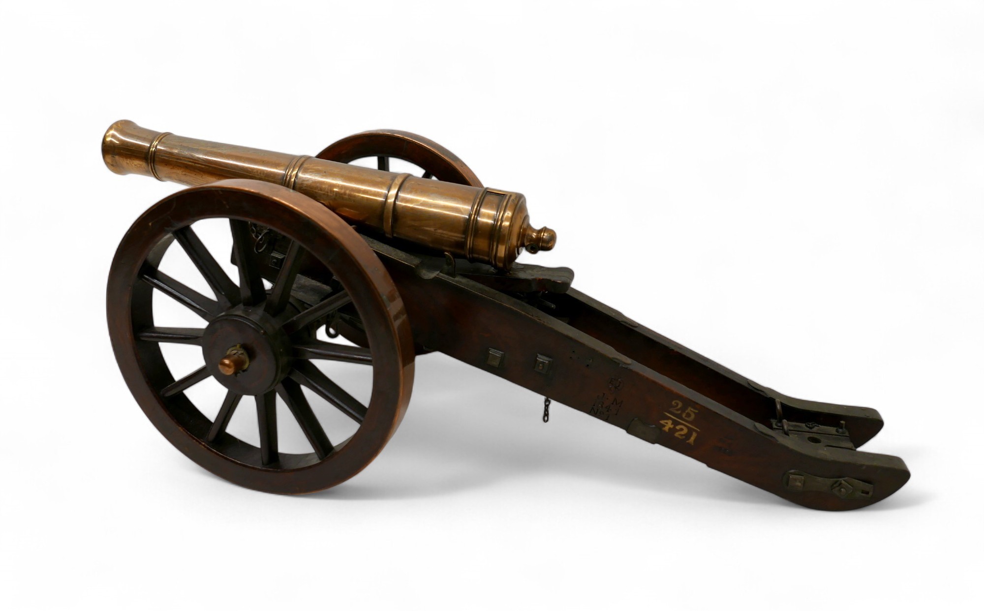 A Fine Bronze East India Company Model Of A 12-Pounder Cannon Dated 1841 Of tapering multi-stage form with raised mouldings and bell-shaped muzzle, knob-shaped cascabel-button, on original iron and copper mounted field carriage with cambered spoked wheels, elevating screw, with East India Company heart mark below a 4, dated 1841 No1 J.M, MA 6778, barrel 44cm, total 73 by 36 by 27cm high.