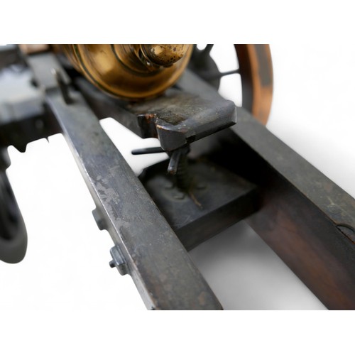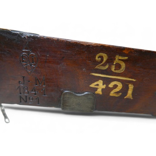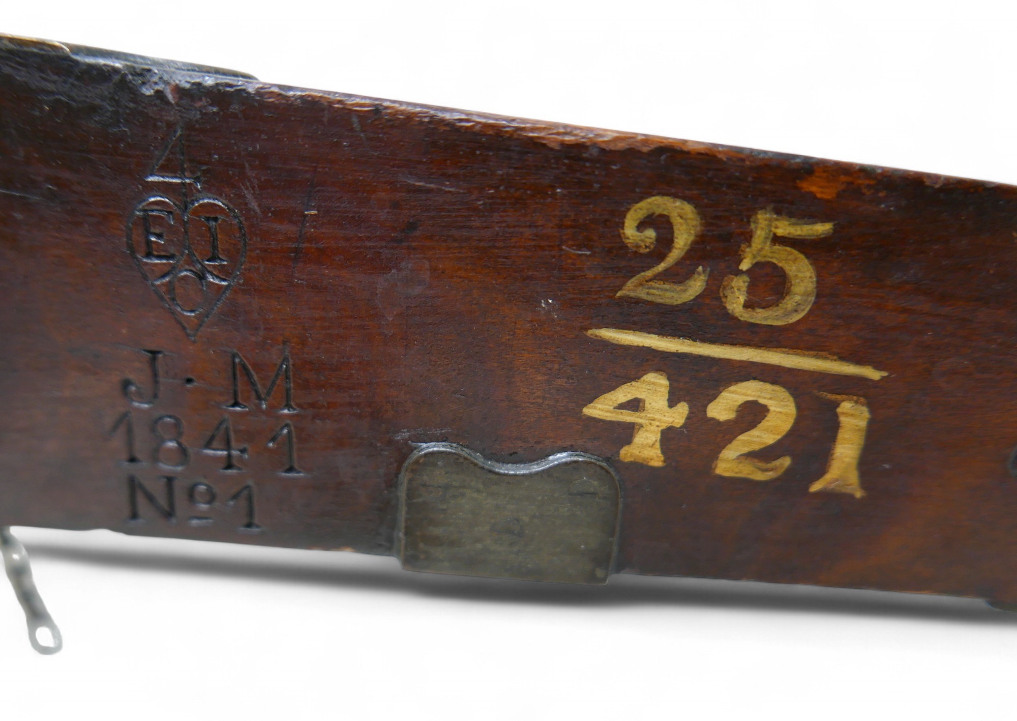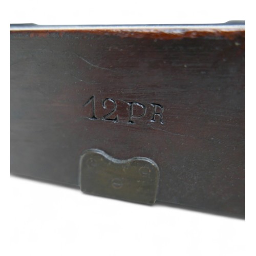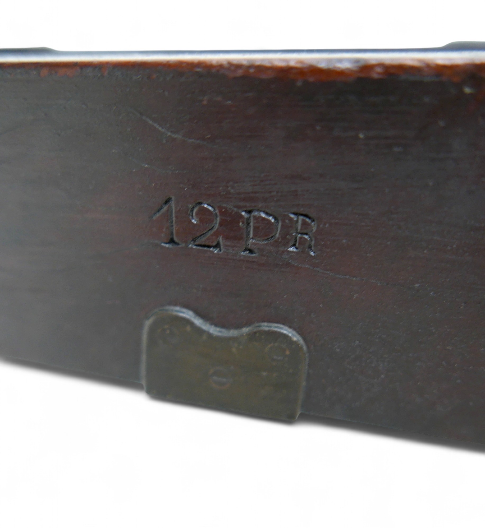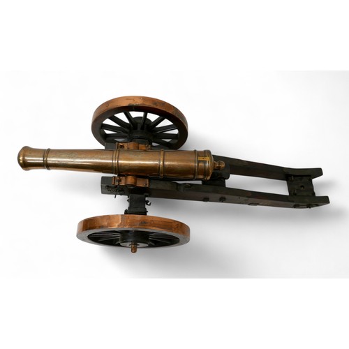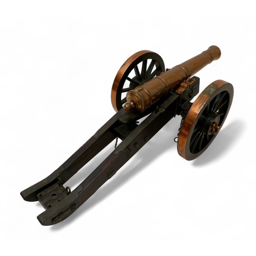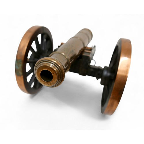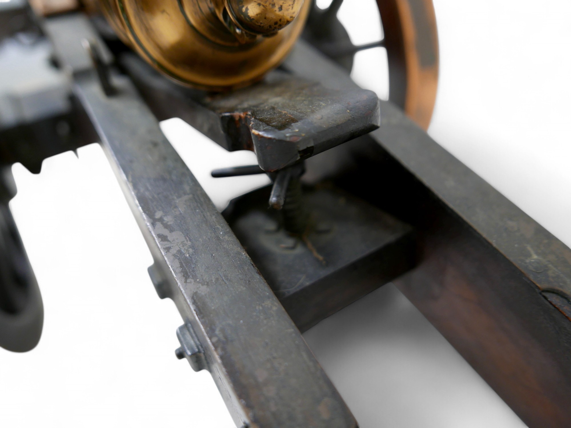 A Fine Bronze East India Company Model Of A 12-Pounder Cannon Dated 1841 Of tapering multi-stage form with raised mouldings and bell-shaped muzzle, knob-shaped cascabel-button, on original iron and copper mounted field carriage with cambered spoked wheels, elevating screw, with East India Company heart mark below a 4, dated 1841 No1 J.M, MA 6778, barrel 44cm, total 73 by 36 by 27cm high.