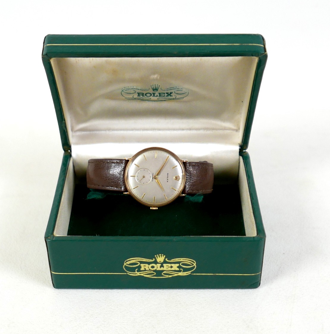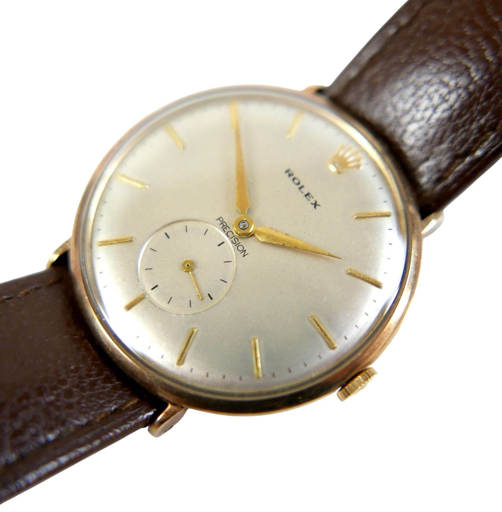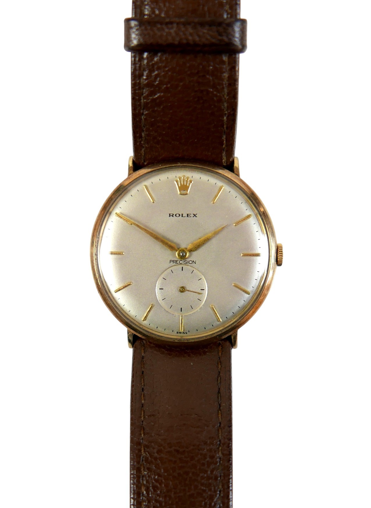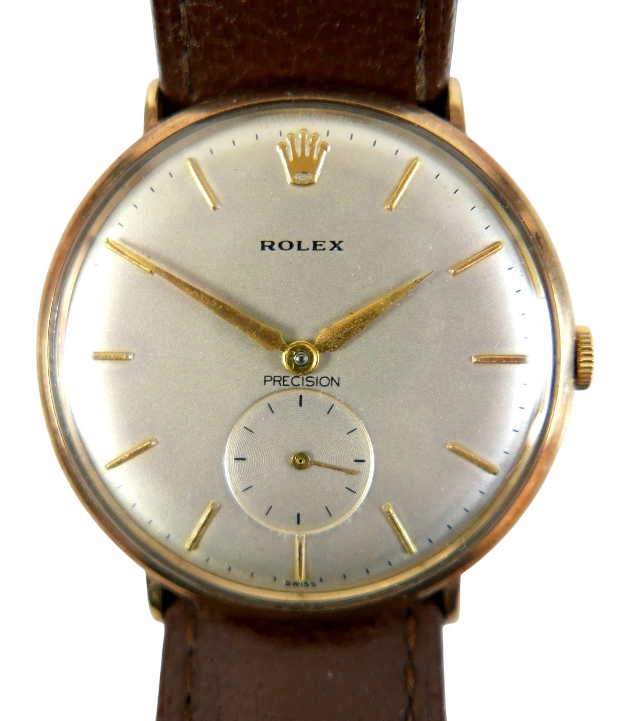 A Rolex Precision 9ct gold cased gentleman's wristwatch, model 12379, circular silvered dial, applied gilt batons, recessed subsidiary seconds dial, gilt dauphine hands, signed 17 jewels movement, cal. 1200, snap-off back marked Rolex 30071, Dennison, Birmingham 1989, numbered 333498, on Rolex brown leather strap with gold plated clasp, with green Rolex presentation box, but no paperwork.