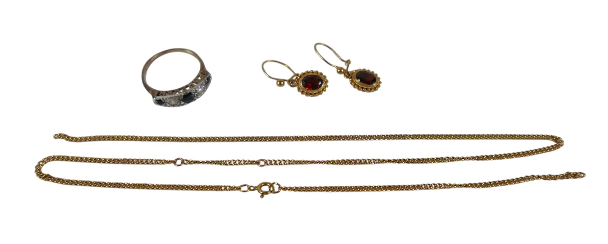 A gold and silver "Forever" ring a broken 9ct chain and a pair of 9ct earrings, total weight 8.5g, ring size R.(3)