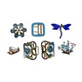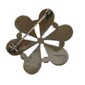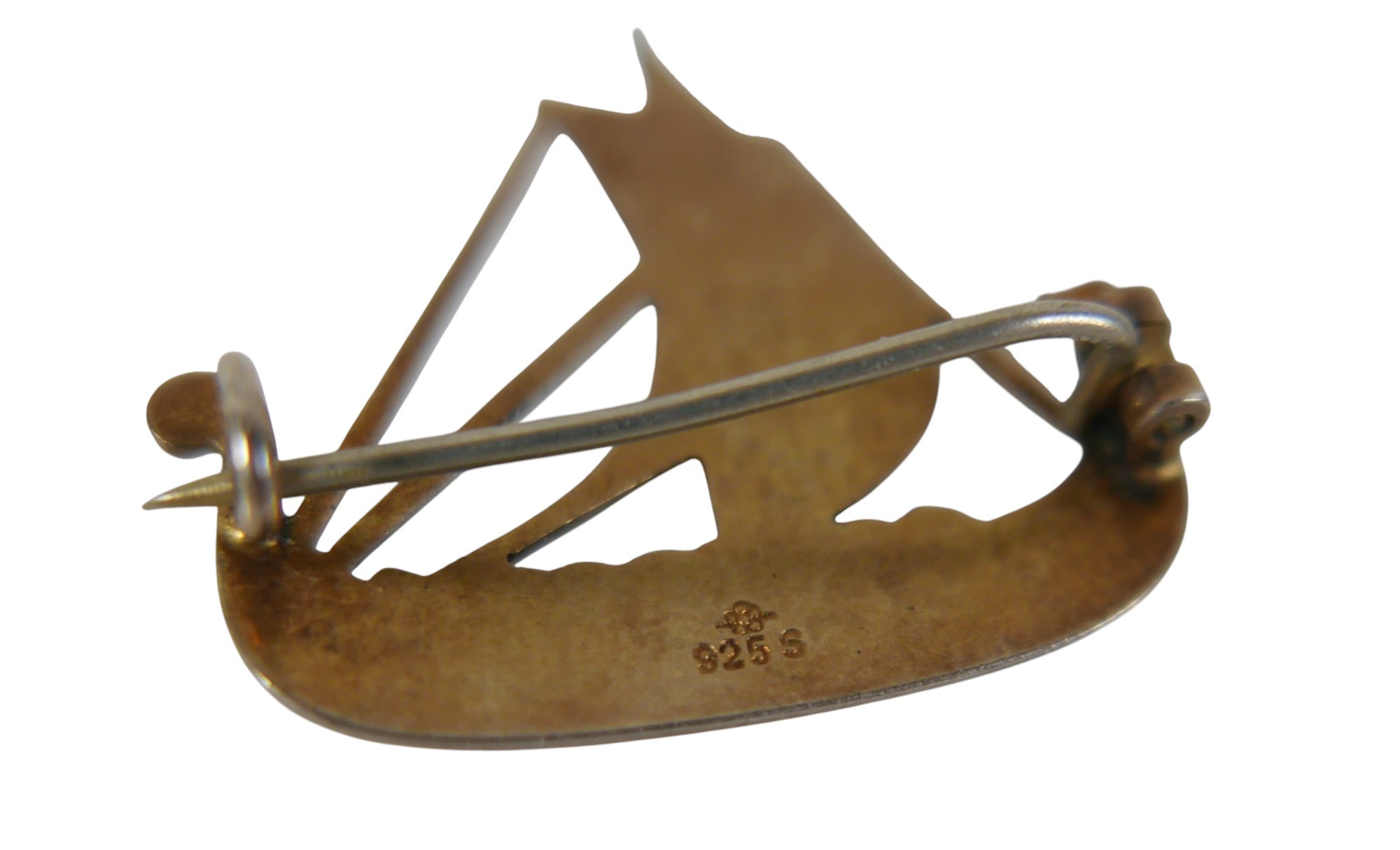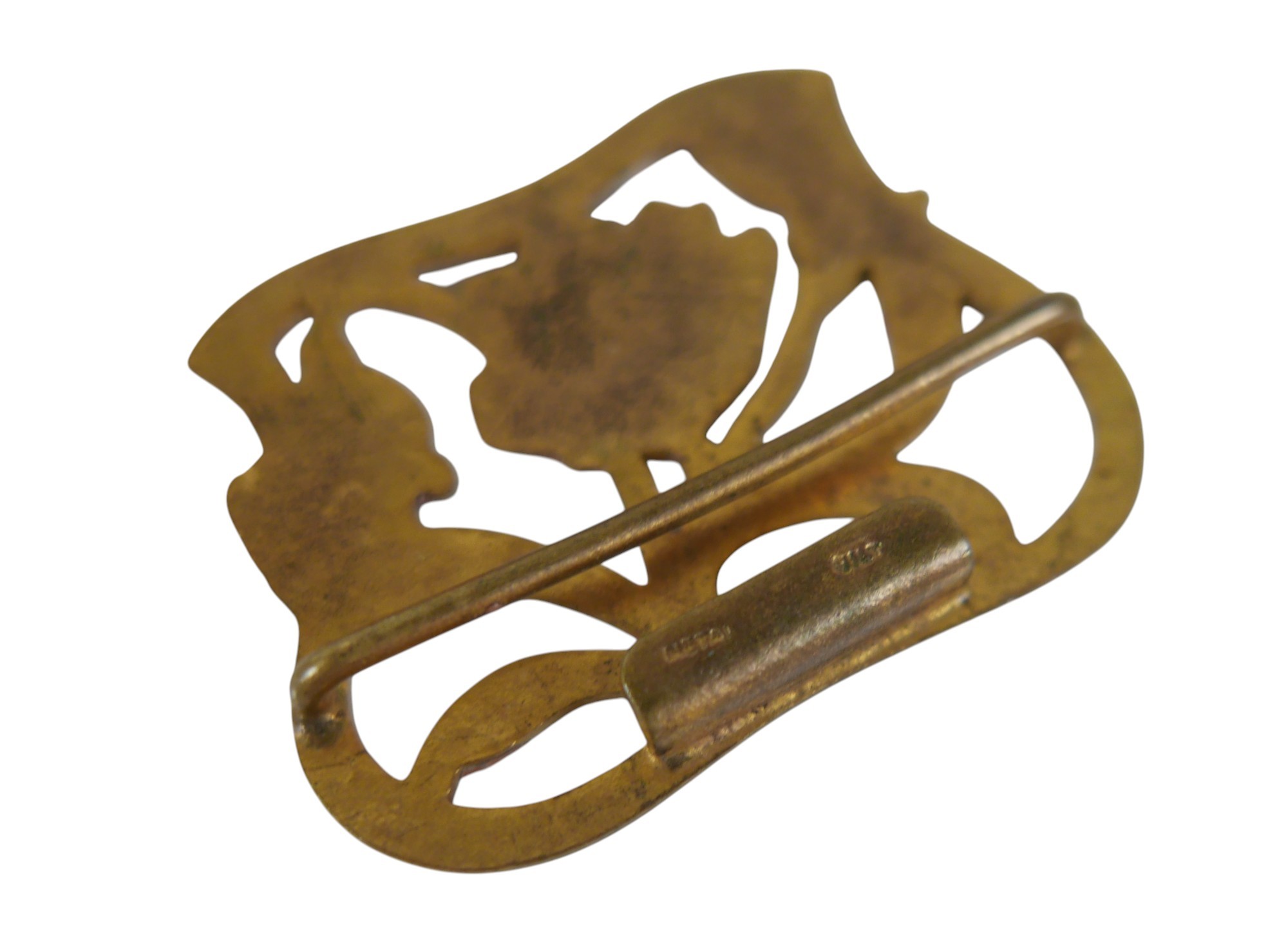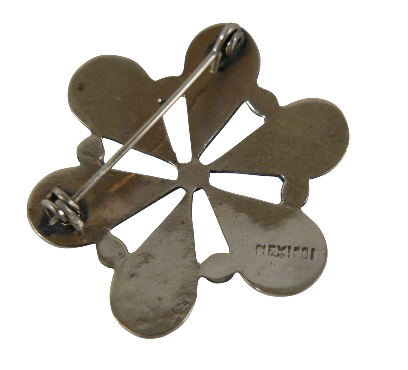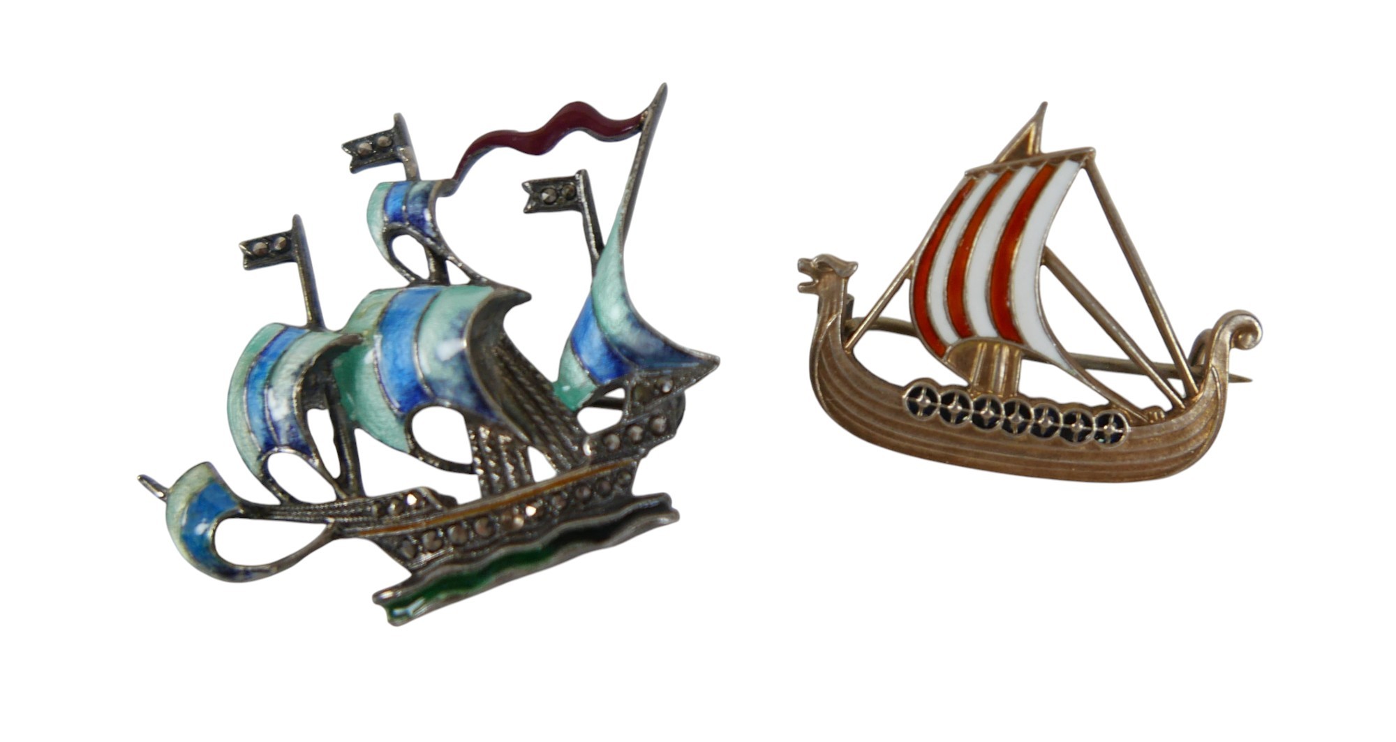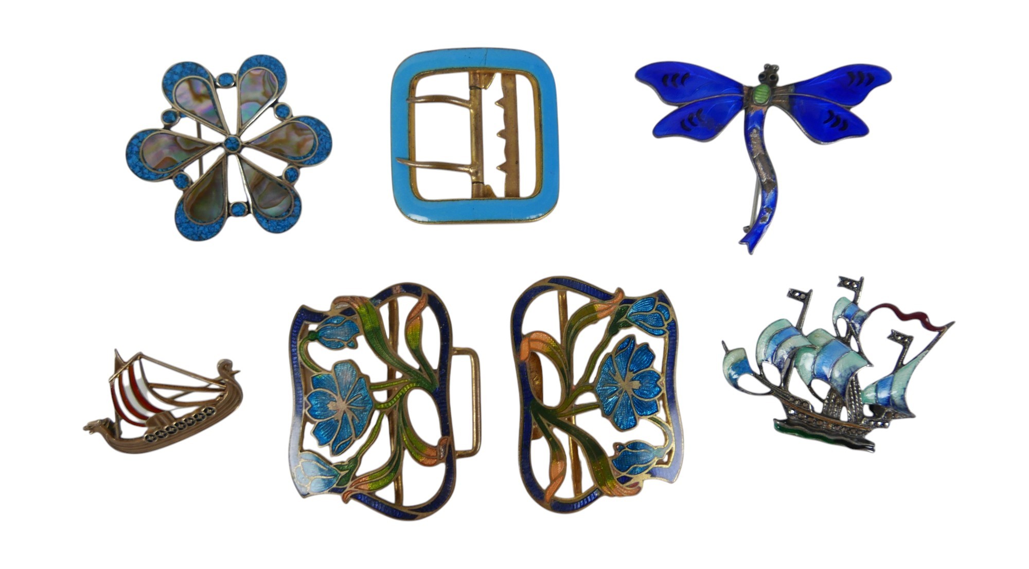 Six pieces of enamel jewellery comprising a nurses buckle, single buckle, two ship brooches, a silver dragonfly brooch and a Mexican mother of pearl and enamel brooch 4cm wide. (6)