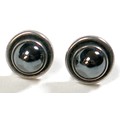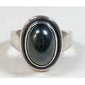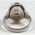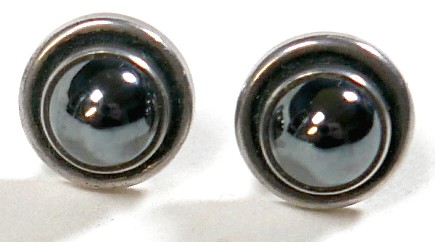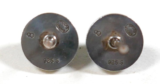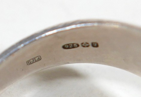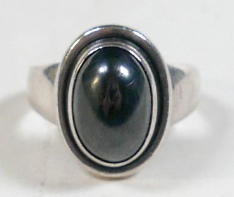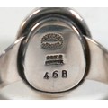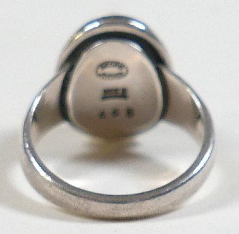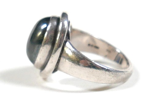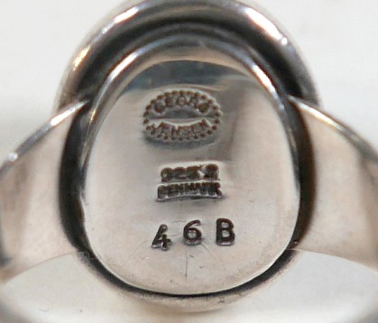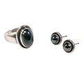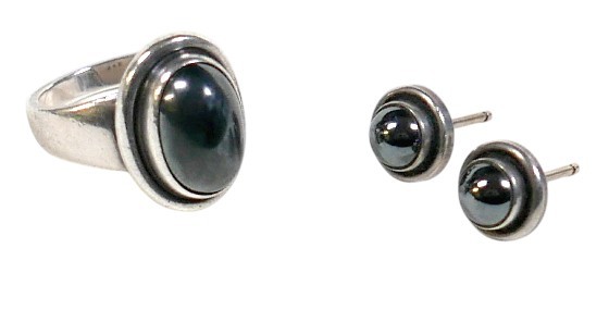 Georg Jensen - a pair of stud earrings and a ring designed by Harald Nielsen; the circular stud earrings of cabochon form, with ear post, No. 8, stamped as 925, 9.3mm x 9.3mm; the ring of oval cabochon design, set with a concentric border, stamped No. 46B and 925 to the reverse, ring head measures 167mm x 29mm, size L; Gross weight 9.9g.(3)