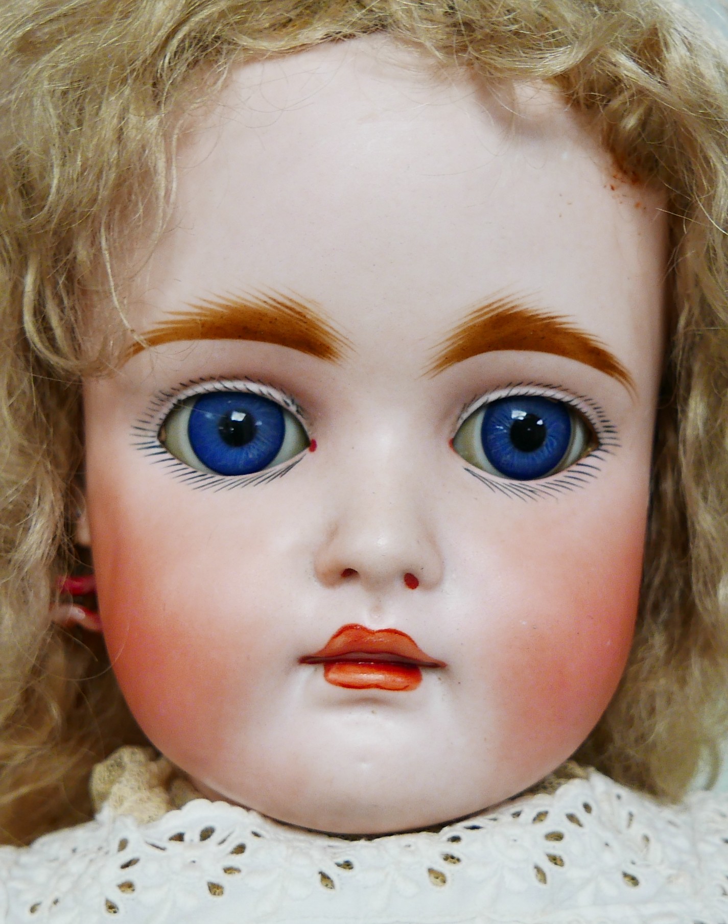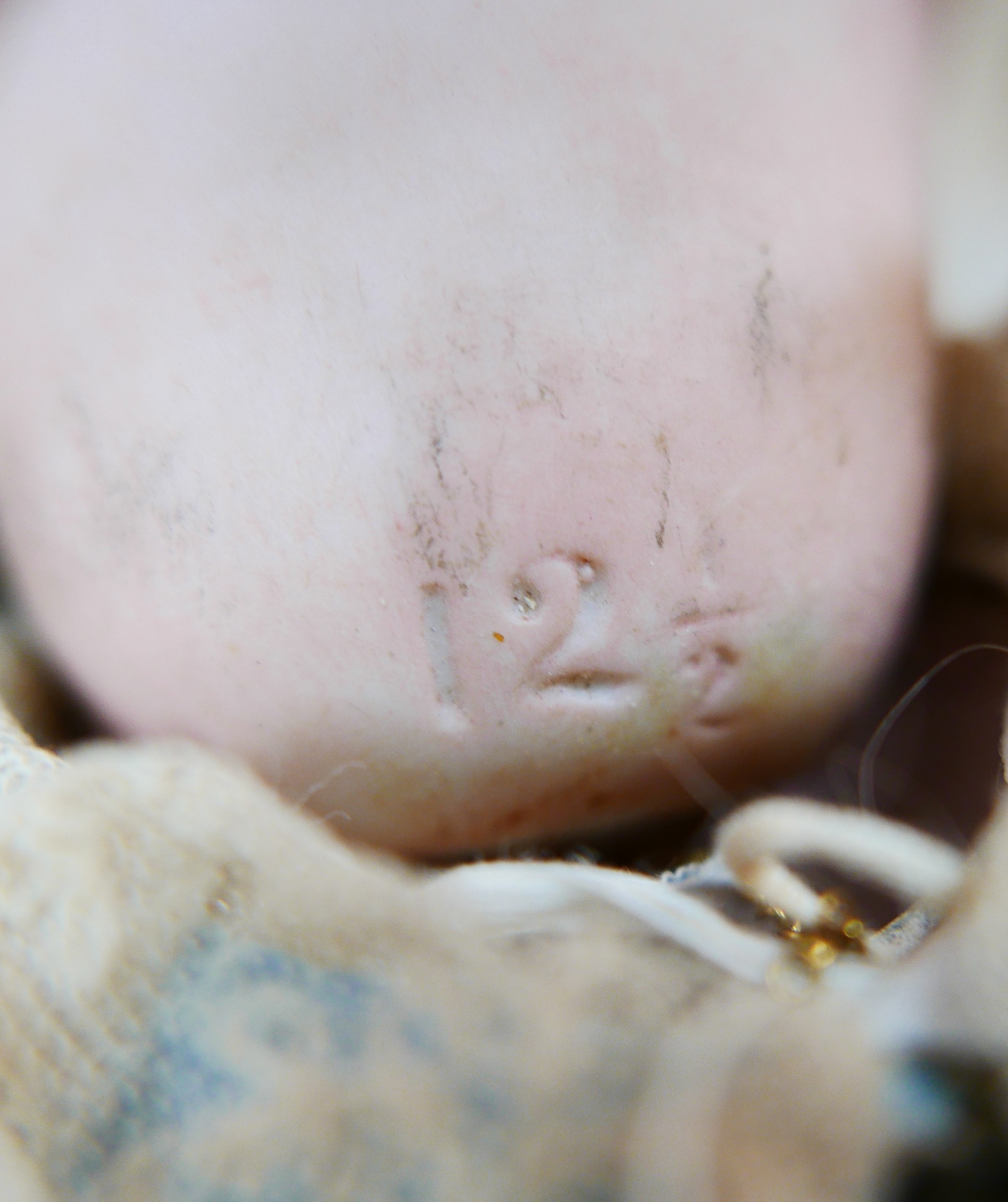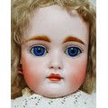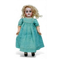A late 19th century/early 20th century continental bisque headed doll, with sleepy eyes, hand painted eye lashes, eye brows and lips, closed mouth, impressed marks to the back of its neck '12 1/2', 19 1/4" (49cm) high.