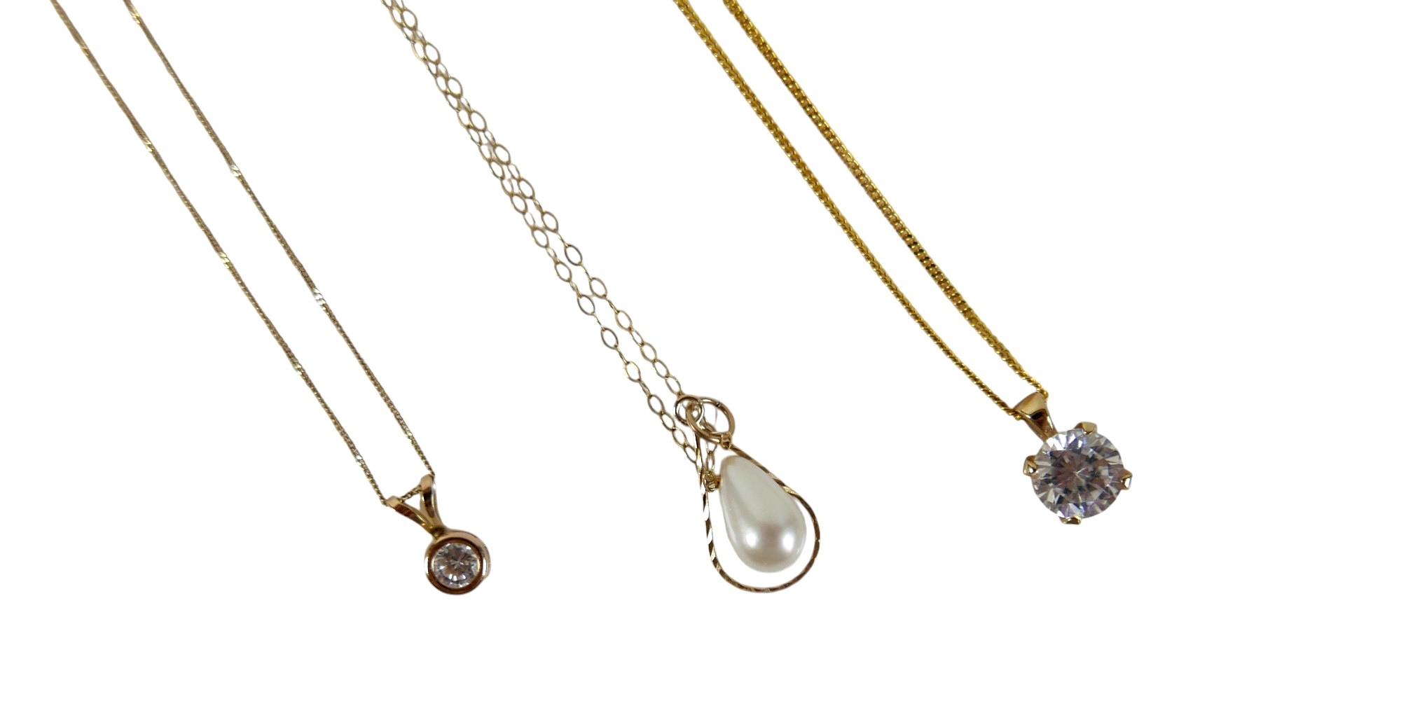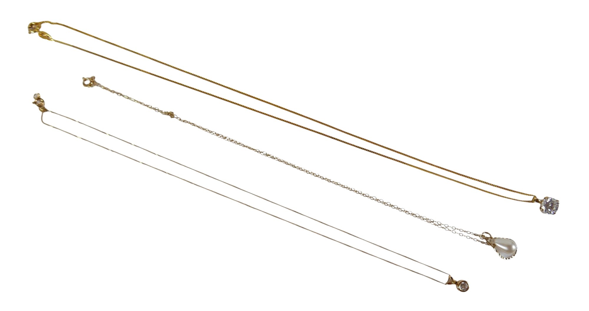 Three 9ct gold chain necklaces, two with white stone pendants, another with a pearl pendant, 3.6g gross. (1 bag)
