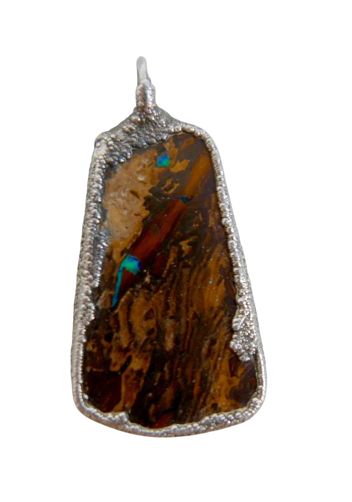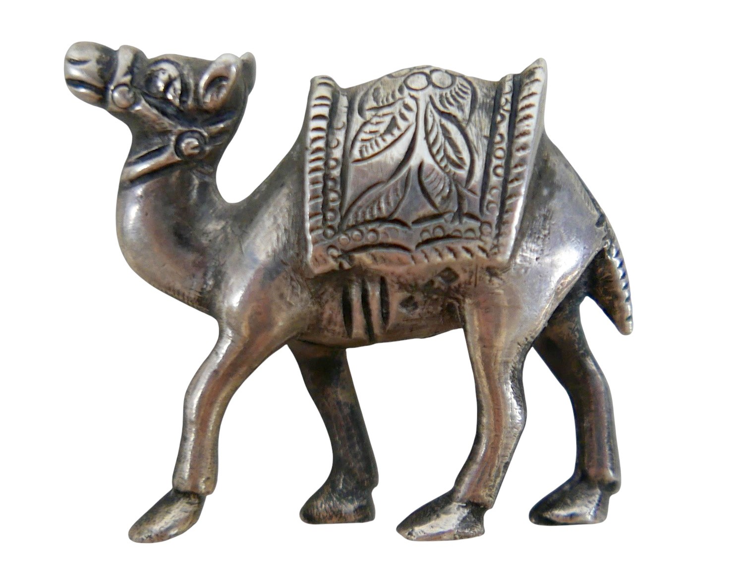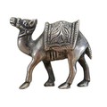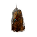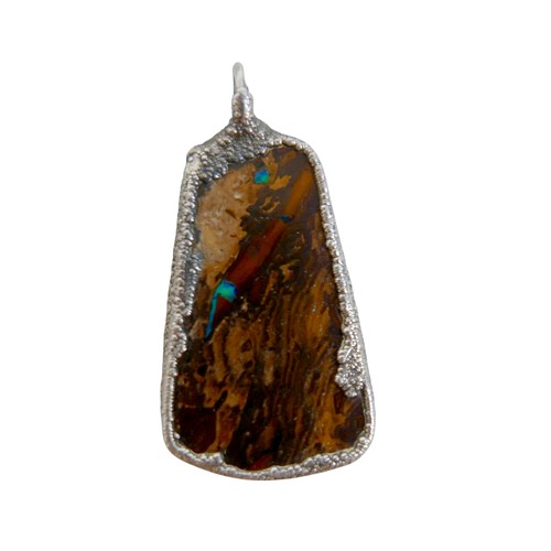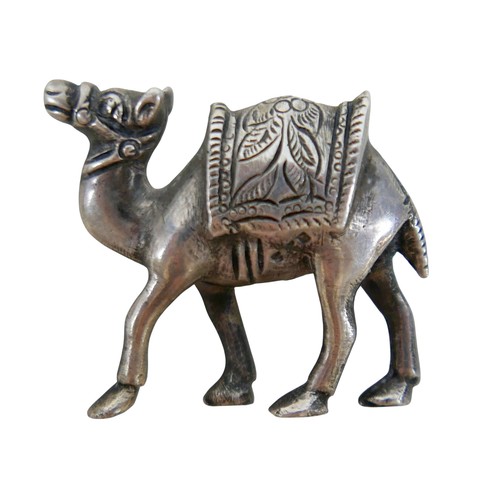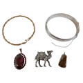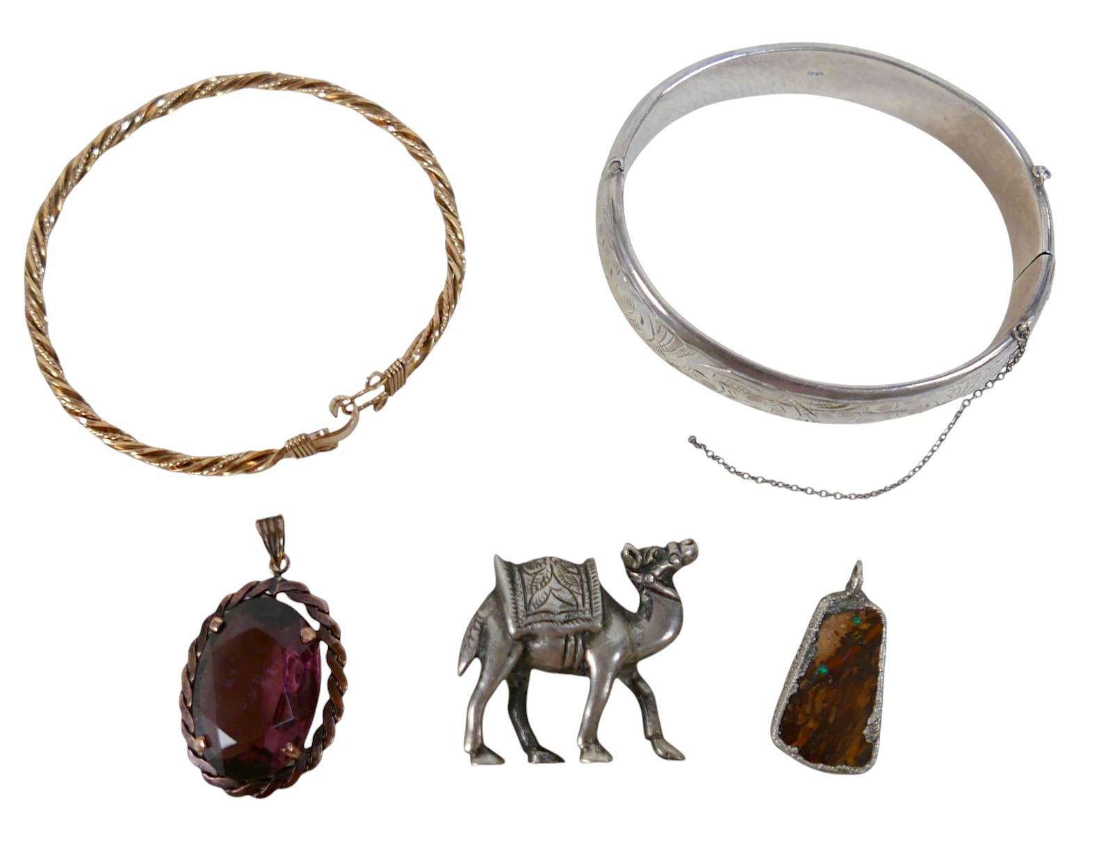 A small group of jewellery, comprising a silver hinged bangle, 15mm wide, 64 by 54mm internal, 25.7g, a silver ornament modelled as a dromedary, 32mm long, 23.0g, a silver pendant set with a colourful brown, green and blue speckled agate, 31mm high, and a yellow metal pendant set with an oval cut purple stone, 40mm high. (4)
