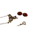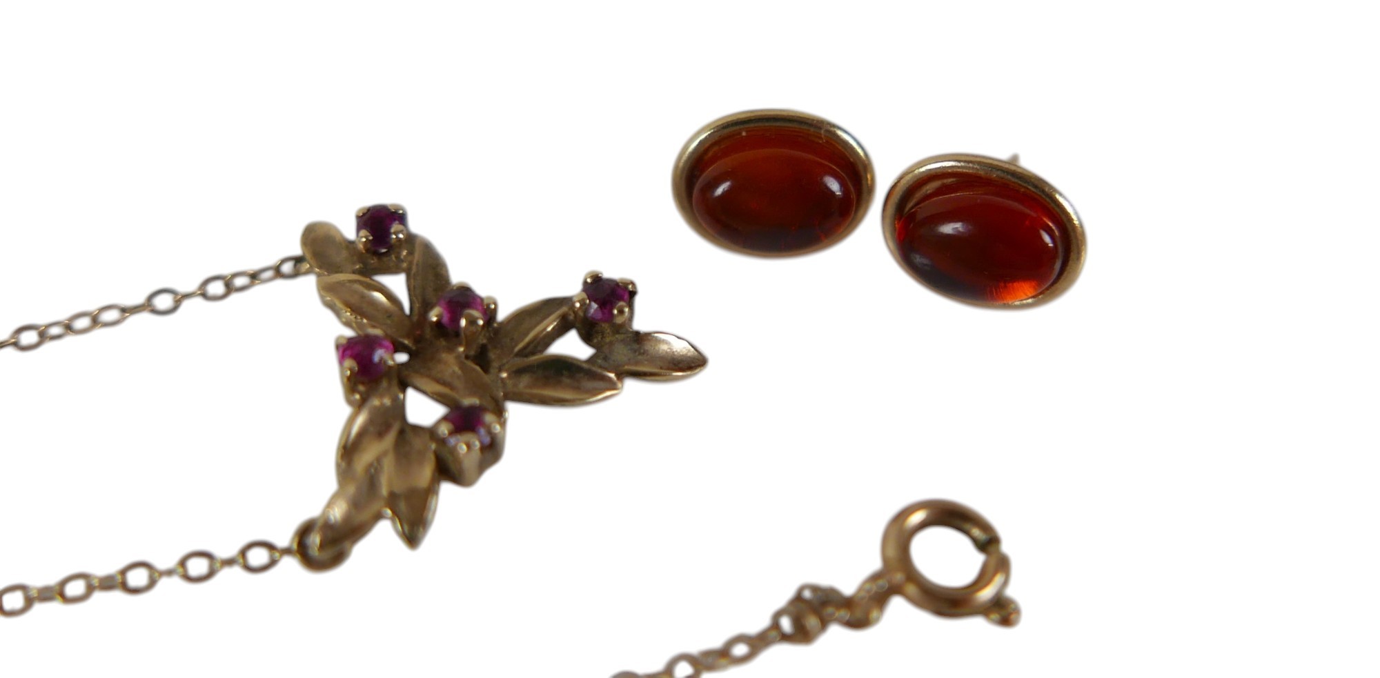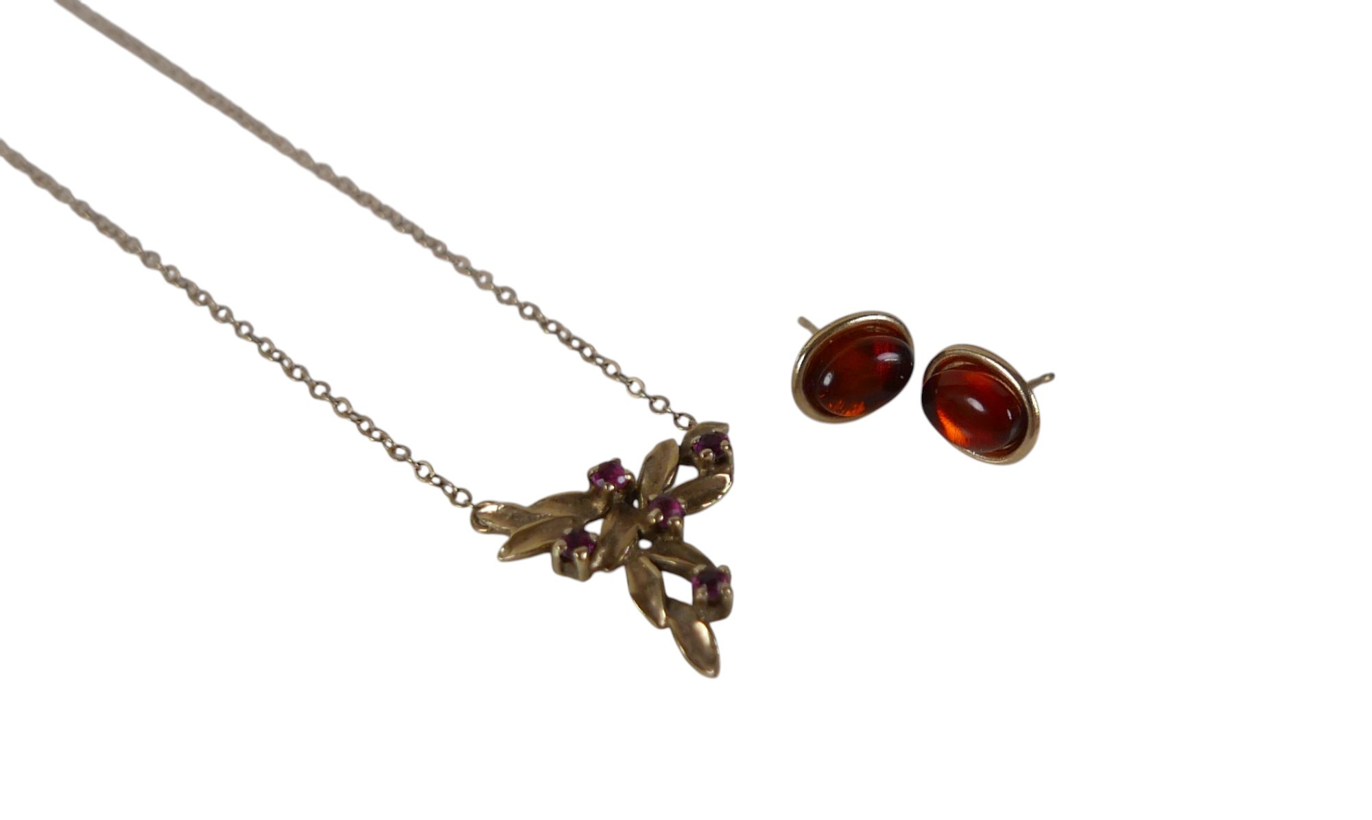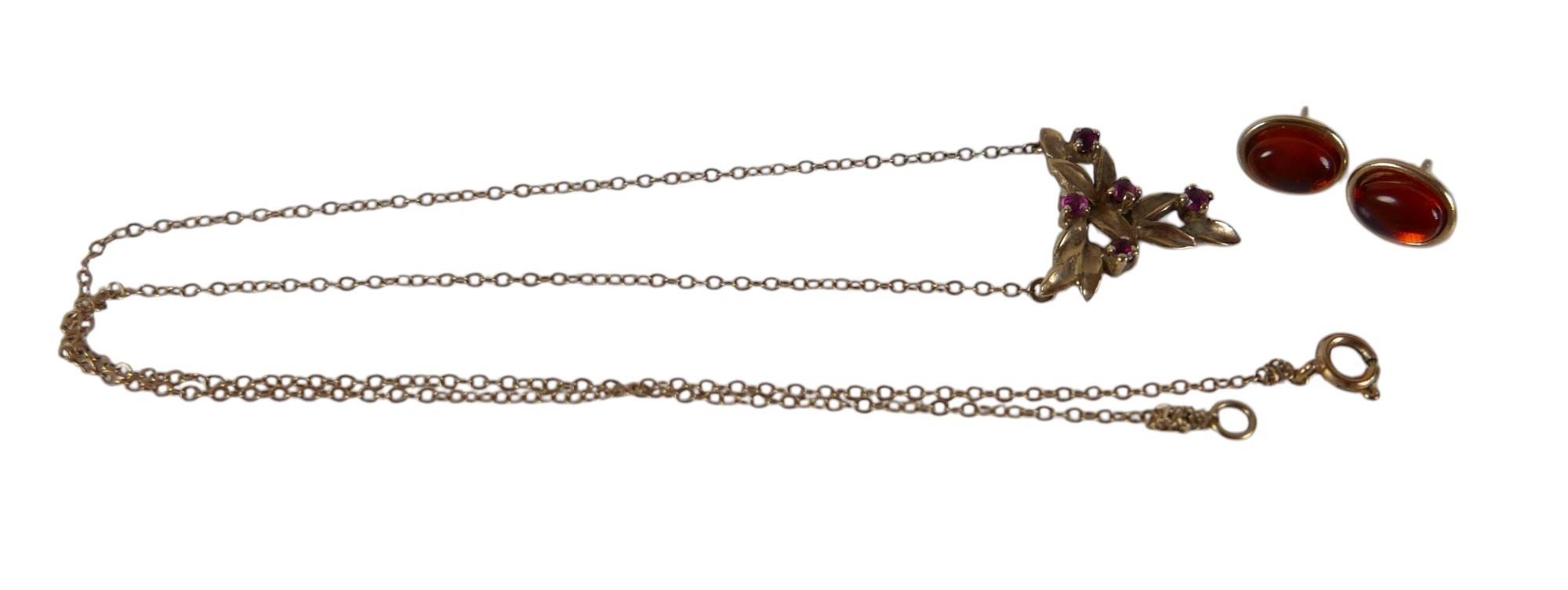 A 9ct yellow gold ruby necklace and a pair of 9ct earrings the necklace head of foliate form 16 x 15mm, total weight 2.5g.(2)
