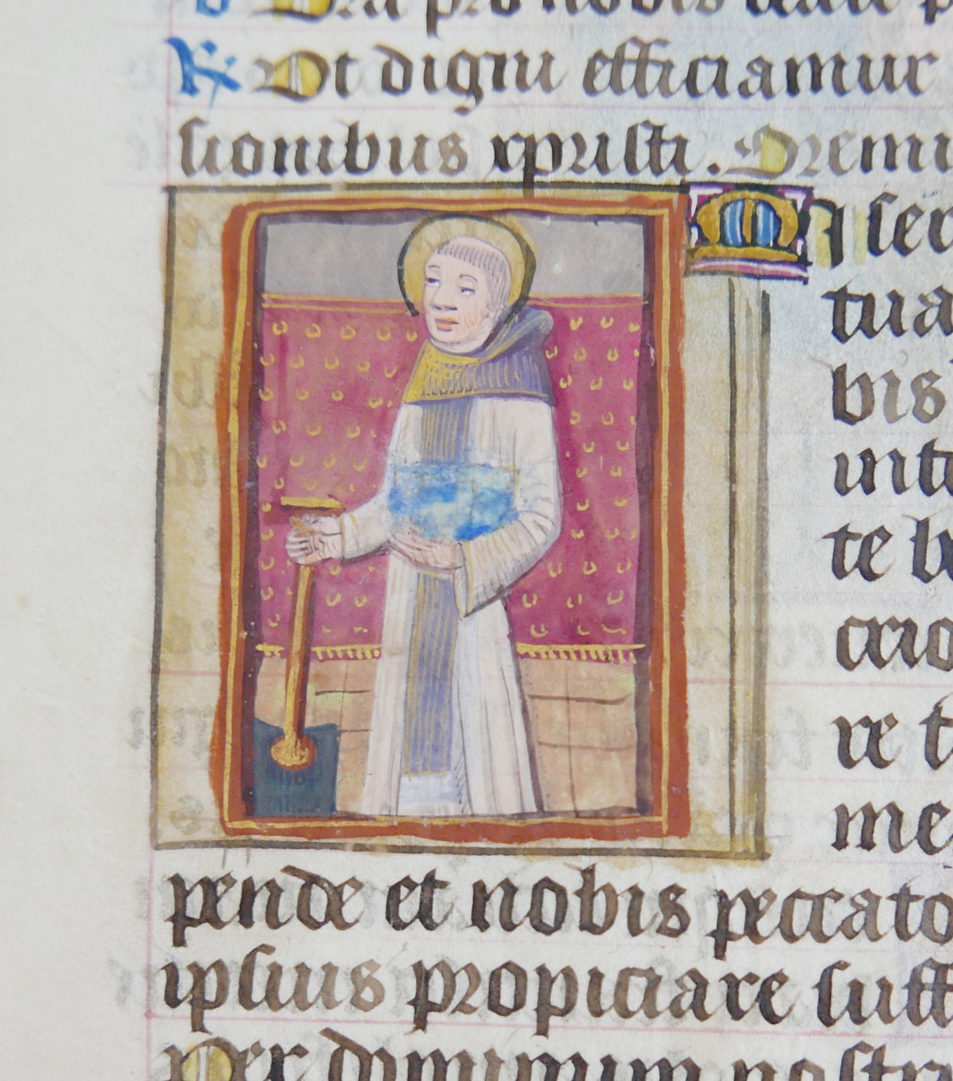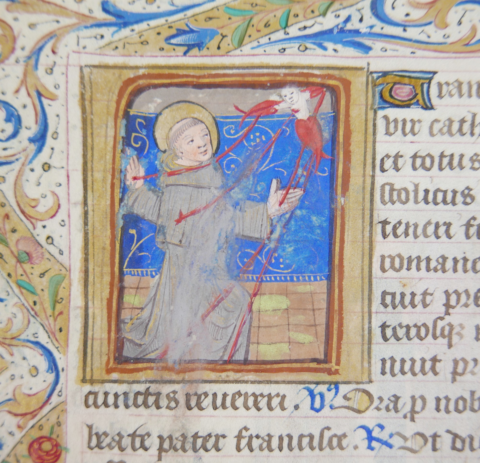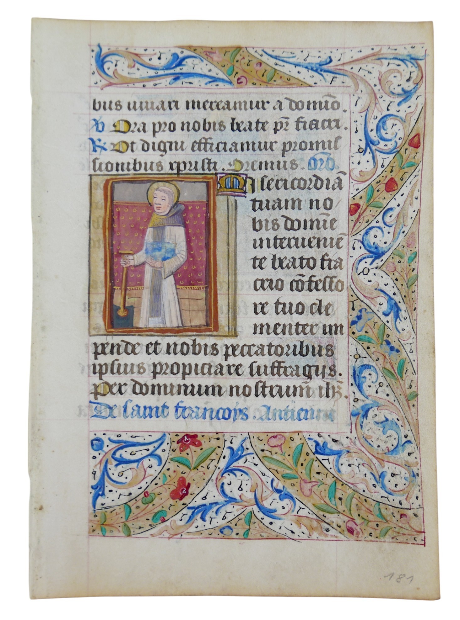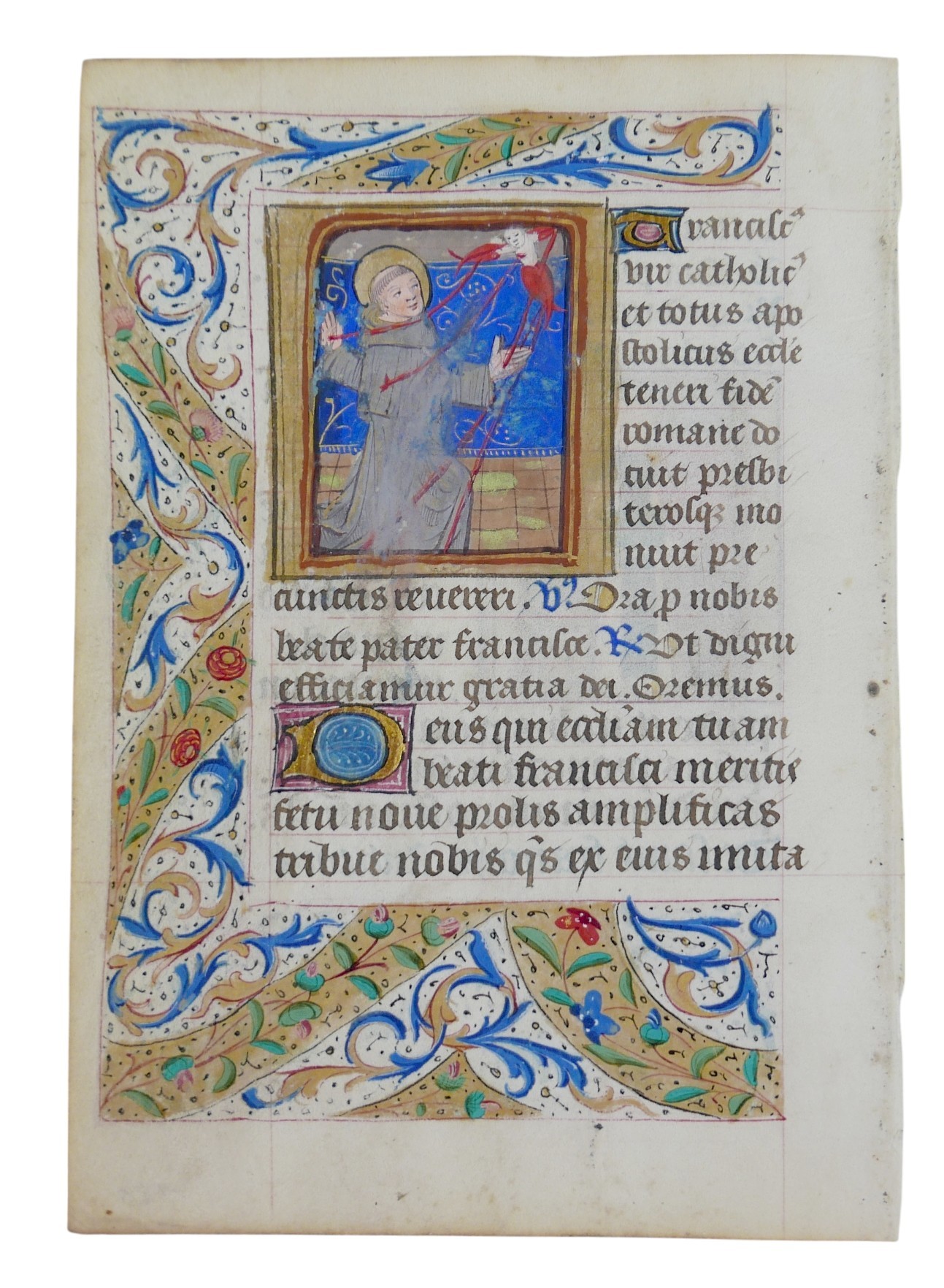 A late 15th century French illuminated manuscript vellum leaf, with quarter page miniatures of St Fiacre and St Francis of Assisi, from a northern French Book of Hours in Latin, miniatures 5 by 5cm, leaf overall 17.5 by 14.5cm.
