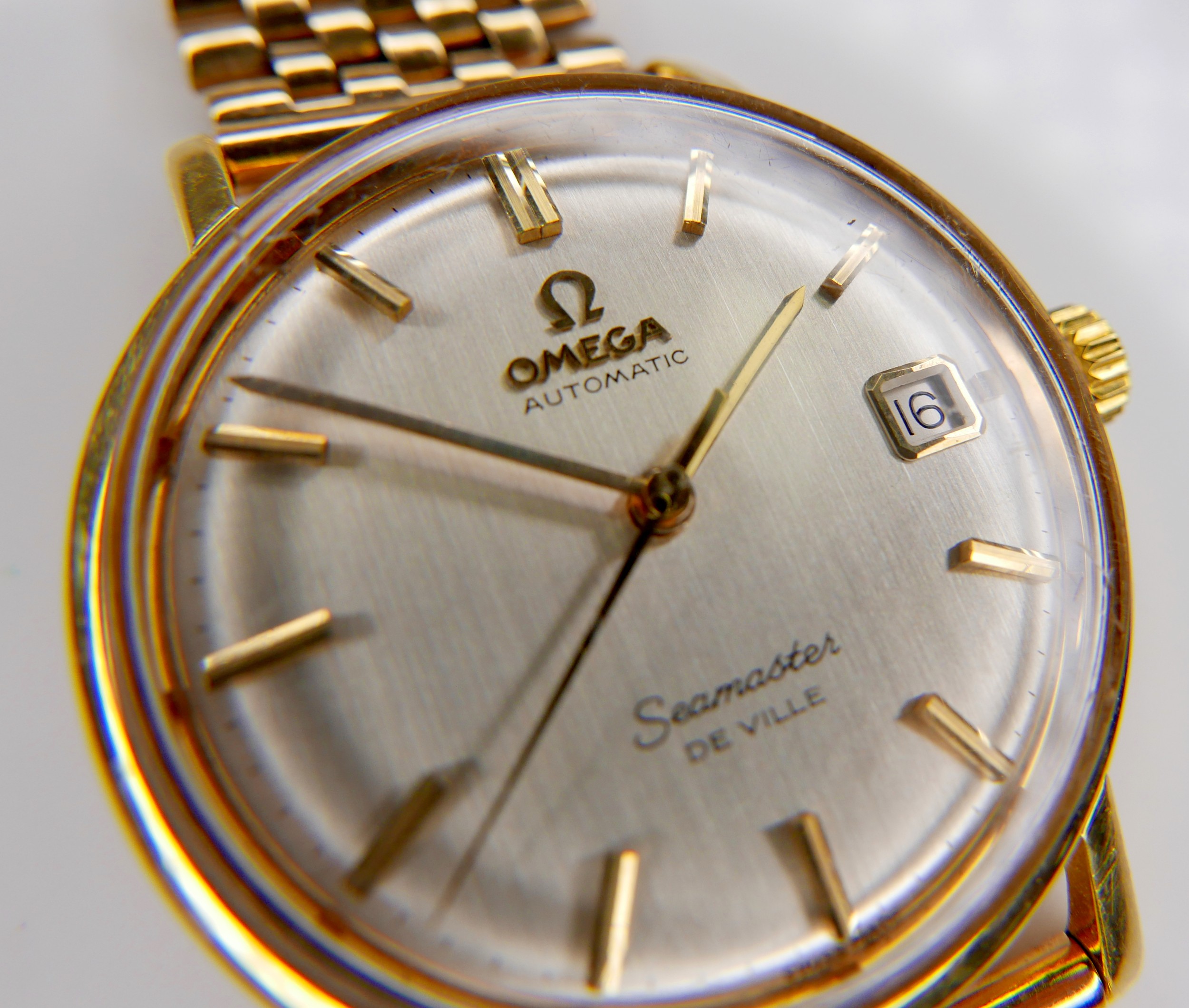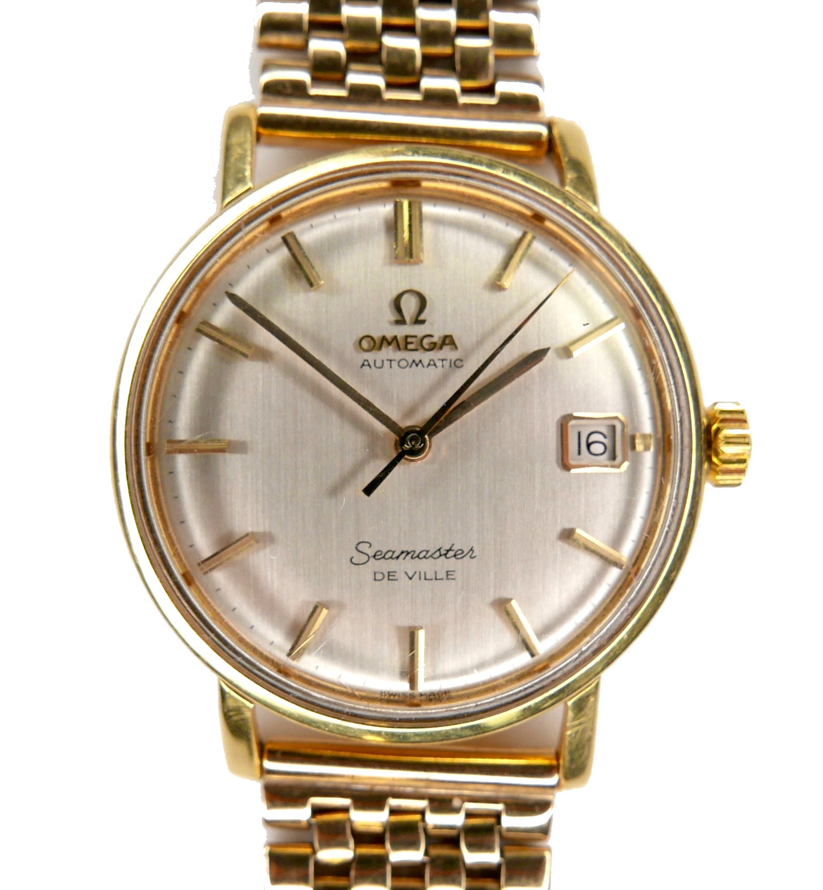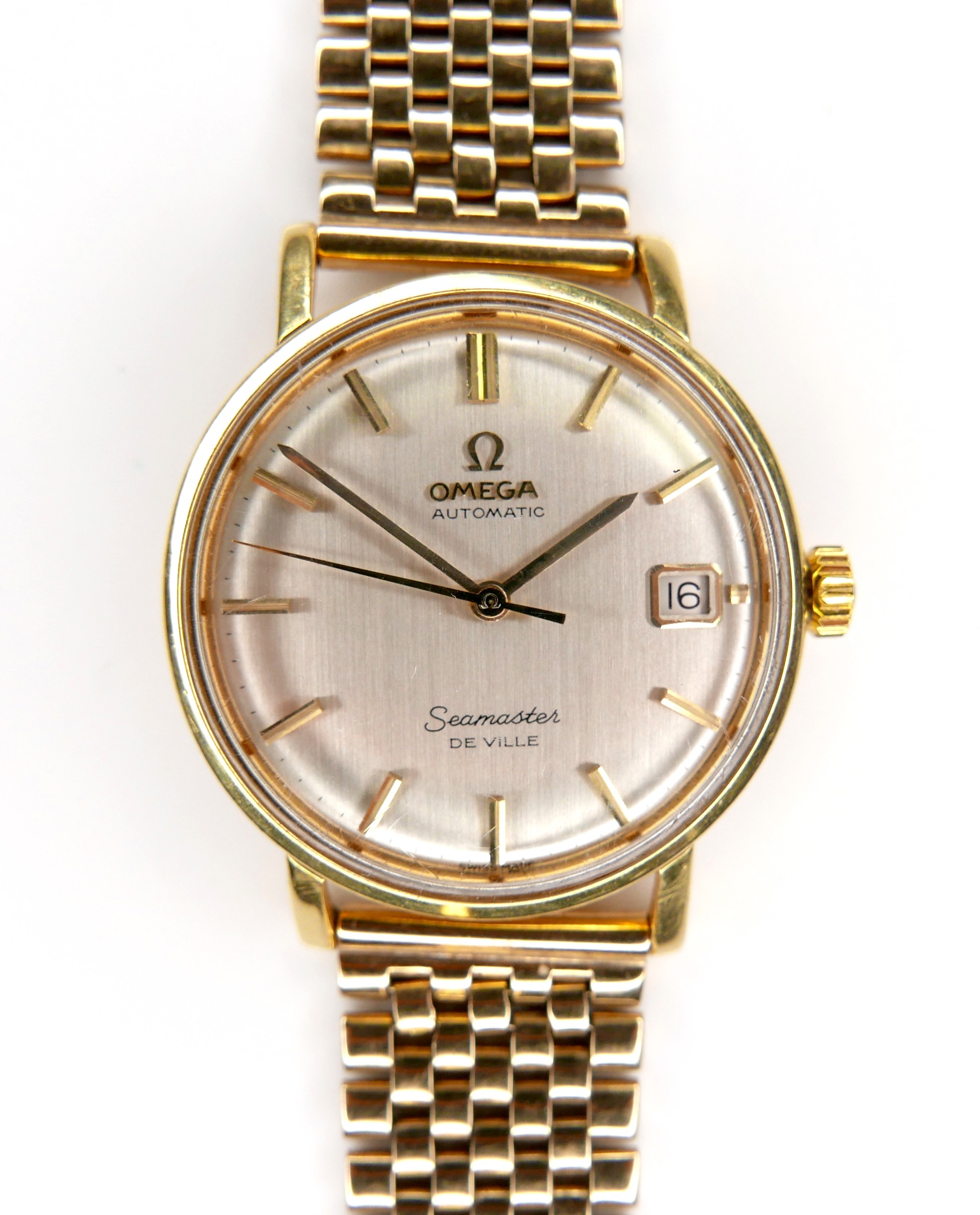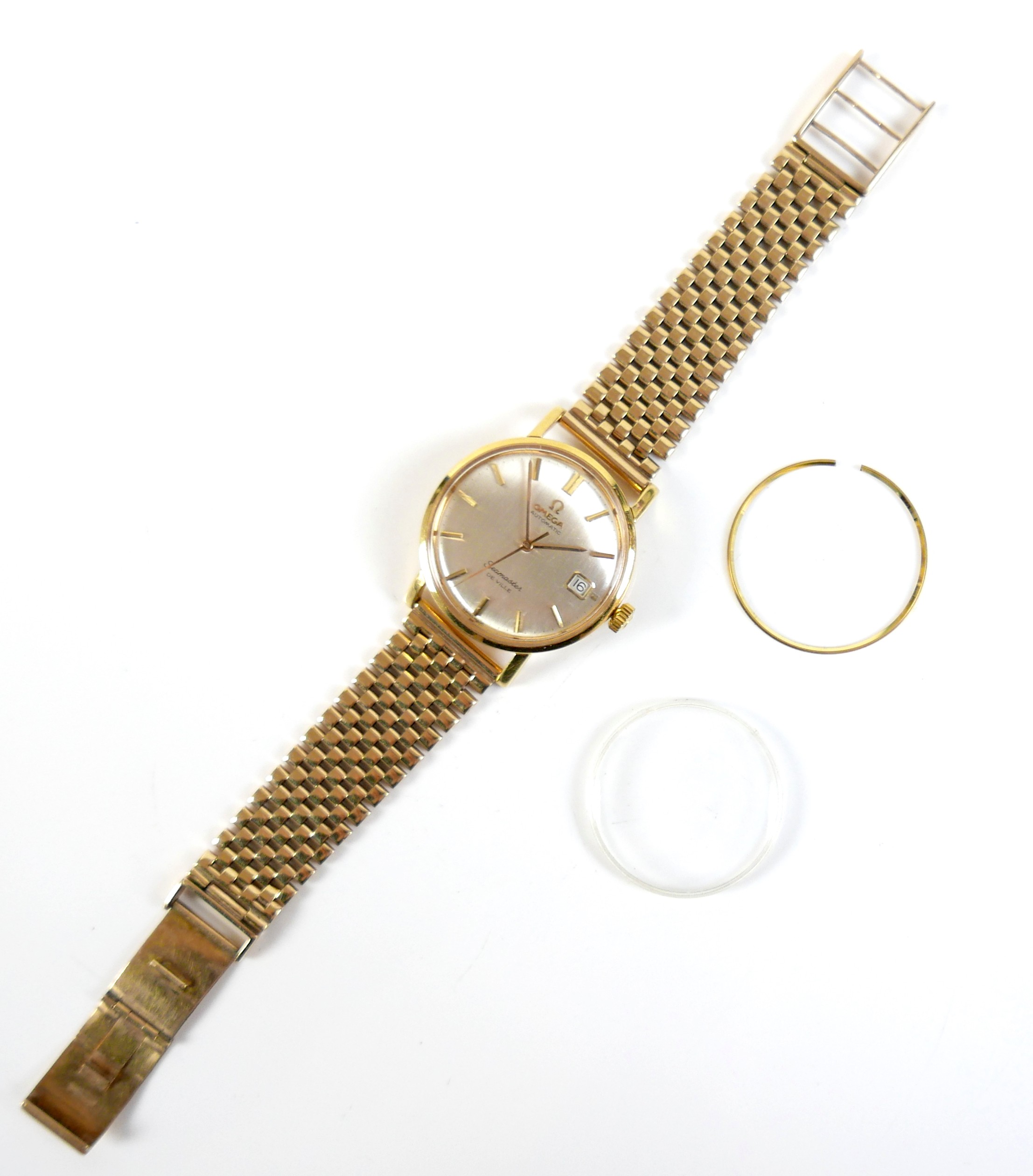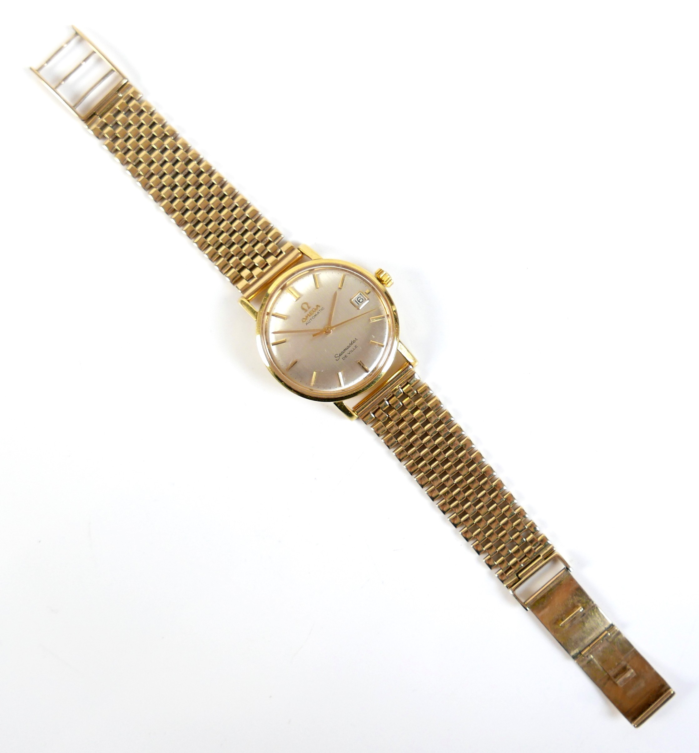 An Omega Automatic Seamaster De Ville 9ct yellow gold gentleman's wristwatch, circa 1960s, circular silvered dial, raised gilt batons and black minute markers, gilt hands, centre seconds hand, with Seamaster 'Seahorse' insignia relief to case back, on a 9ct gold bracelet strap with deployment clasp, JG&S, Birmingham 1966, case 34mm, 67.1g, gross, with a spare glass.