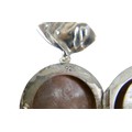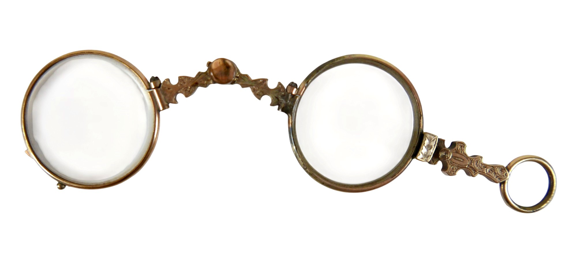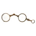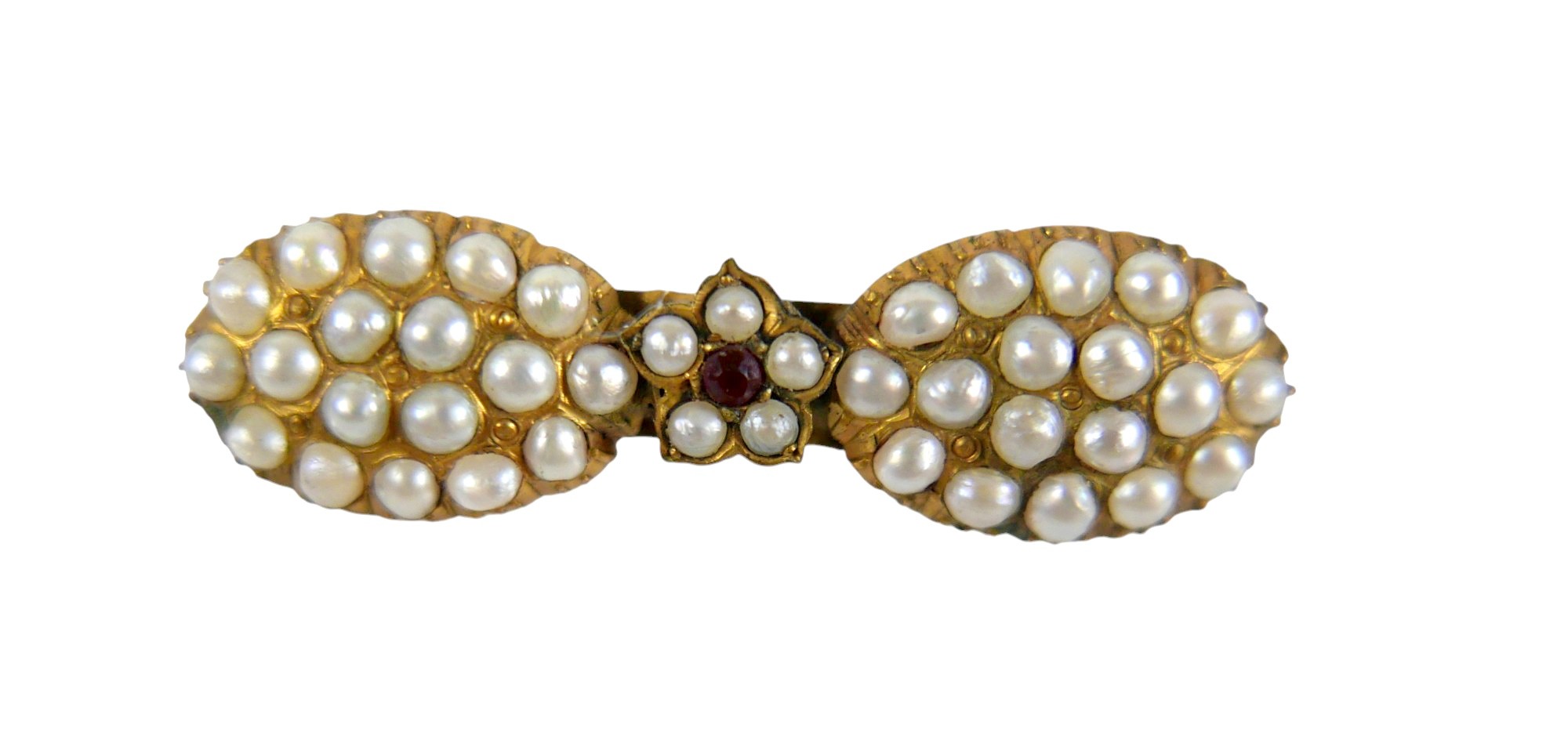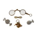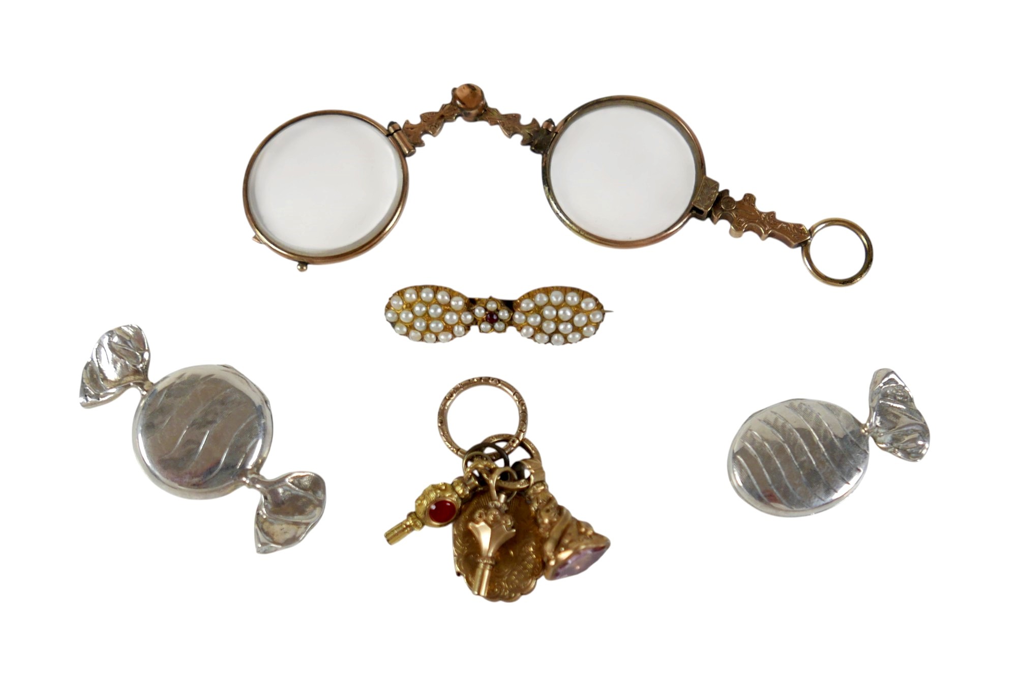A group of jewellery, comprising a yellow metal / gilt metal small seal fob, 22mm, set with a pink stone, on a fitted keyring with two yellow metal small watch keys, and oval locket, 13.2g gross, two novelty silver sweet shaped cases, a/f one damaged, 53mm long, 16.1g, a gilt metal brooch set with seed pearls, and a pair of early 19th century yellow metal folding lorgnettes. (5)