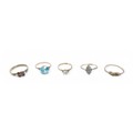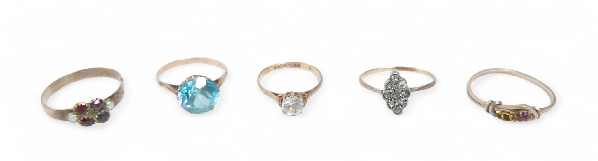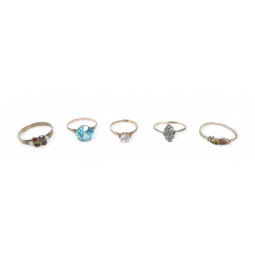 A group of rings comprising a 9ct yellow gold dress ring size K, 1.2g, a gilt dress ring size P, 2.5g and three other rings.(5)